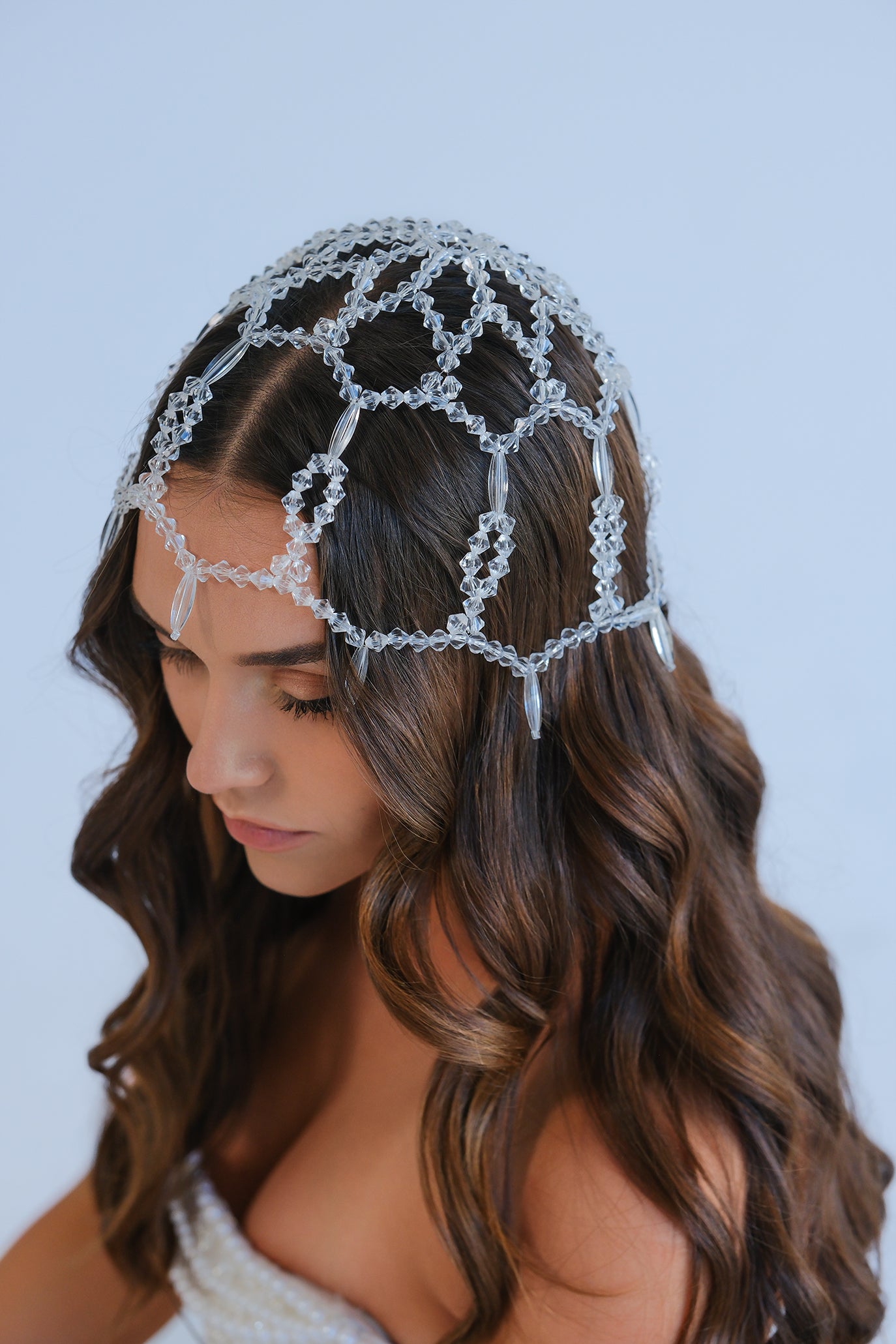 Потопете се в елегантността с нашият ръчно изработен аксесоар от мъниста. Има обемен дизайн и прецизна плетка, носи са като шапка и обгръща главата по уникален начин. Мънистата са нанизани върху прозрачна, еластична основа, която осигурява стабилност, без да създава усещане за стягане. Моделът е лимитиран и се предлага в един универсален размер.