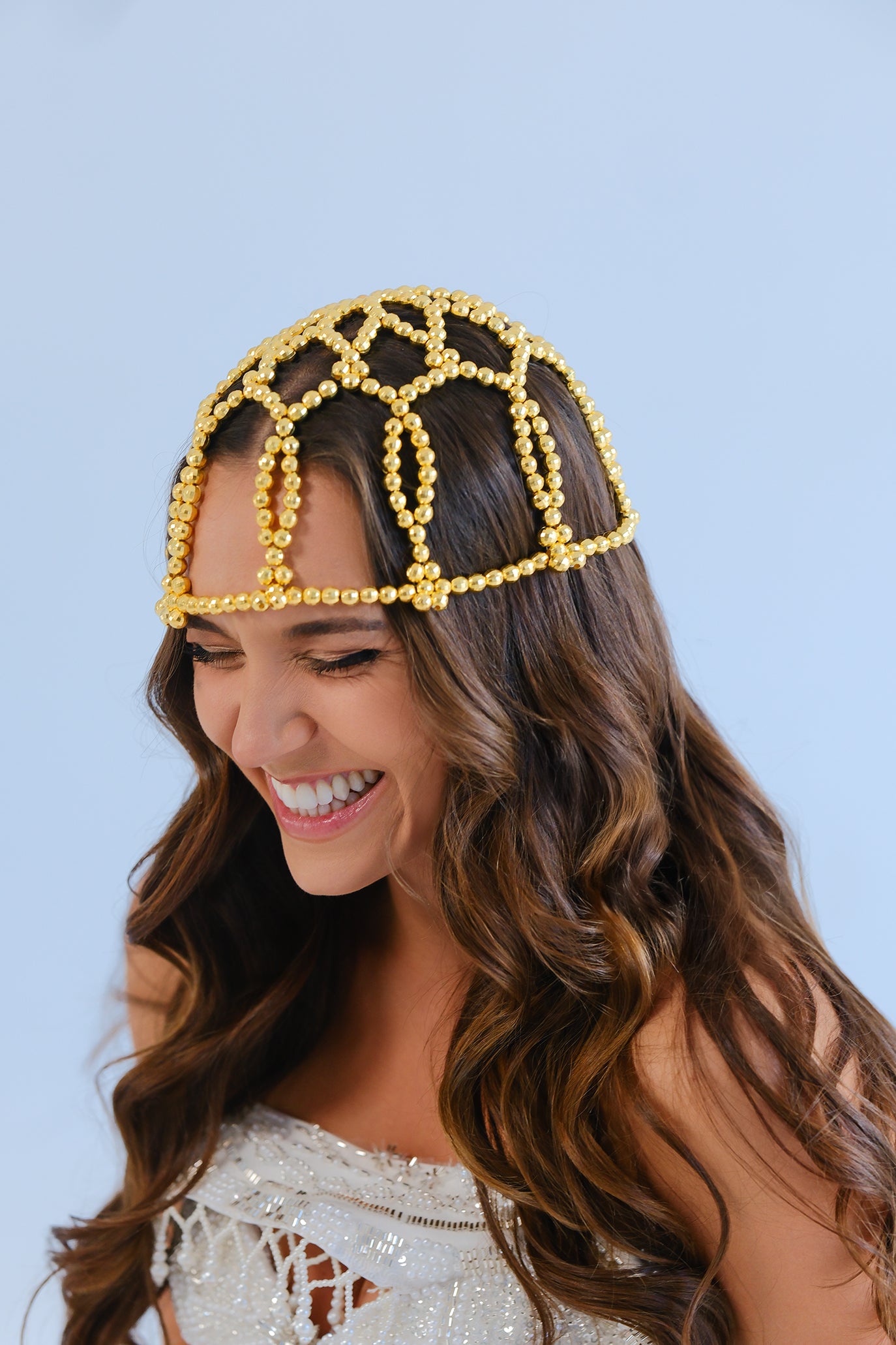 Потопете се в елегантността с нашият ръчно изработен аксесоар от мъниста. Има обемен дизайн и прецизна плетка, носи са като шапка и обгръща главата по уникален начин. Мънистата са нанизани върху прозрачна, еластична основа, която осигурява стабилност, без да създава усещане за стягане. Моделът е лимитиран и се предлага в един универсален размер.