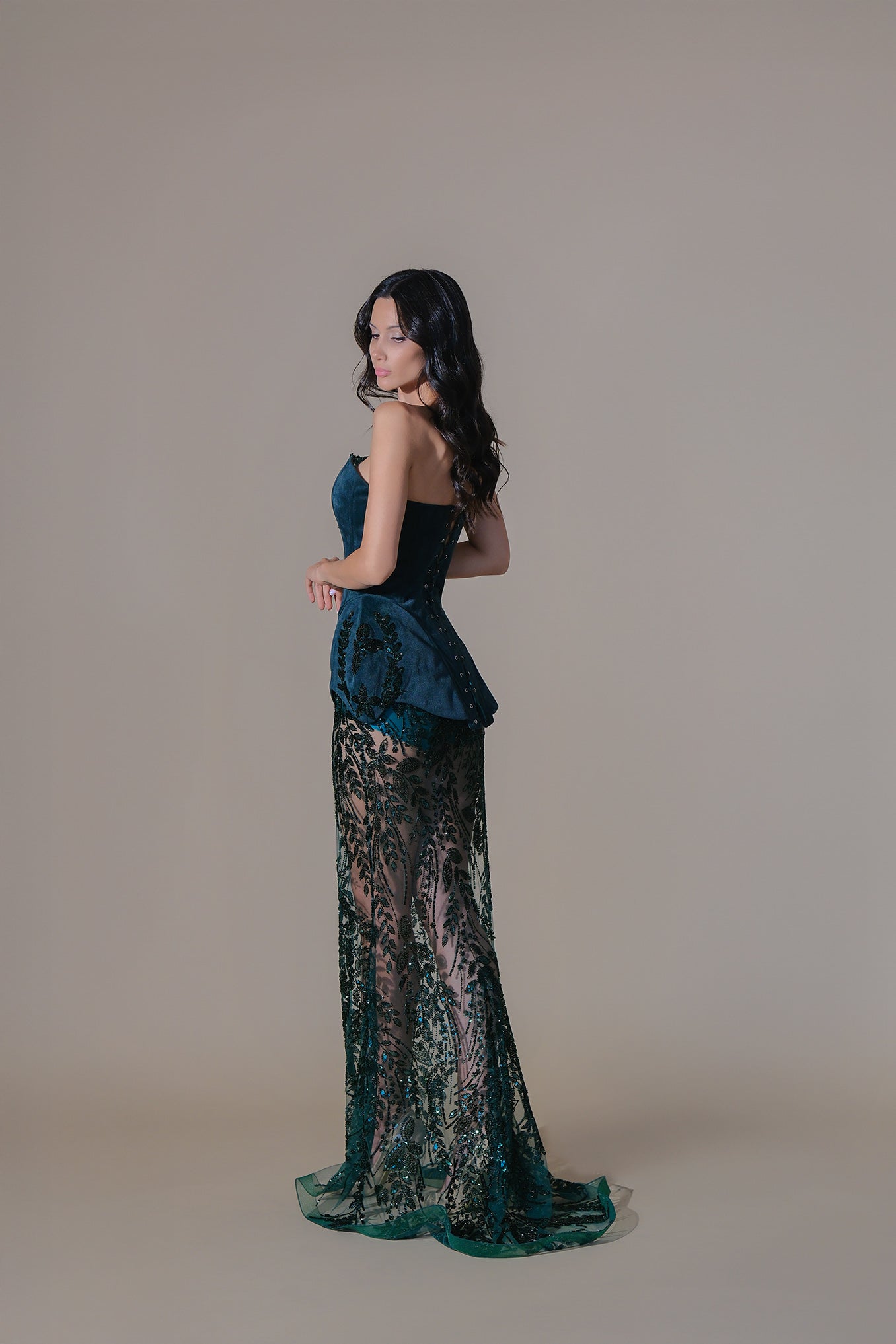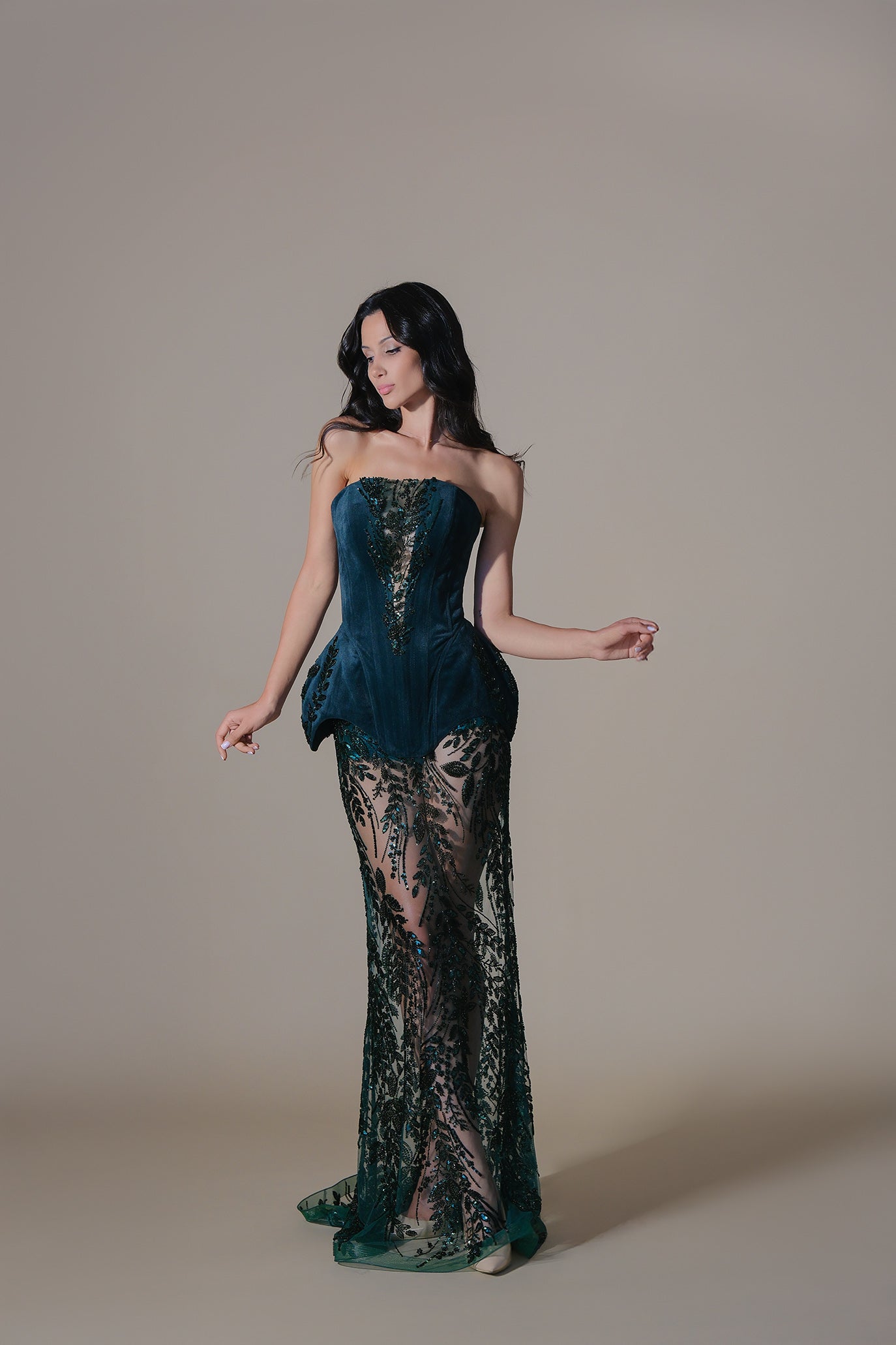 Впечатляваща вечерна рокля, изцяло ръчно изработена. Горната част е тип корсет от кадифе с твърда структура, нестандартна издължена форма и връзки на гърба, които осигуряват перфектно прилягане към тялото. Долната част е оформена в свободна пола от блестящ полупрозрачен плат, създаващ ефект на движение и блясък. Роклята подчертава силуета и добавя доза изтънчена елегантност. Ексклузивен модел.