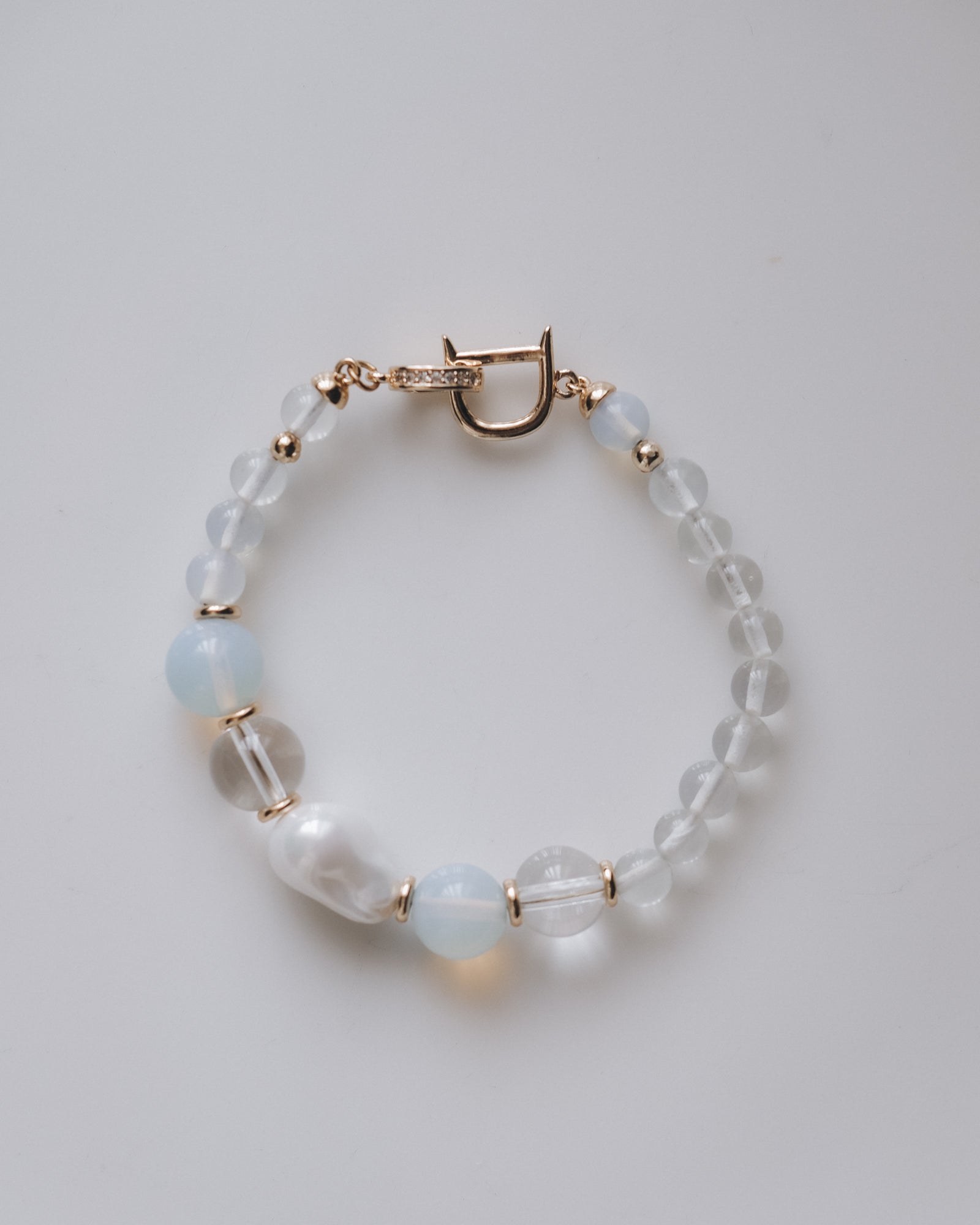 Елегантна гривна, изработена от полупрозрачни мъниста в млечно бял и нежен светлосин нюанс, допълнени със златисти метални акценти. Дизайнът съчетава различни форми и текстури, които придават фин релеф. Декоративната закопчалка превръща гривната в деликатен акцент към всяка визия.