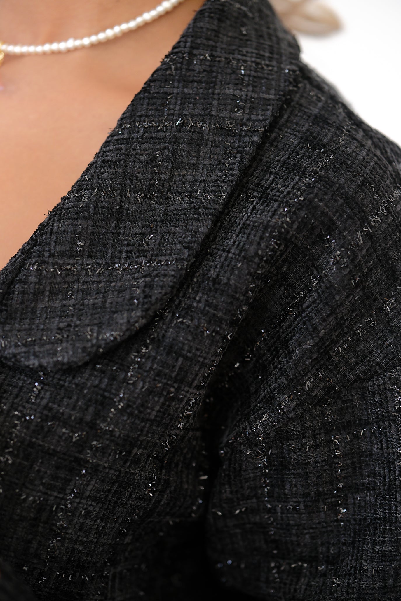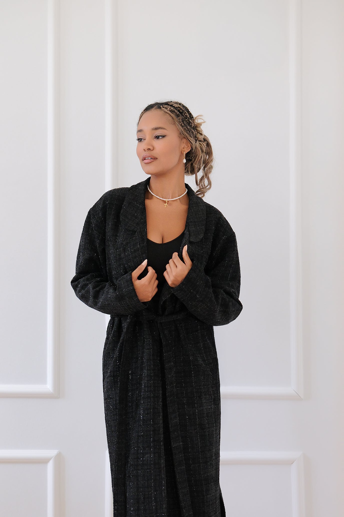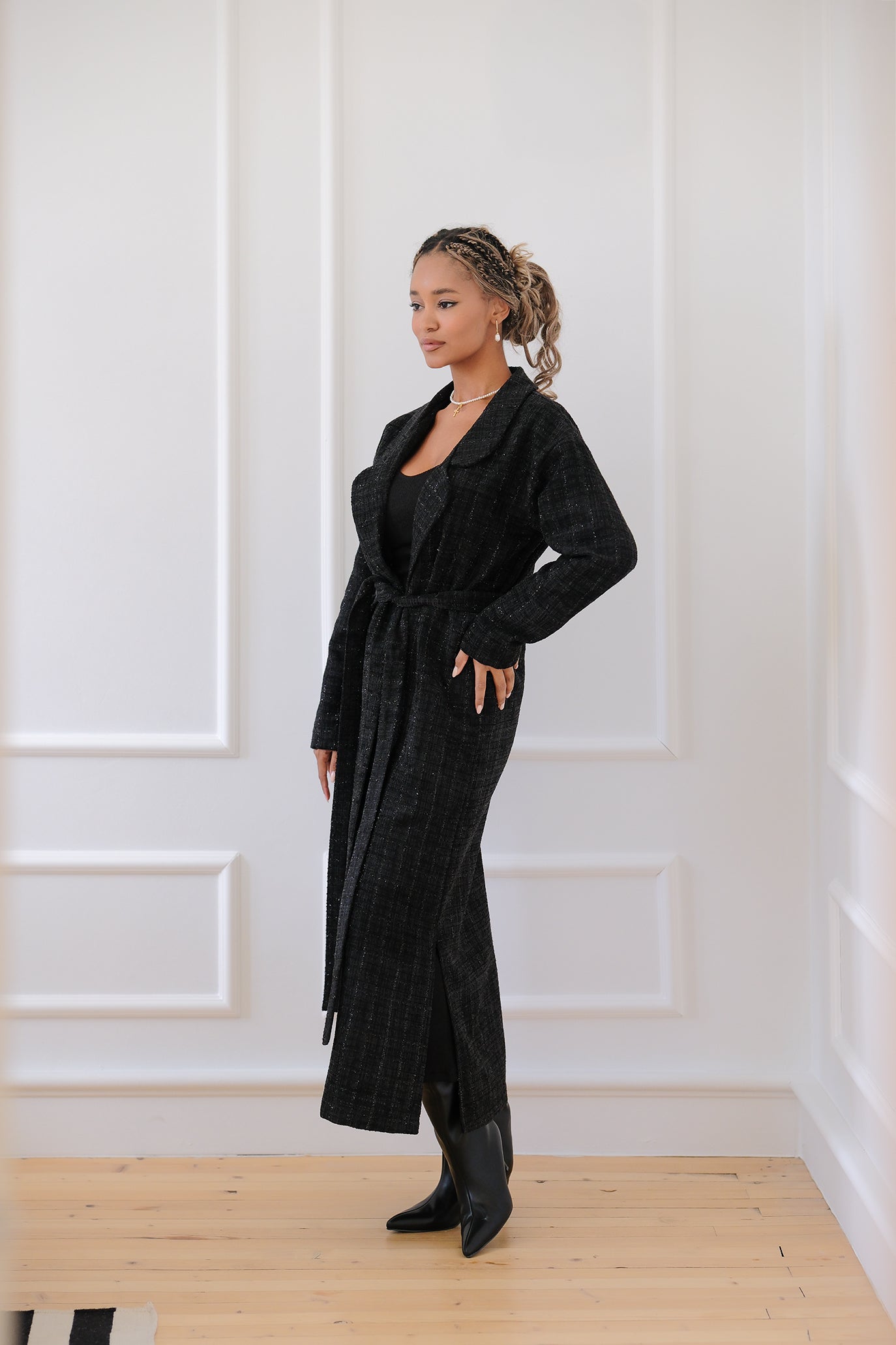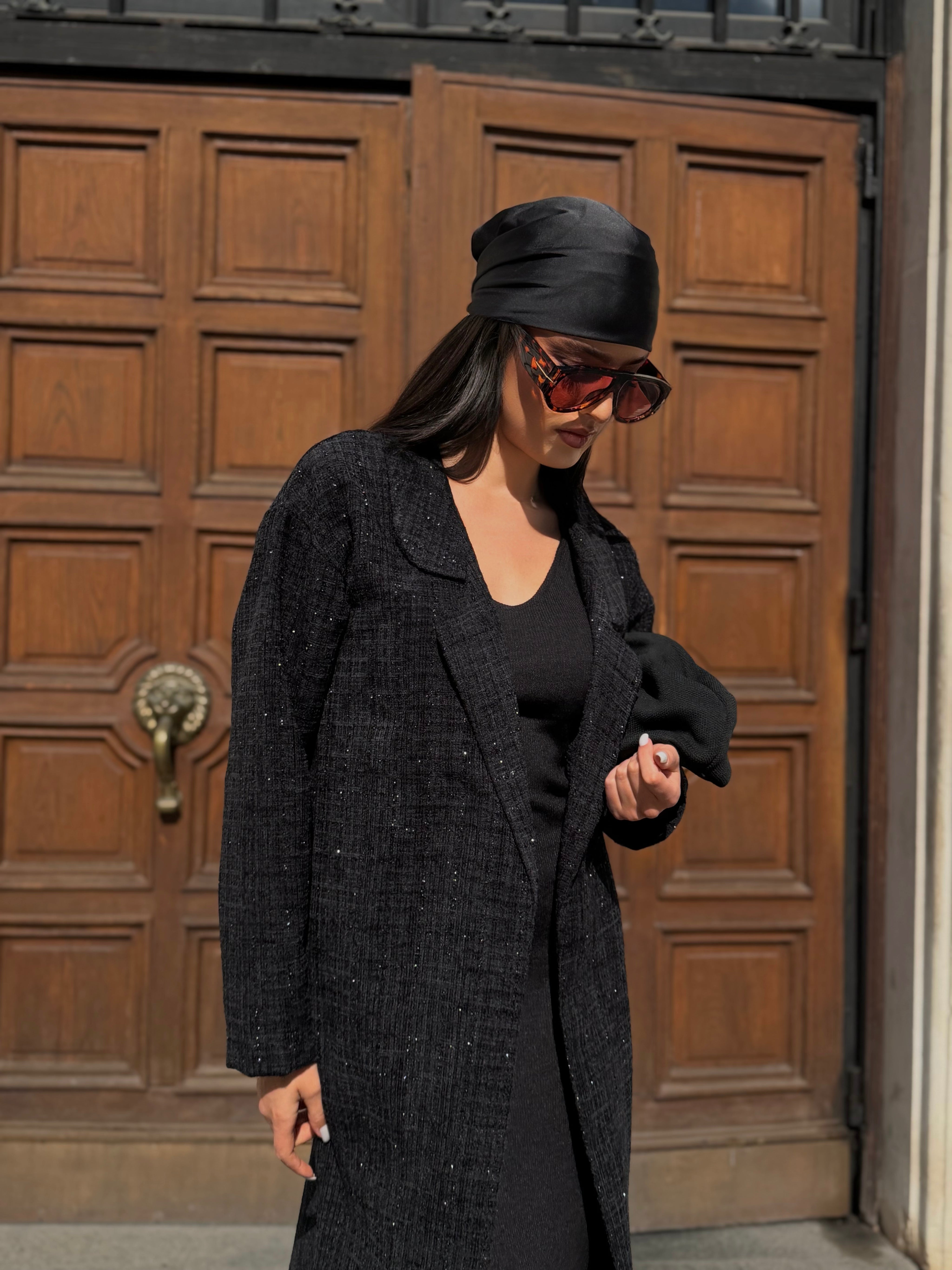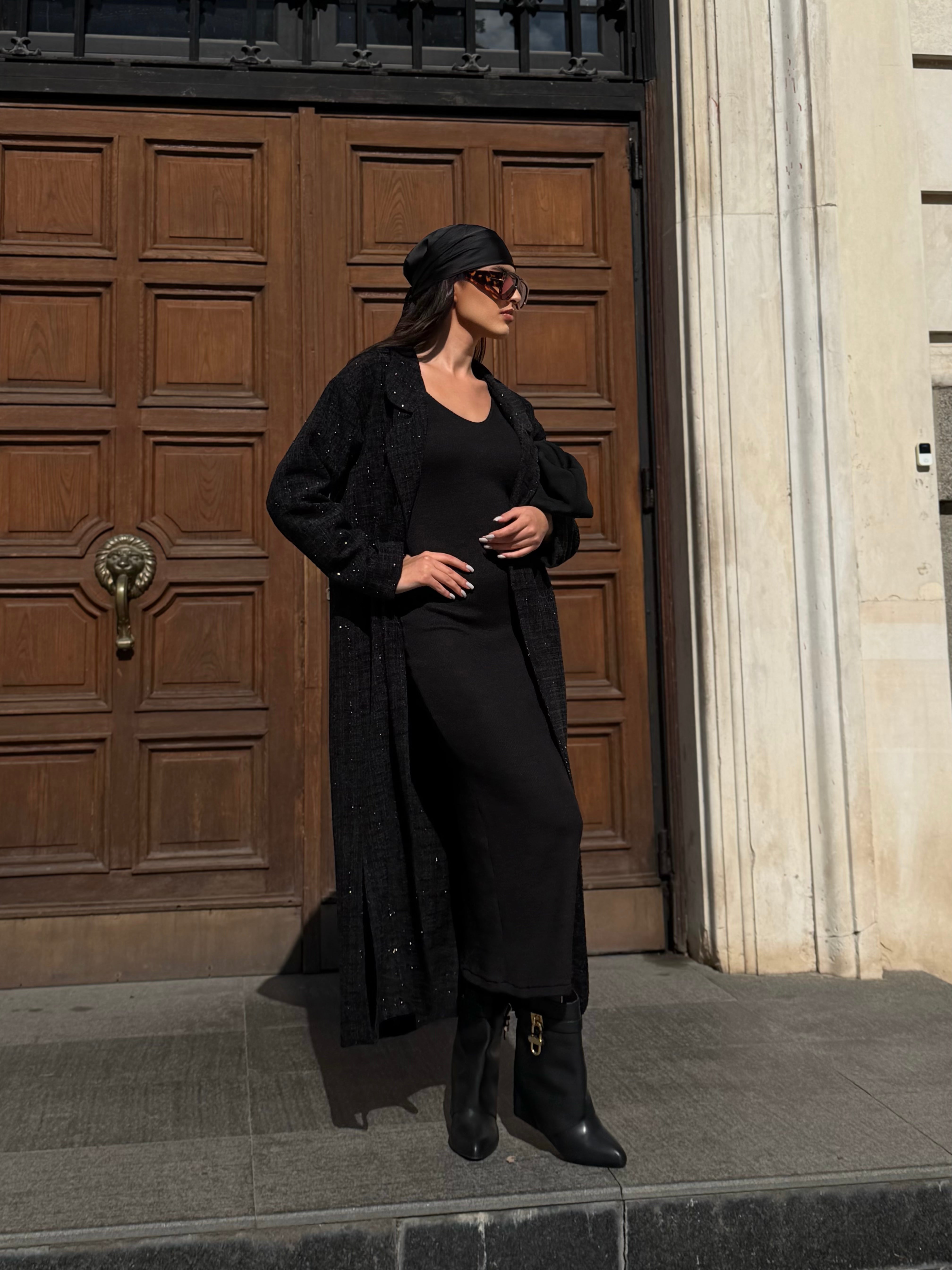 Дълго, елегантно връхно палто/жилетка с халатен силует, ушито от мека букле материя с фин, едва забележим блясък. Моделът е с широки ревери, права линия и колан от същия плат, който подчертава талията. С предно прехлупване и дължината до глезена. Страничните цепки осигуряват свобода на движение. Носи се еднакво добре върху рокли и панталони – от ежедневни до вечерни визии. Роклята отдолу е едноцветна, семпла и безшевна. Удобна за ежедневието и за специални поводи.