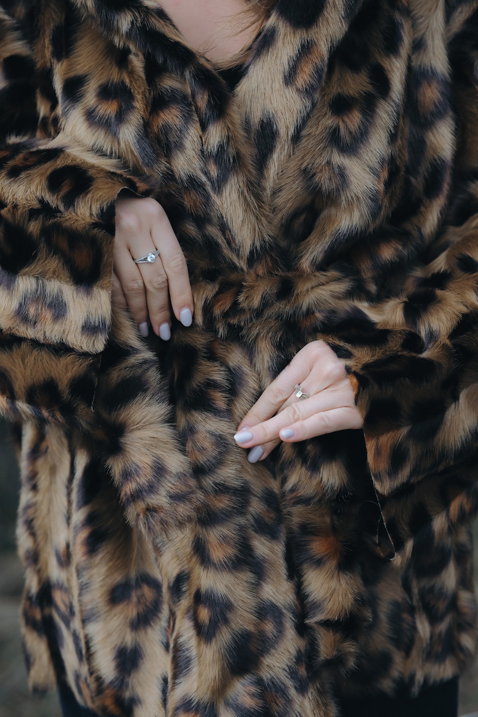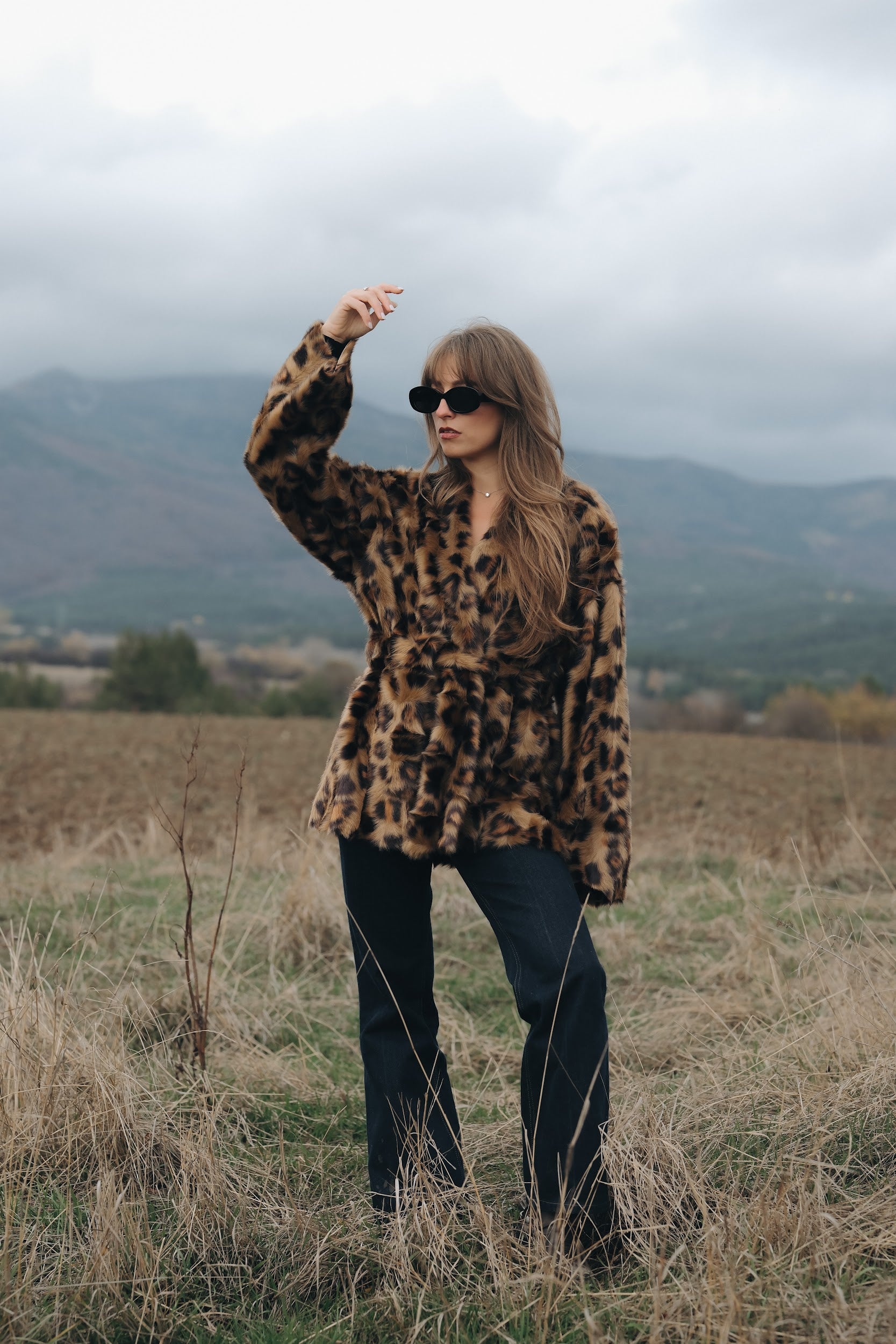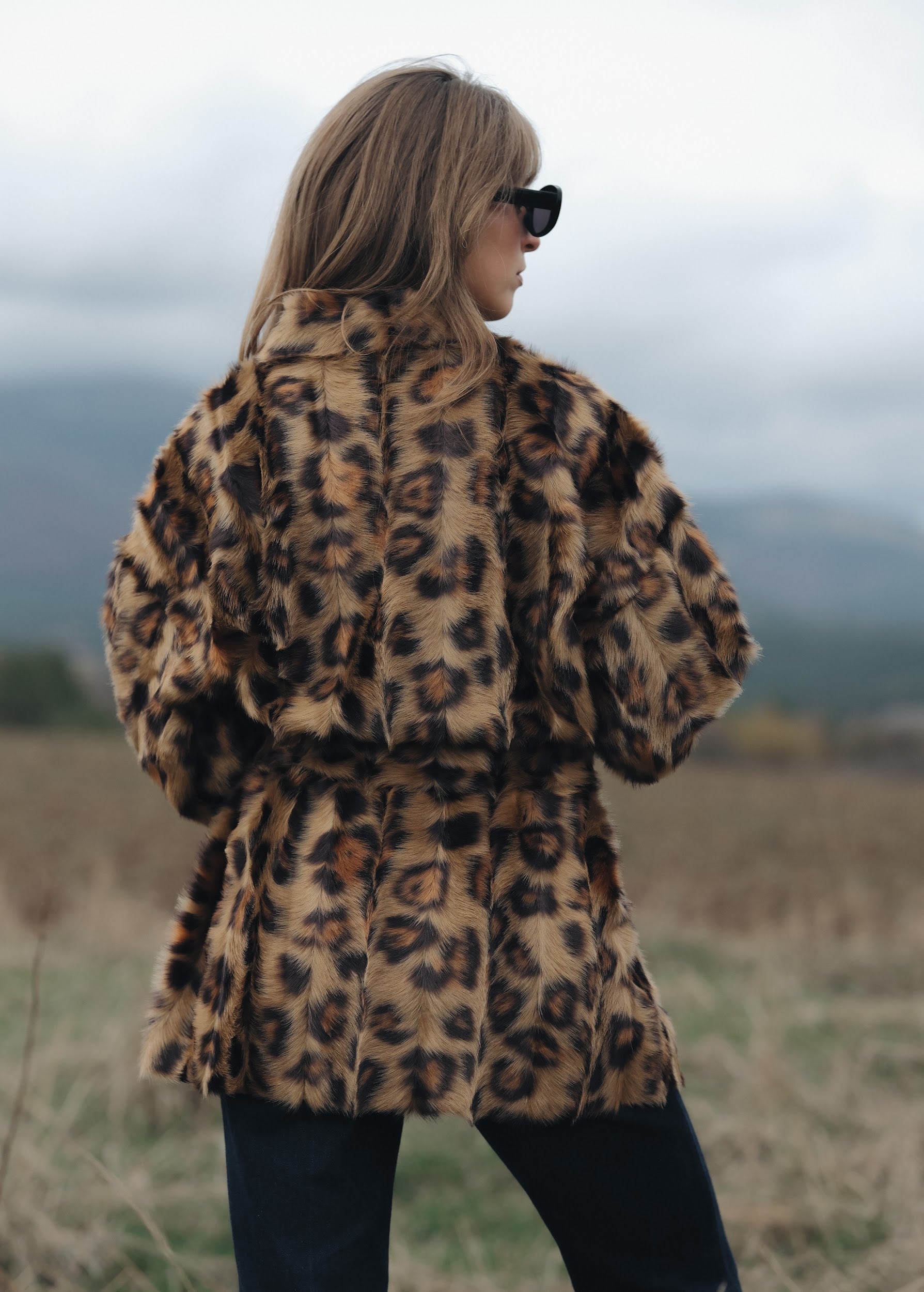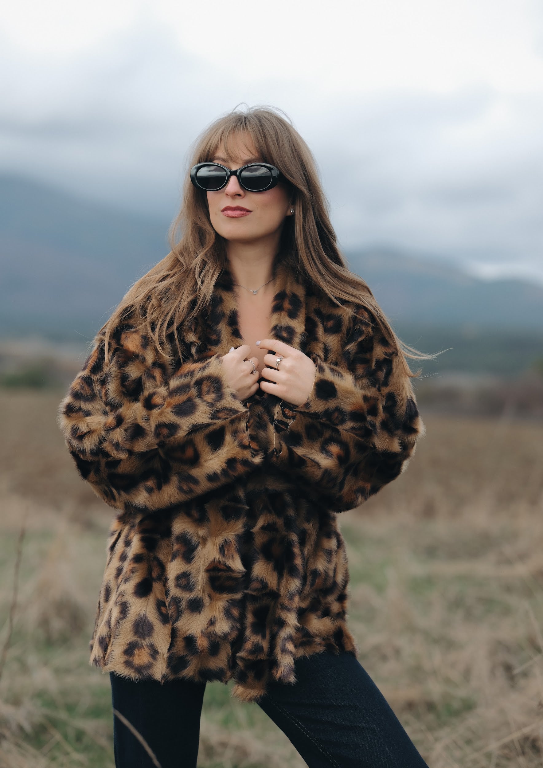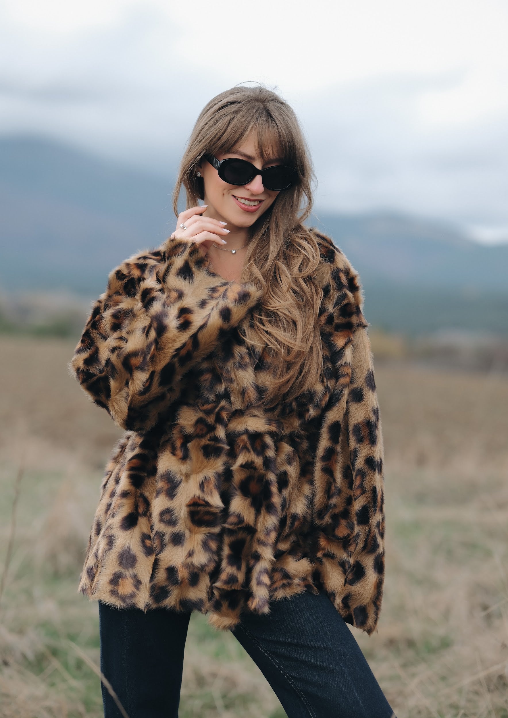 Късо палто от луксозен еко пух с ефектен animal принт. Мекият косъм осигурява топлина и комфорт, без утежняване. Класическа права линия. Коланът подчертава талията и позволява индивидуално прилягане – носете свободно разкопчано за relaxed визия или пристегнато за елегантен силует. Перфектно за градски стил и вечерни излизания. Един универсален размер.