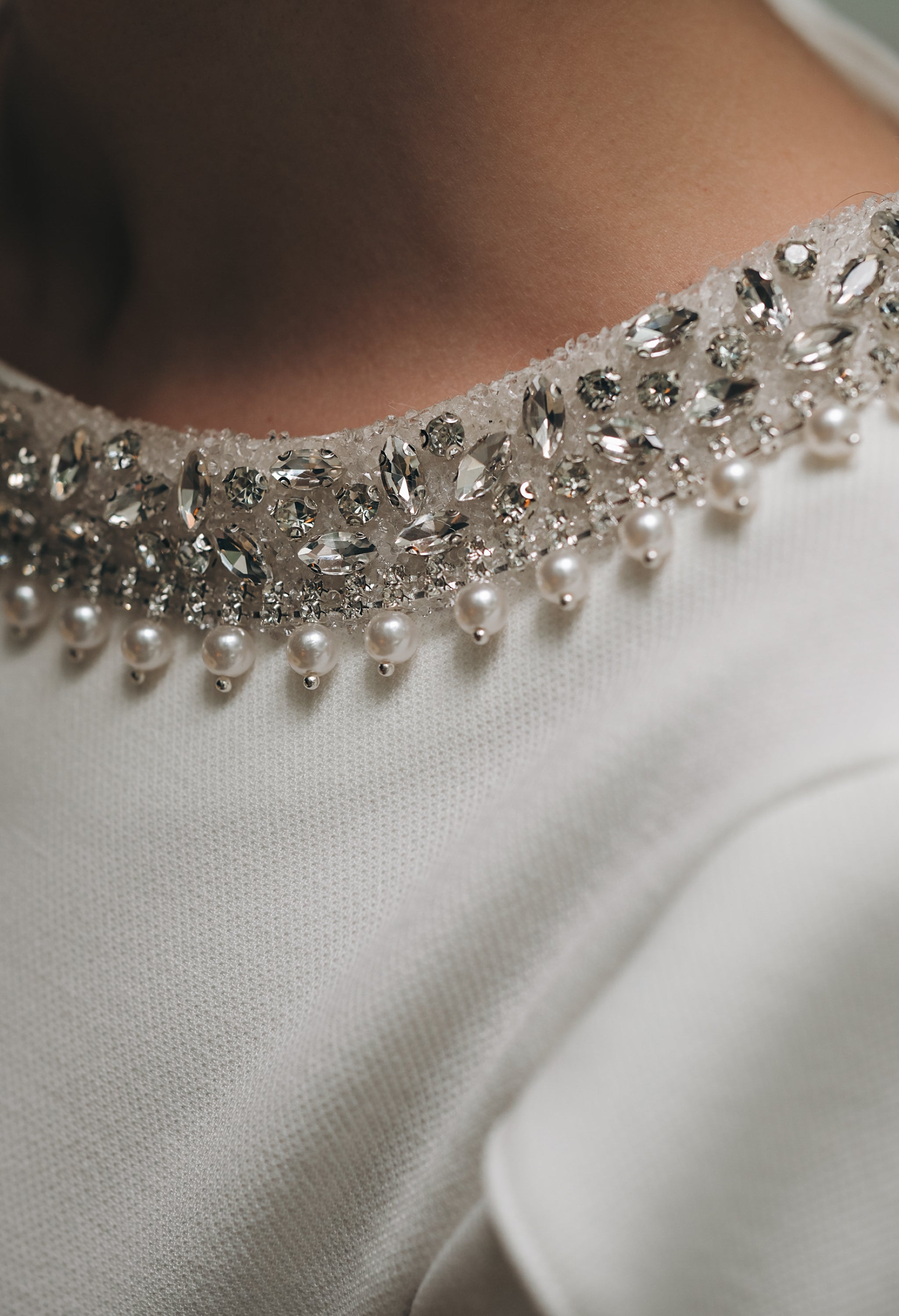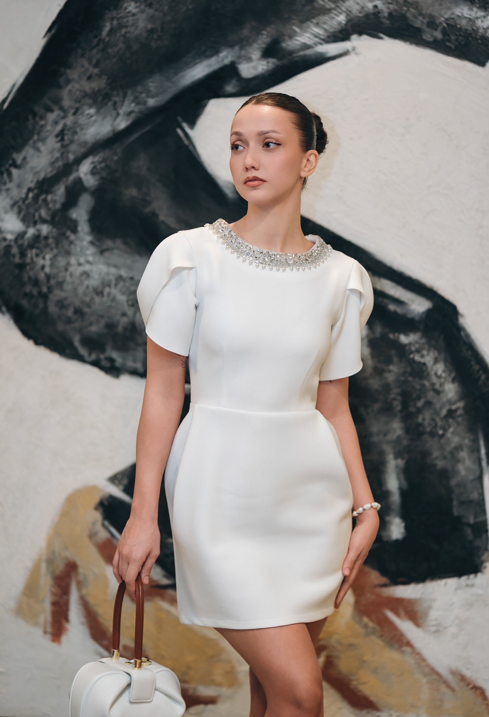 Елегантна коктейлна рокля с изчистен силует и впечатляващ акцент около деколтето. Декорацията е изработена от фино подбрани кристални елементи тип Swarovski в сребристо, подредени във флорален мотив, който красиво обгръща шията и придава усещане за бижу. Кройката подчертава фигурата, а късите ръкави и минималистичният дизайн създават класическо излъчване. Материята е плътна. Не прозира.