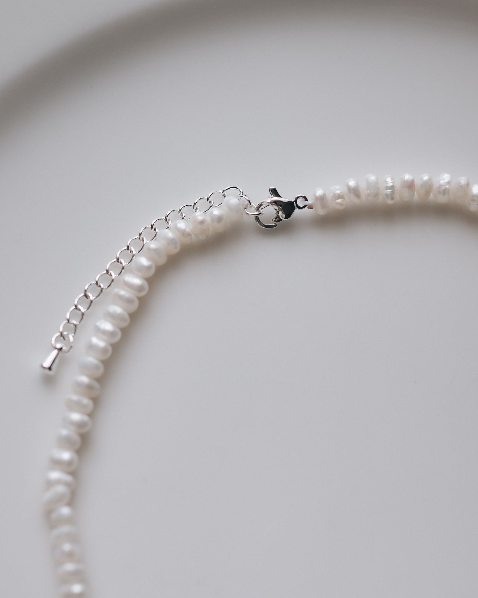 Елегантно колие с фини малки перли в редица. Колието е изработено от класически бели перли, нежно обгръщащи шията. Моделът е подходящ както за официални поводи, така и за стилни вечерни визии.
