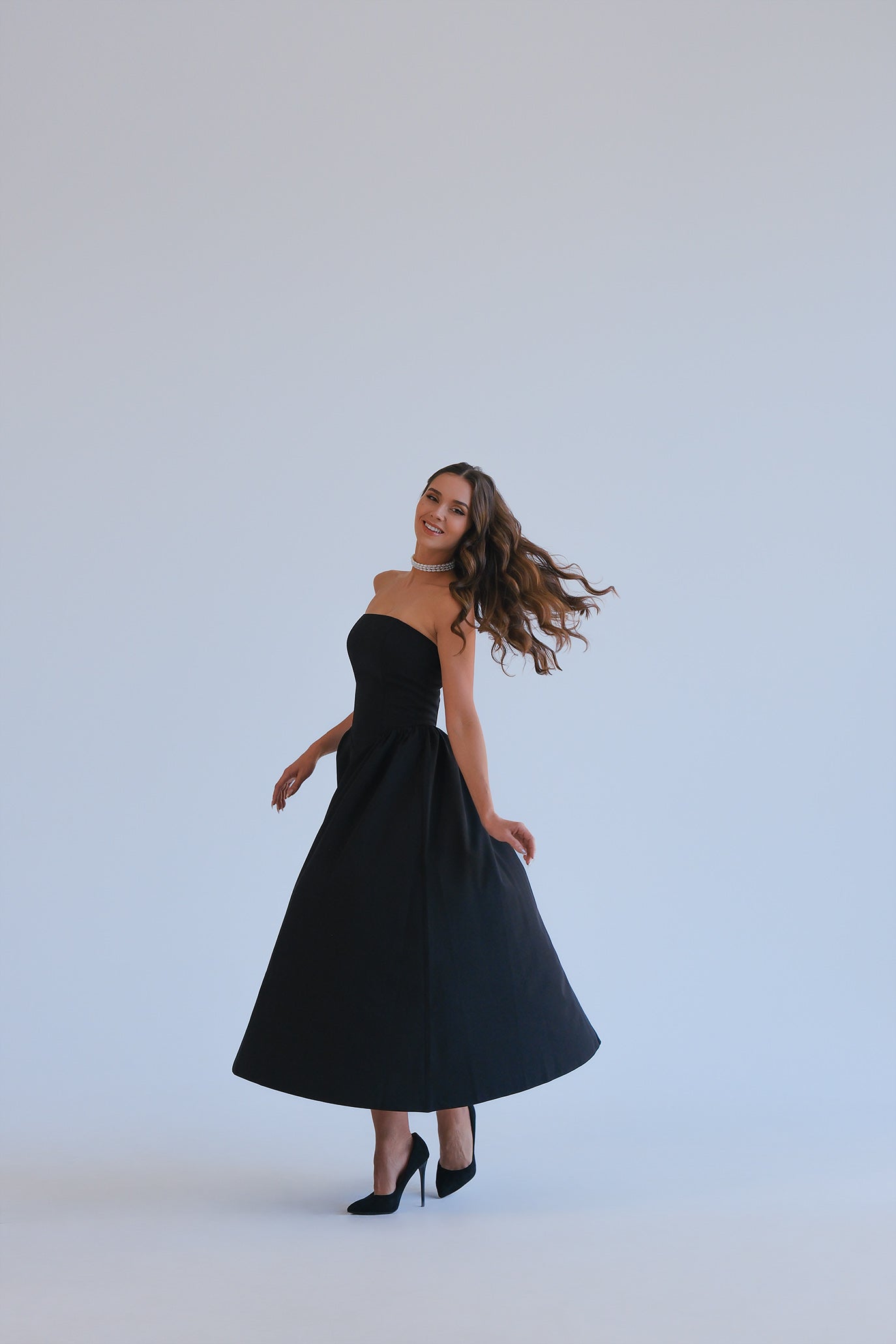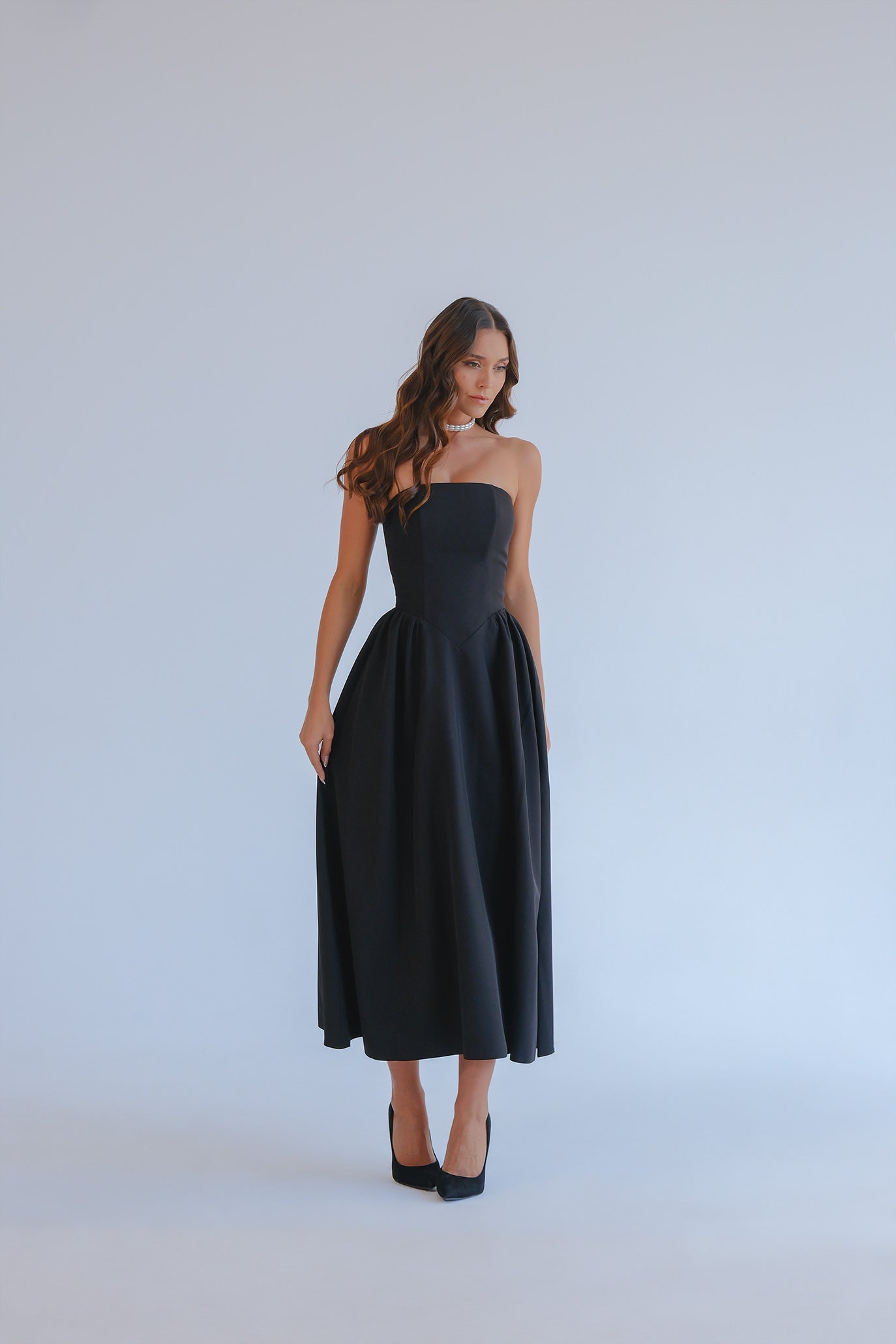 Минималистична, но впечатляваща рокля със съвременен силует. Горната част е тип бюстие със стабилна вътрешна конструкция, която прибира и оформя бюста, а V-образният шев към талията визуално издължава фигурата. Полата е с меки гънки, които придават обем и движение, падащи до елегантна миди дължина. Моделът е изработен от плътна, меко падаща материя с лек еластичен комфорт.