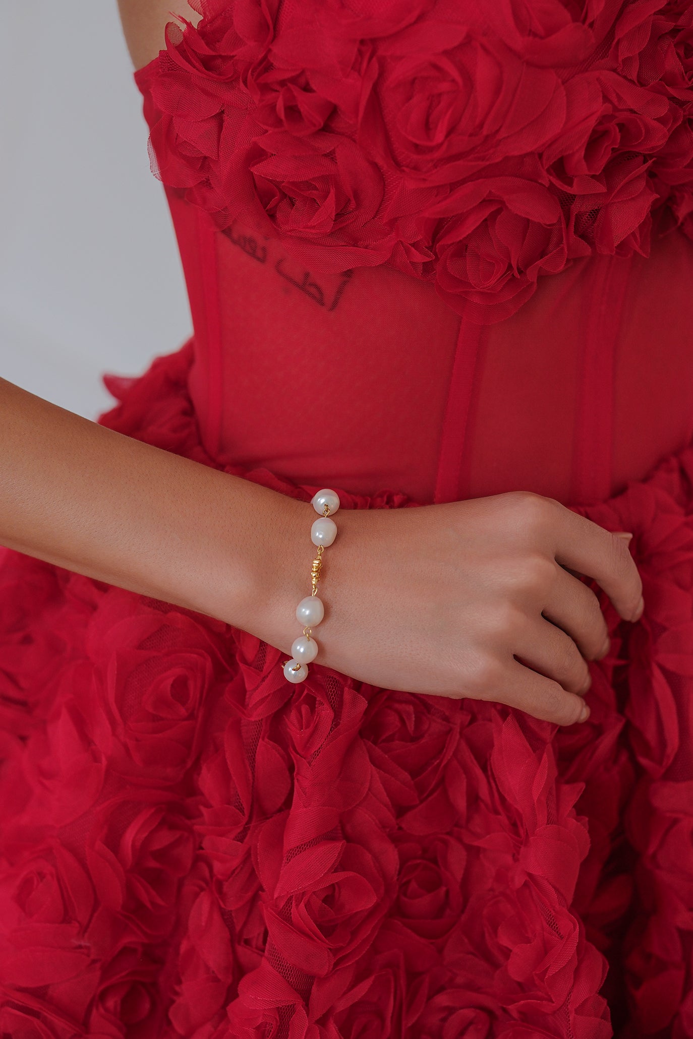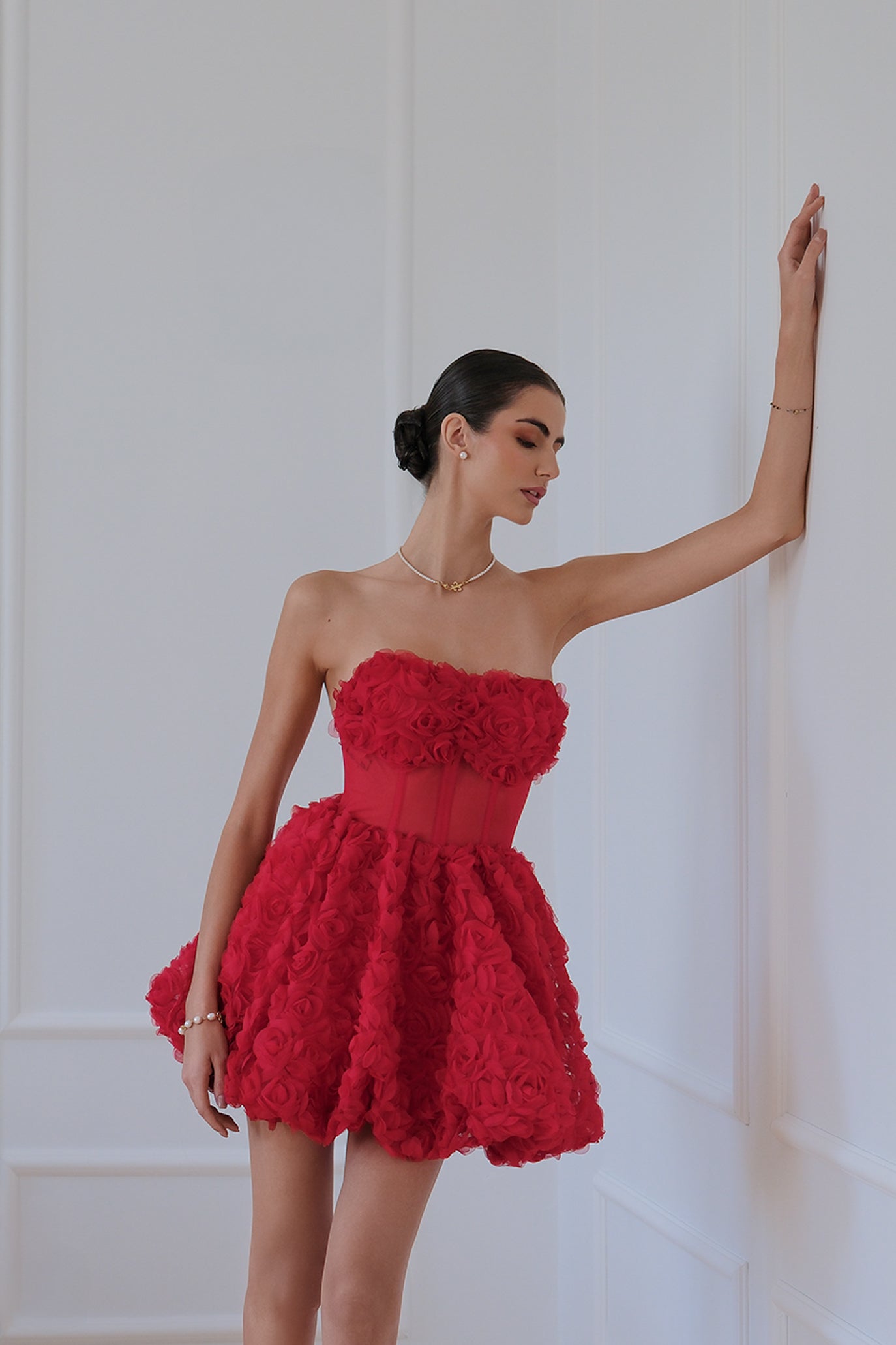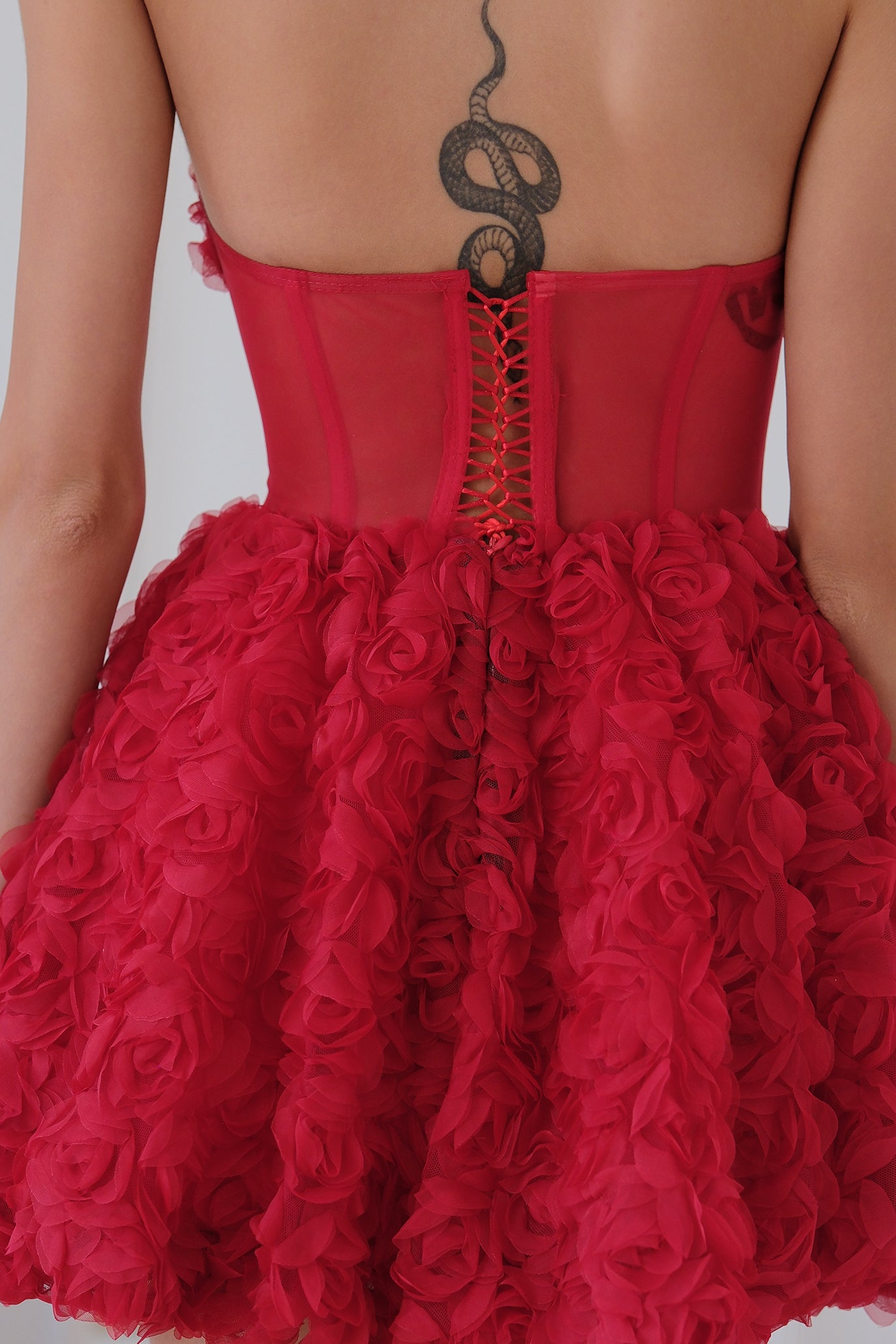 Коктейлна рокля с корсетно завръзване, изработена от деликатна полупрозрачна дантела и декоративни цветя от тюл, които придават фееричен вид. Бюстието с чашки акцентира върху фигурата, а корсетната структура поддържа роклята стабилно.