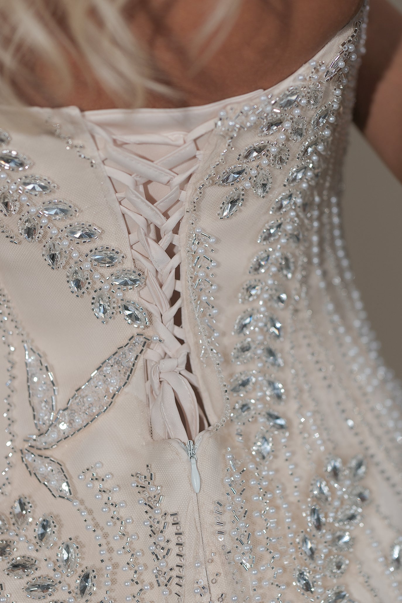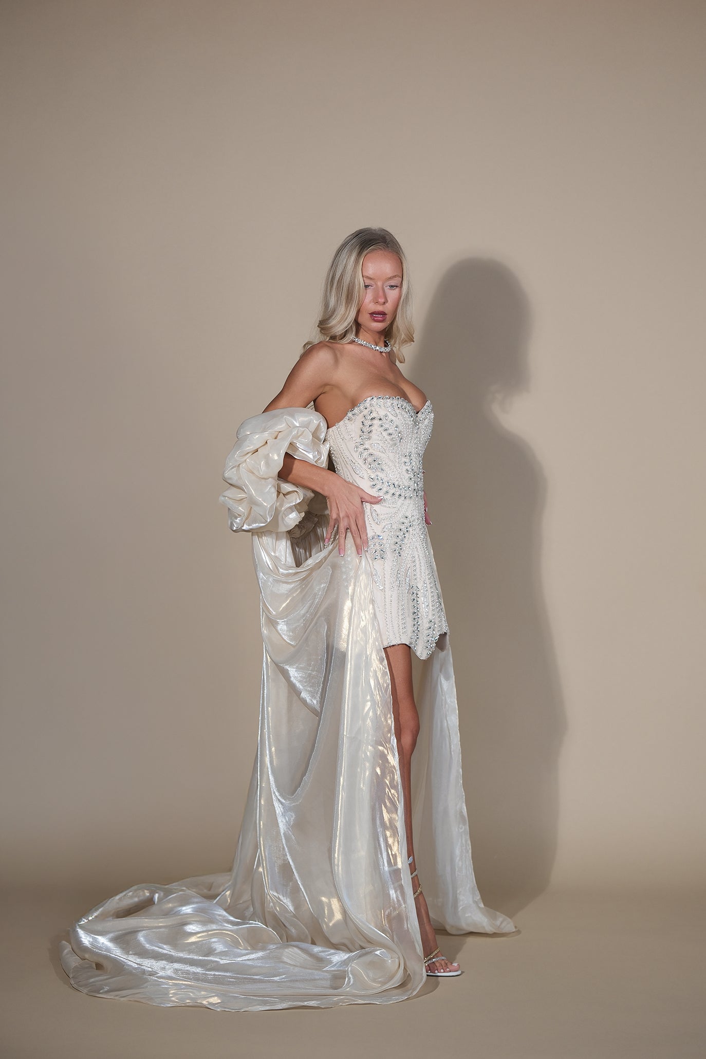 Елегантна коктейлна рокля с корсетен дизайн и изключителни блестящи детайли, които придават на визията богат и сияен ефект. Бюстието е декорирано с големи и малки камъни, акцентирайки на деколтето, а корсетното завръзване осигурява перфектна форма и стабилност. Вградените чашки осигуряват комфорт през целия ден, а роклята е идеална за всяко специално събитие. Може да се комбинира с шлейф.