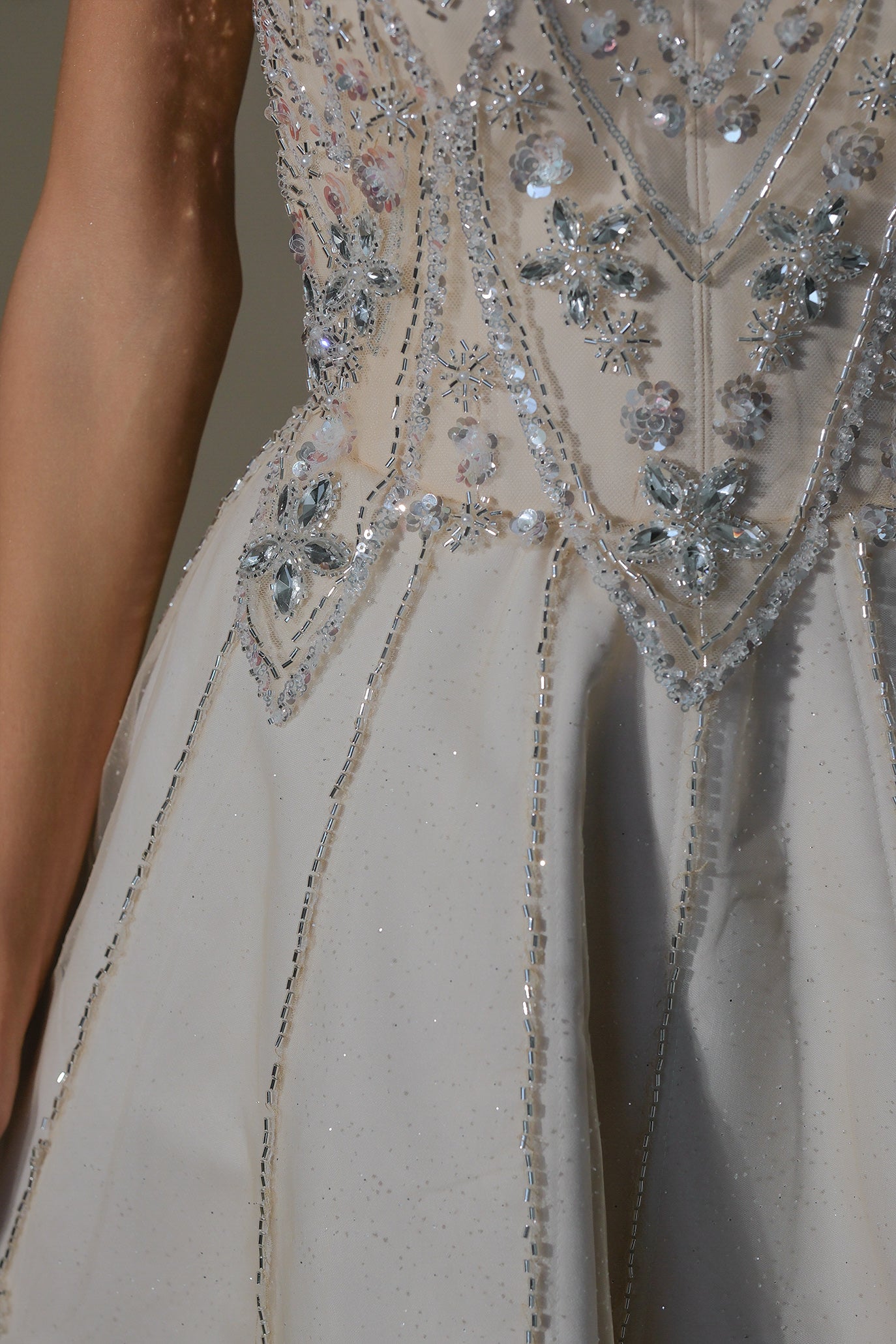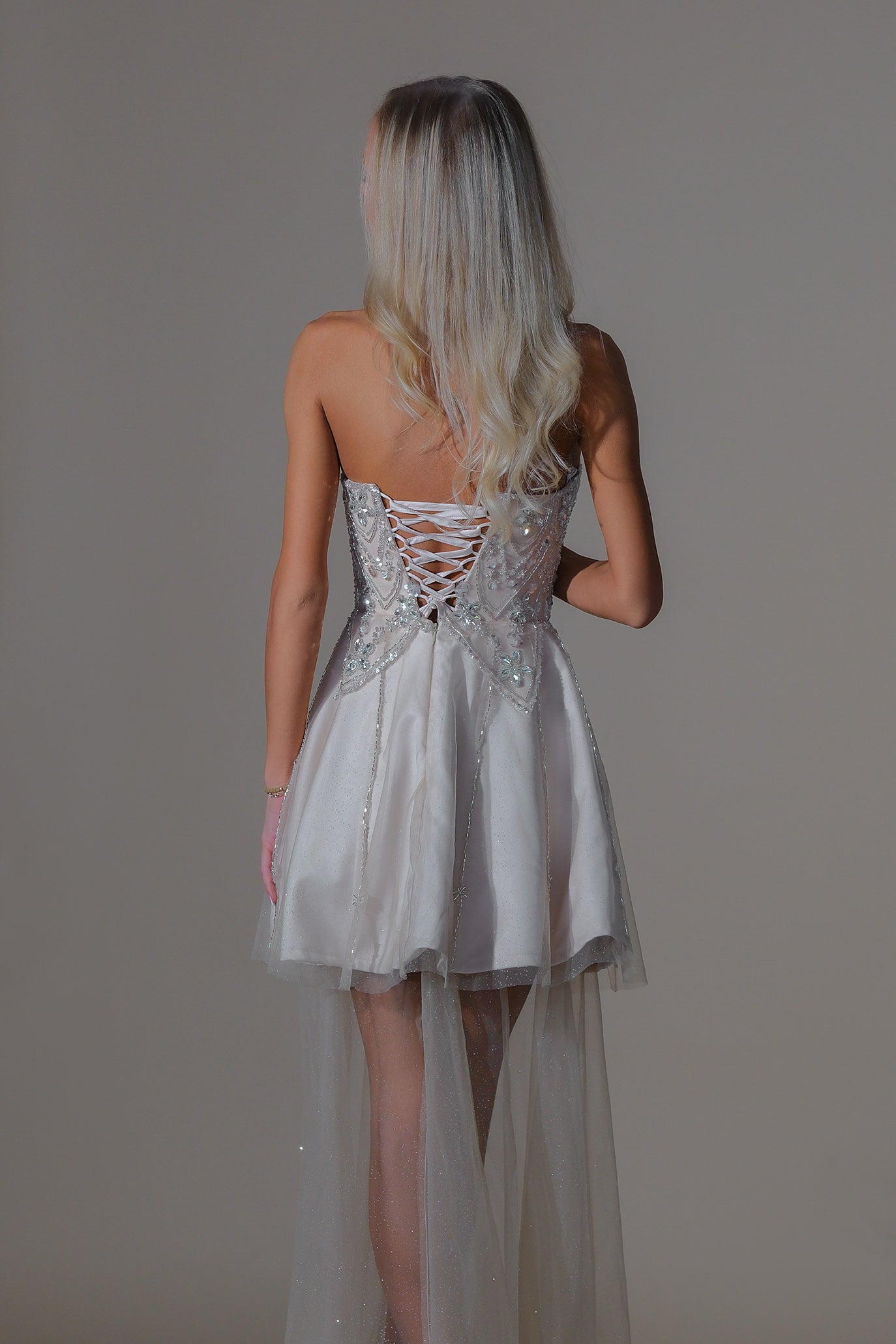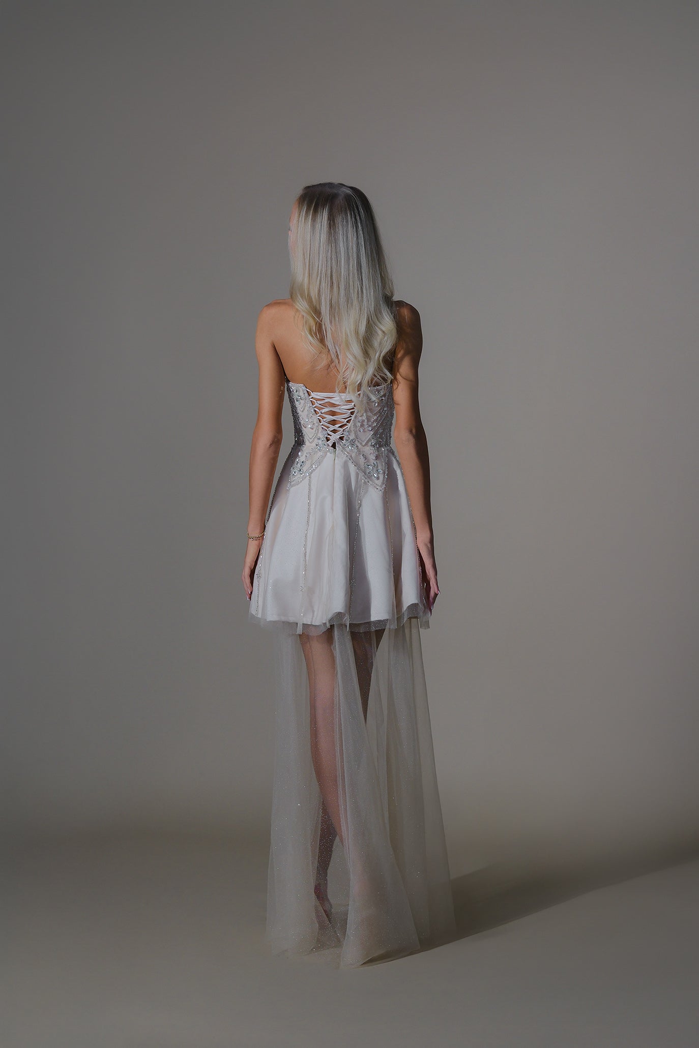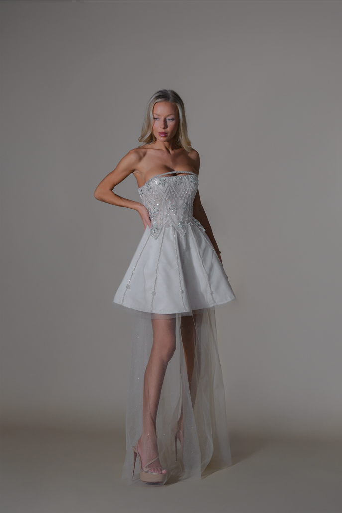 Мини рокля с корсетна основа, изработена с твърда конструкция и вградени банели за прецизна форма. Горната част е богато украсена с ръчно нашити кристали и перли, които образуват сияйни графични мотиви. Полата е структурирана и подчертава талията, а прозрачната втора пола от фин брокатен тюл пада до пода и придава ефект на издължен силует. Корсетните връзки на гърба позволяват индивидуално прилягане към тялото.