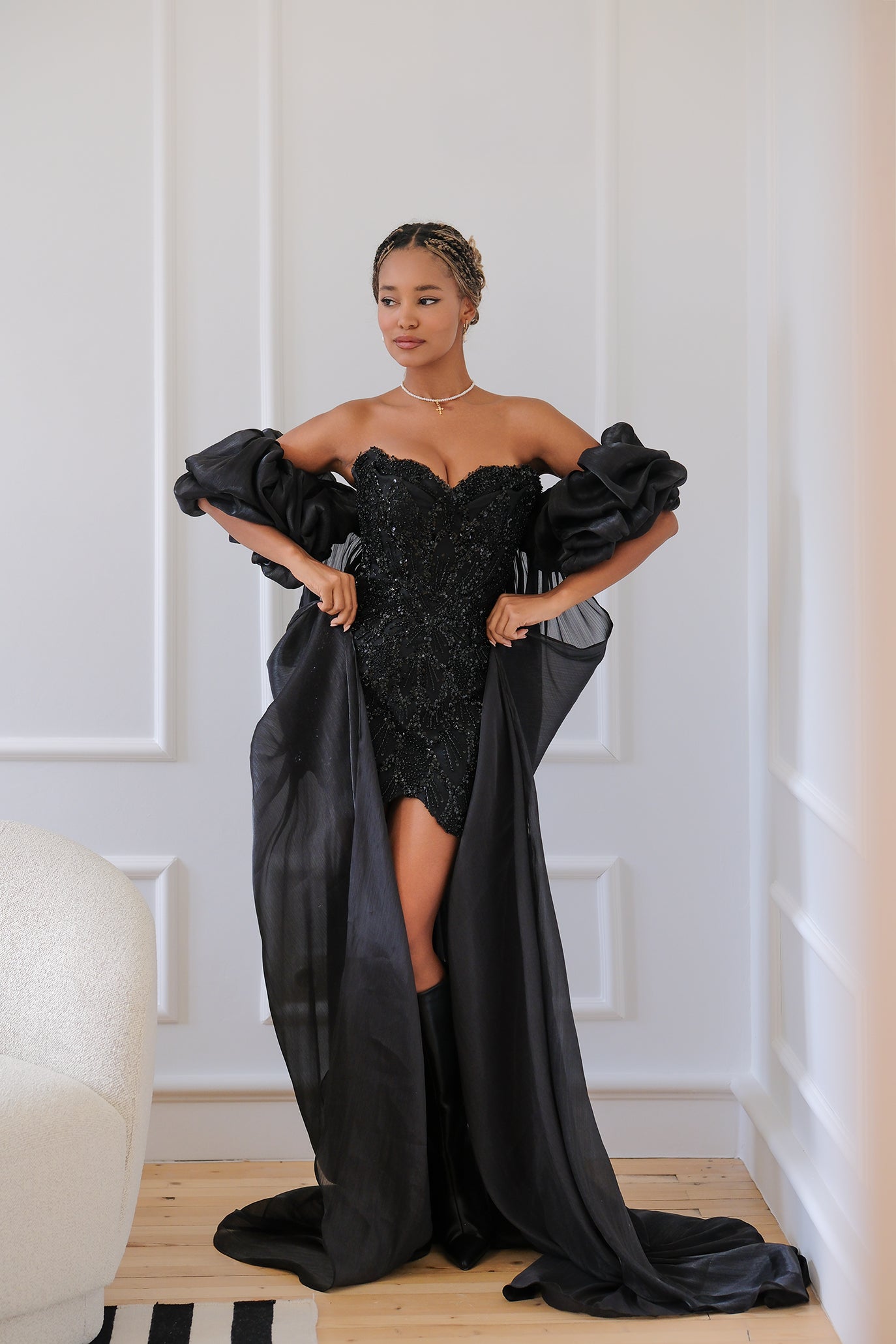 Мини рокля бюстие, изцяло богато украсена с черни мъниста и пайети, които създават триизмерен релеф и силен блясък. Горната част е корсетна с изразени чашки и сърцевидно деколте, оформящо бюста и талията. Полата е с нестандартен завършек по подгъва за елегантен „листов“ ефект. Моделът е подходящ за коктейл, бал или специален повод; има мека подплата за комфорт и стабилност при носене.