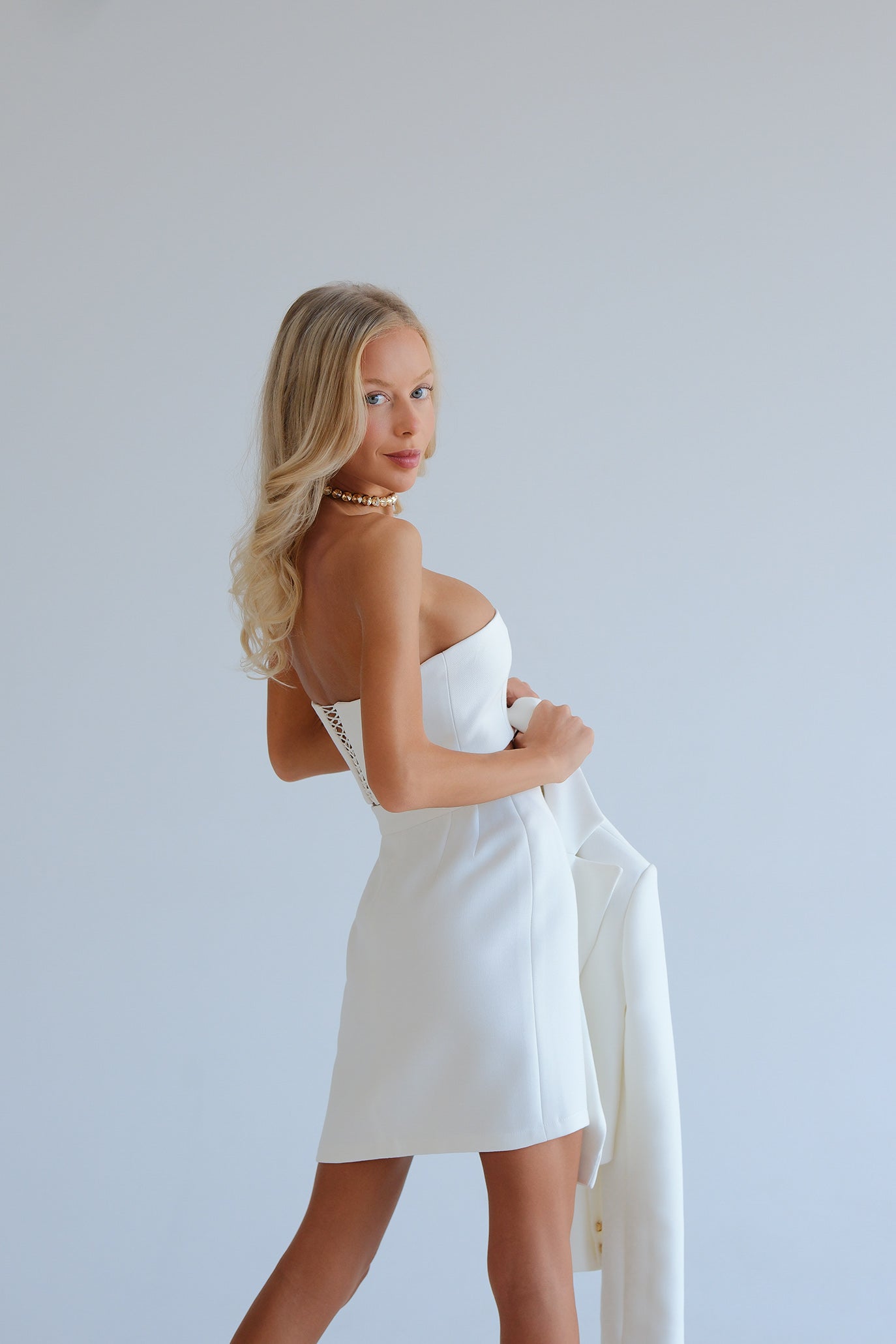 Закопчаване: сако с метални копчета отпред; пола със скрит цип отзад; топ с връзки