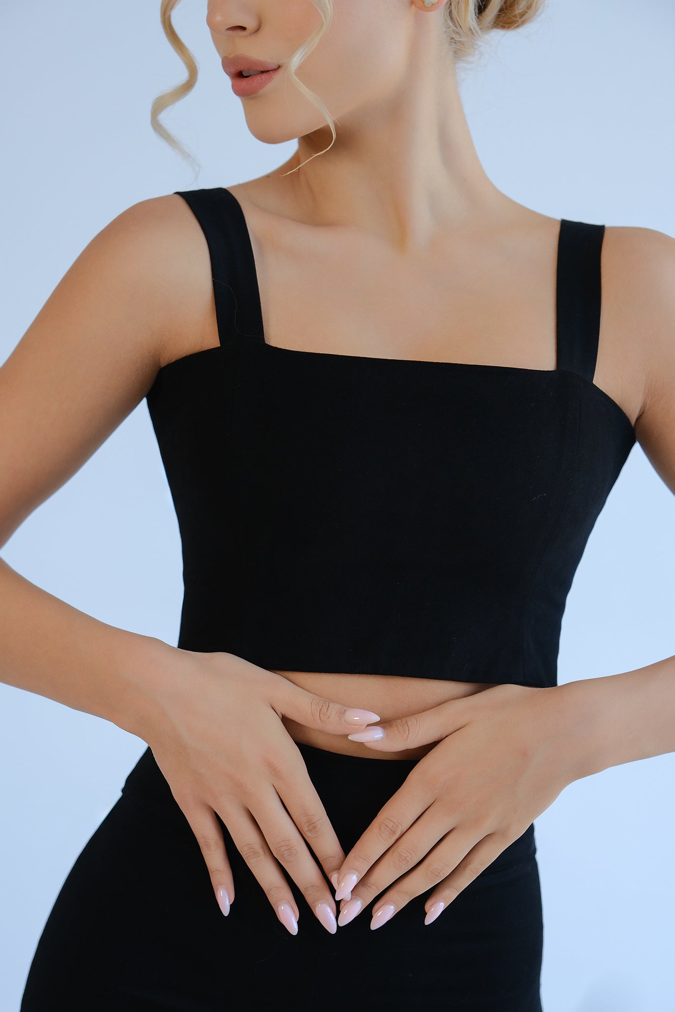 Комплектът включва три части – панталон с висока талия, къс топ и късо сако.