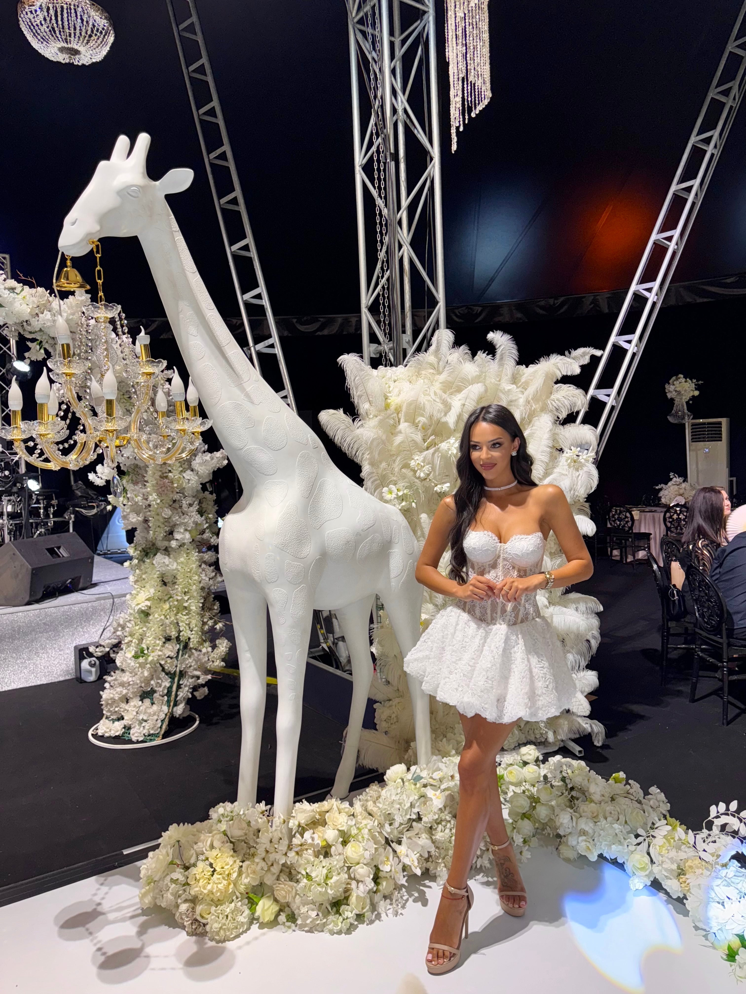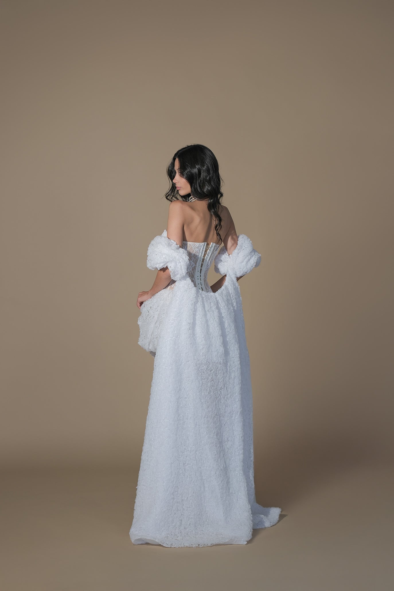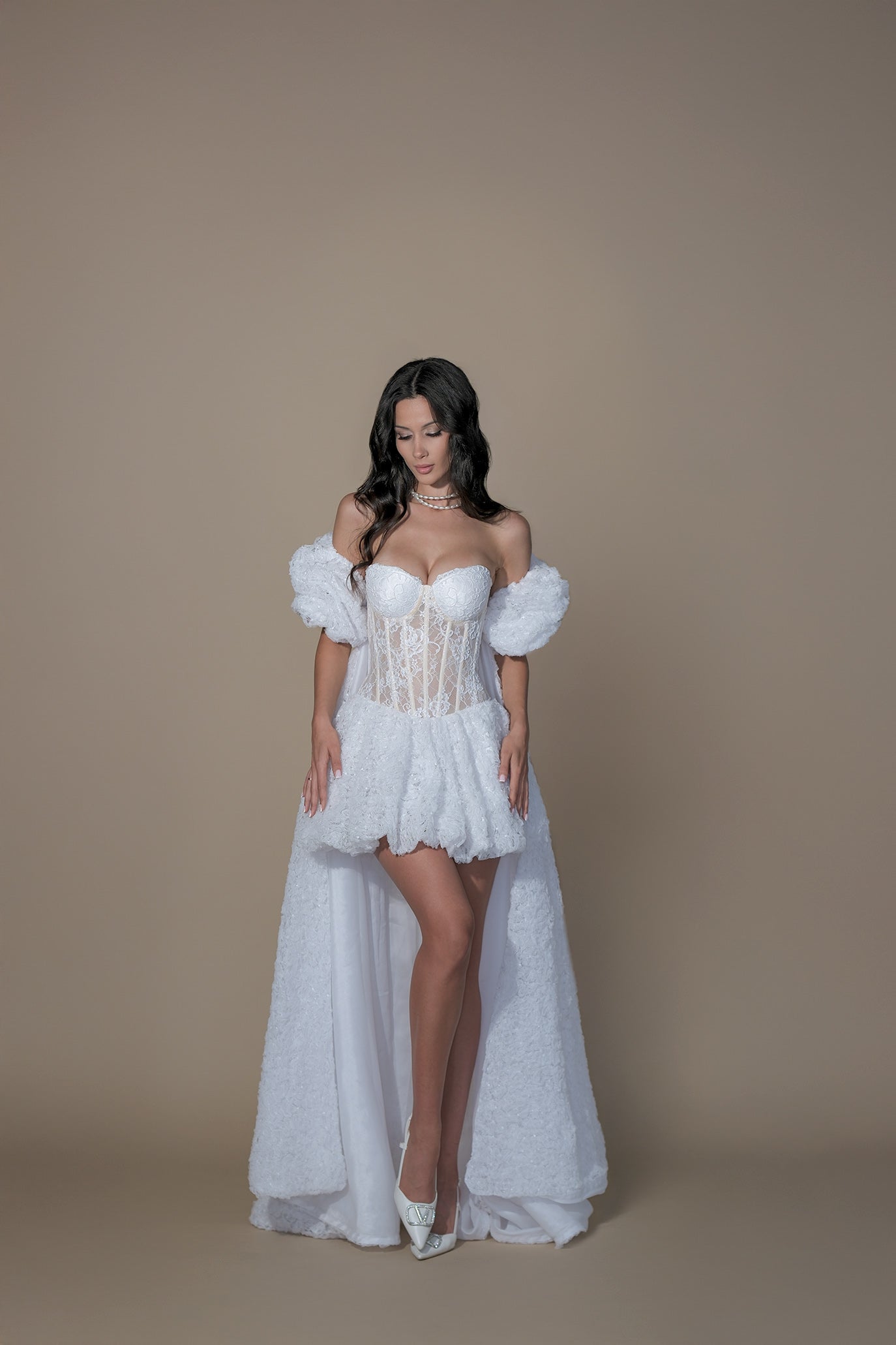 Съвременна романтика с корсетна прецизност. Горната част е изградена с твърда конструкция и банели за стабилност и перфектно прилягане. Падналите рамене и дантелените ръкави придават ефирност. Мини полата оформя женствен силует, който може да бъде трансформиран във вечерна визия чрез дългия, прозрачен дантелен шлейф – поставя се отгоре и създава ефект на два тоалета в един. Корсетното връзване на гърба позволява фино регулиране по тялото.