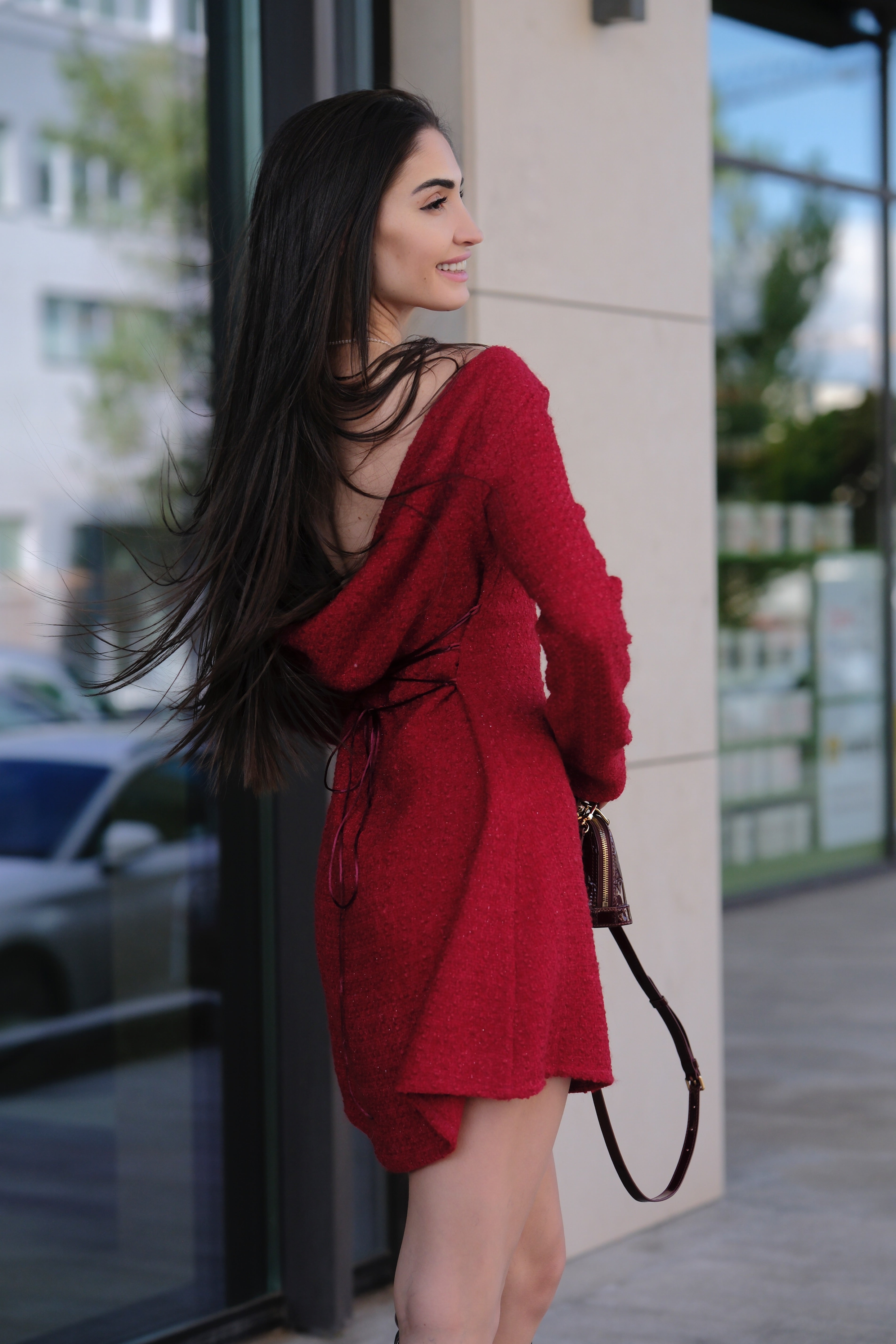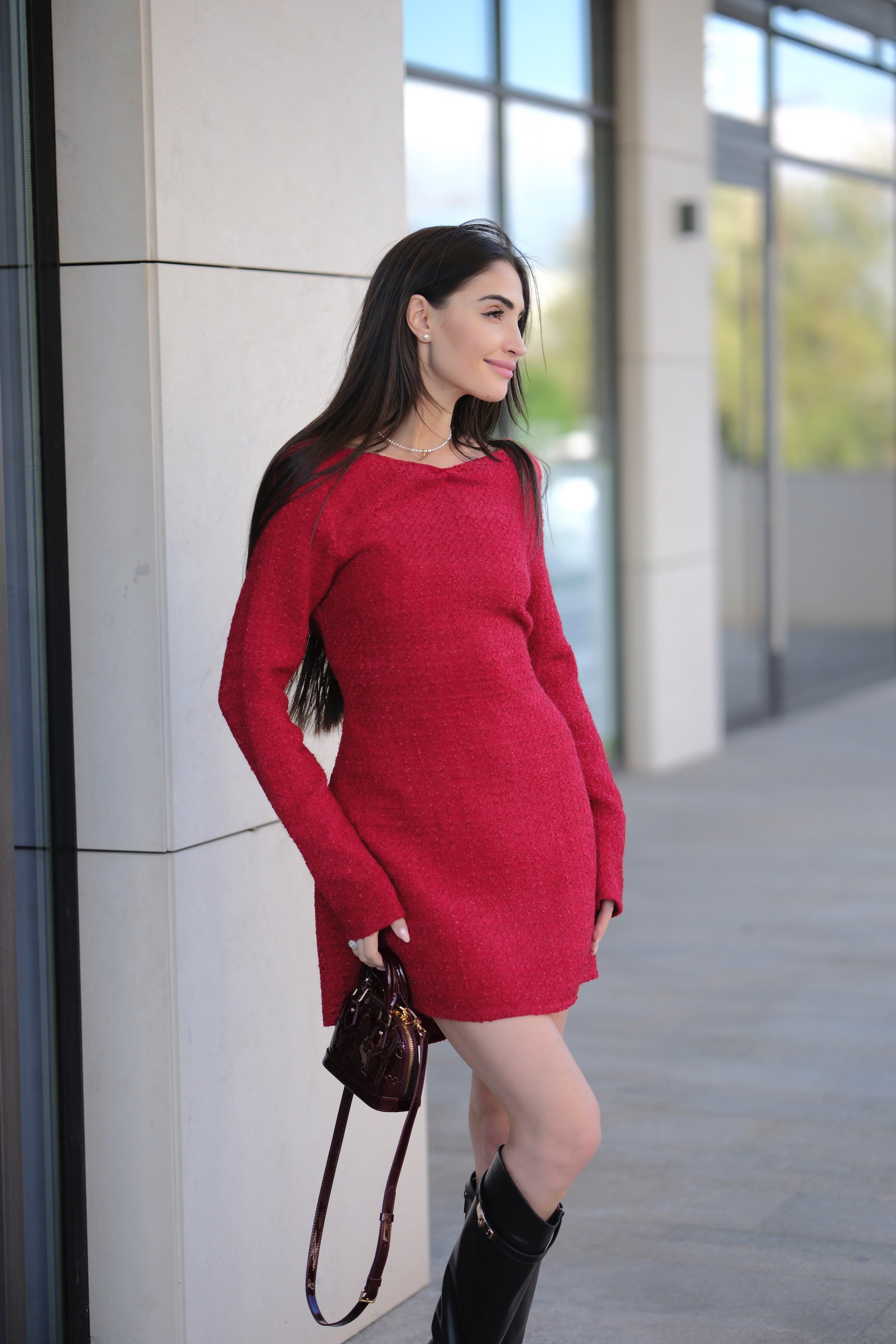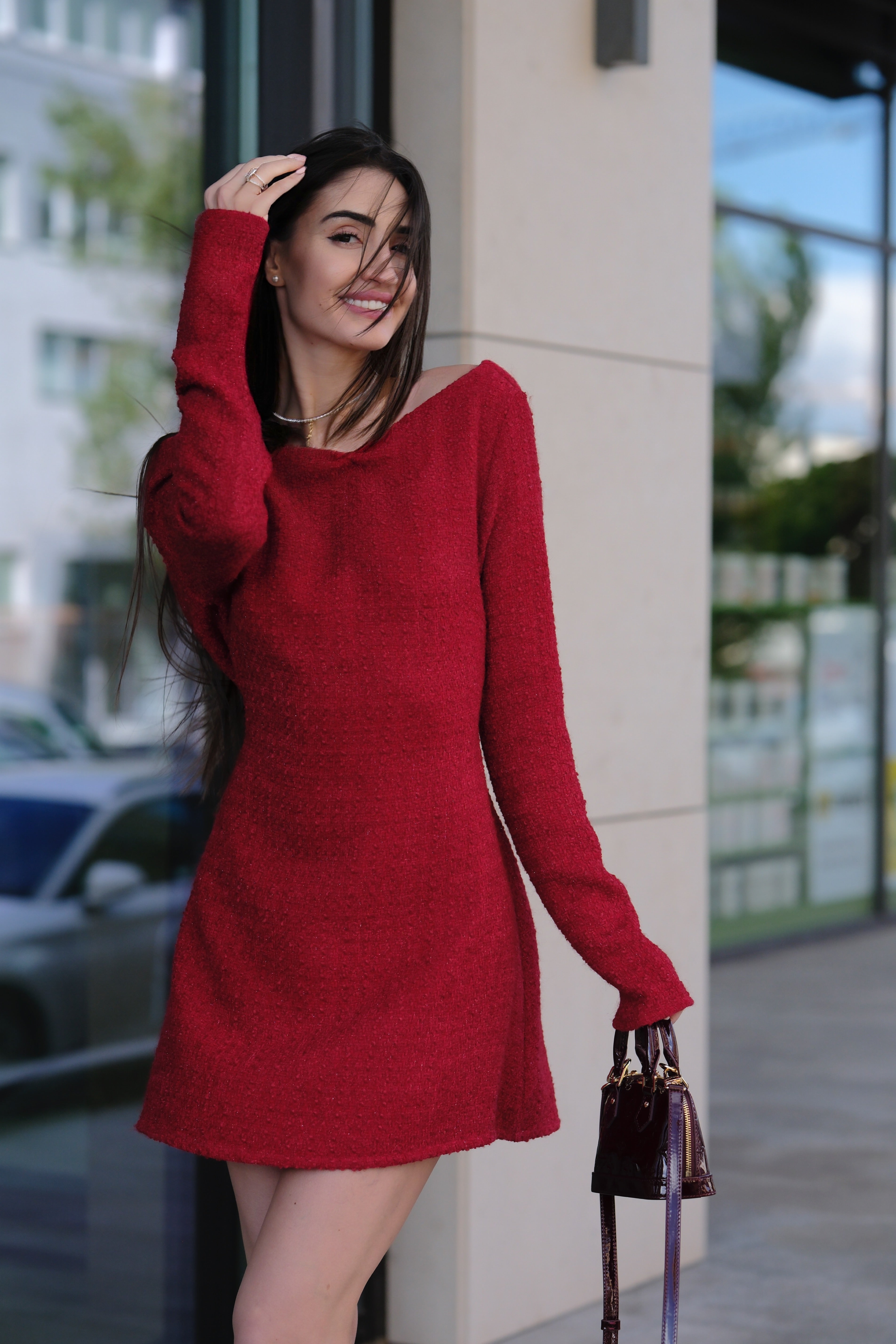 Рокля, която стопля есенните дни като прегръдка. Изработена от висококачествена материя, подобна на букле, която е изключително мека. Визията излъчва неподражаема класа с деколтето с паднало рамо и дълбокият гръб тип "водопад". Отзад се пристяга с връзки, което не само персонализира удобството, но и подчертава талията.