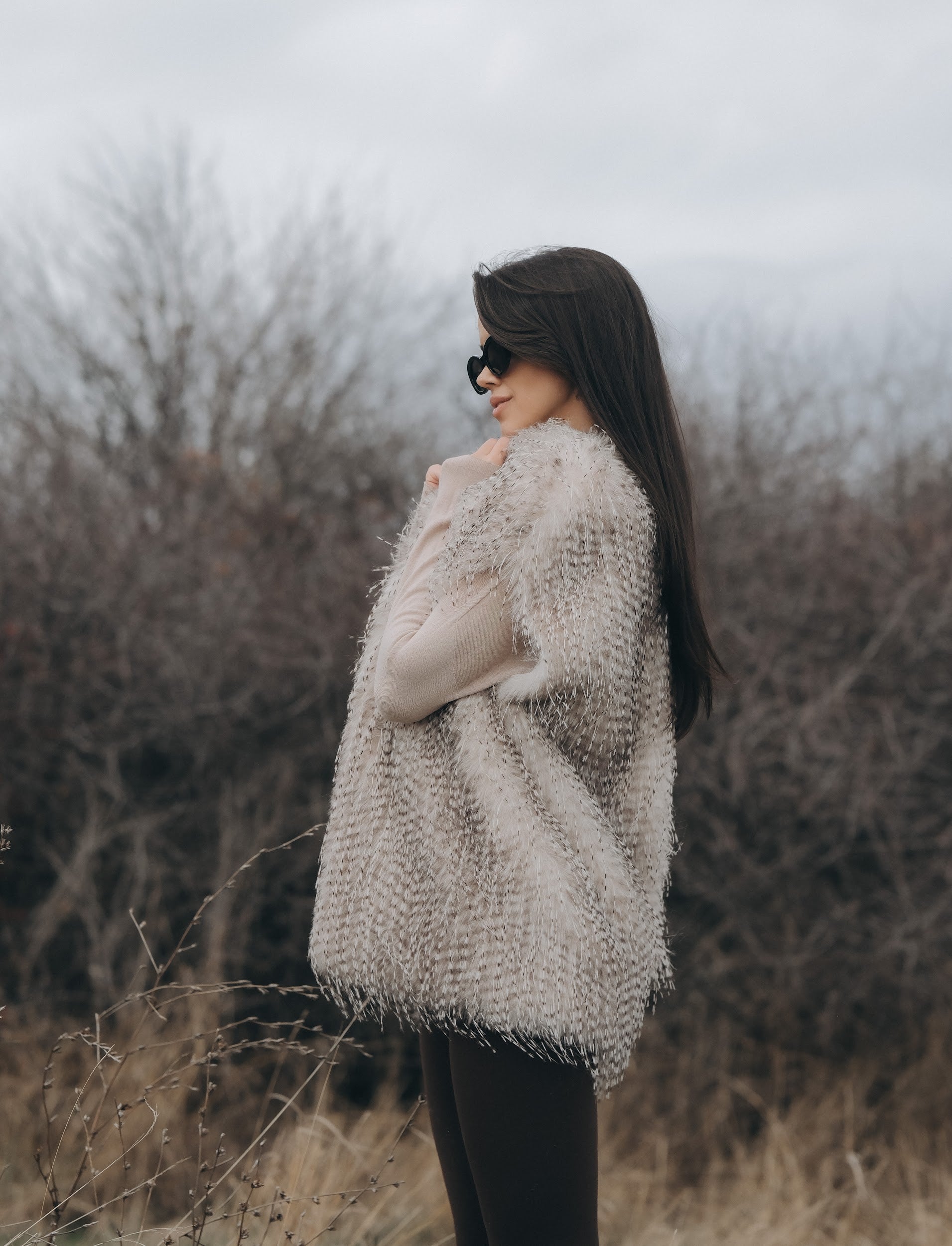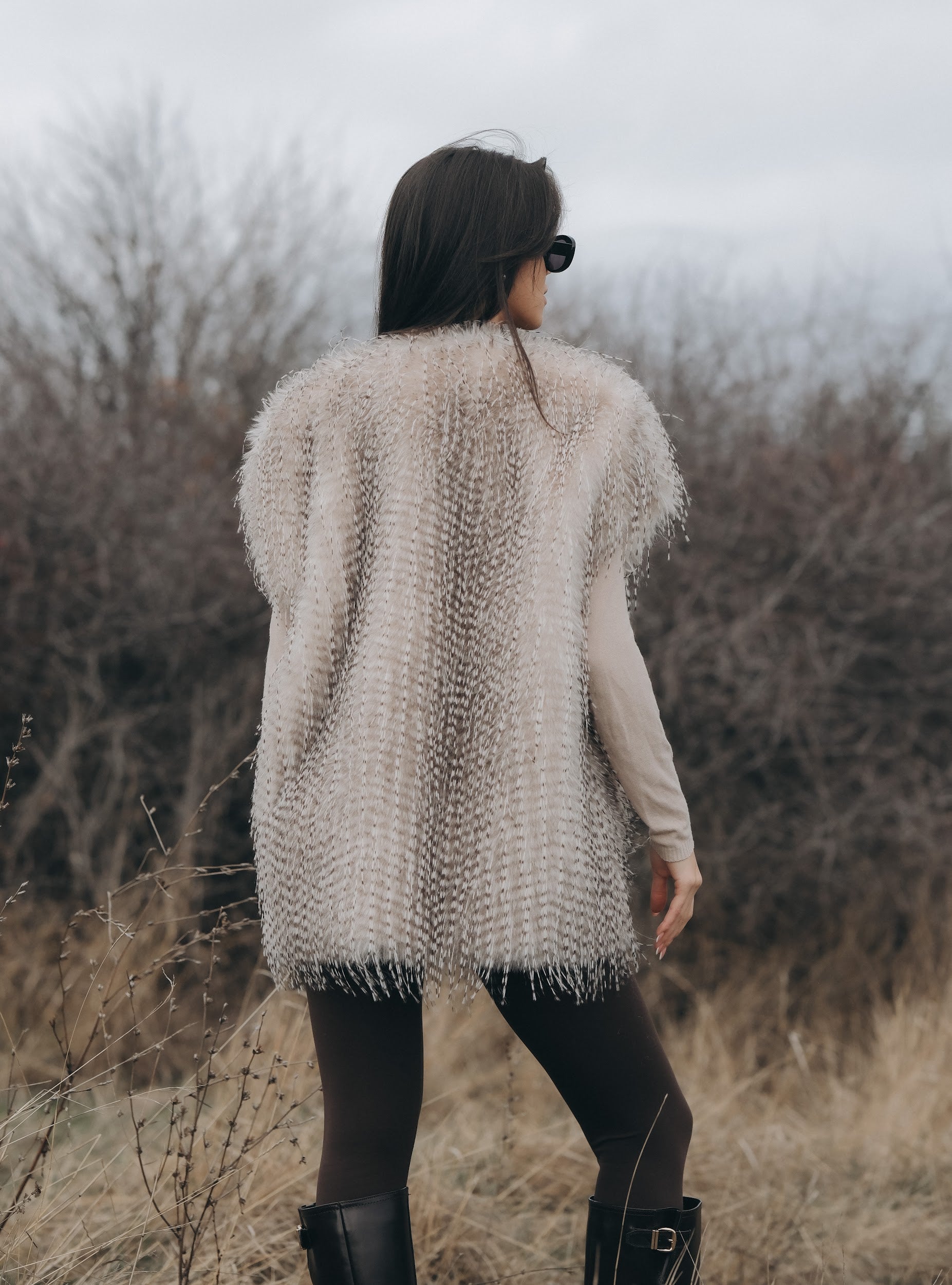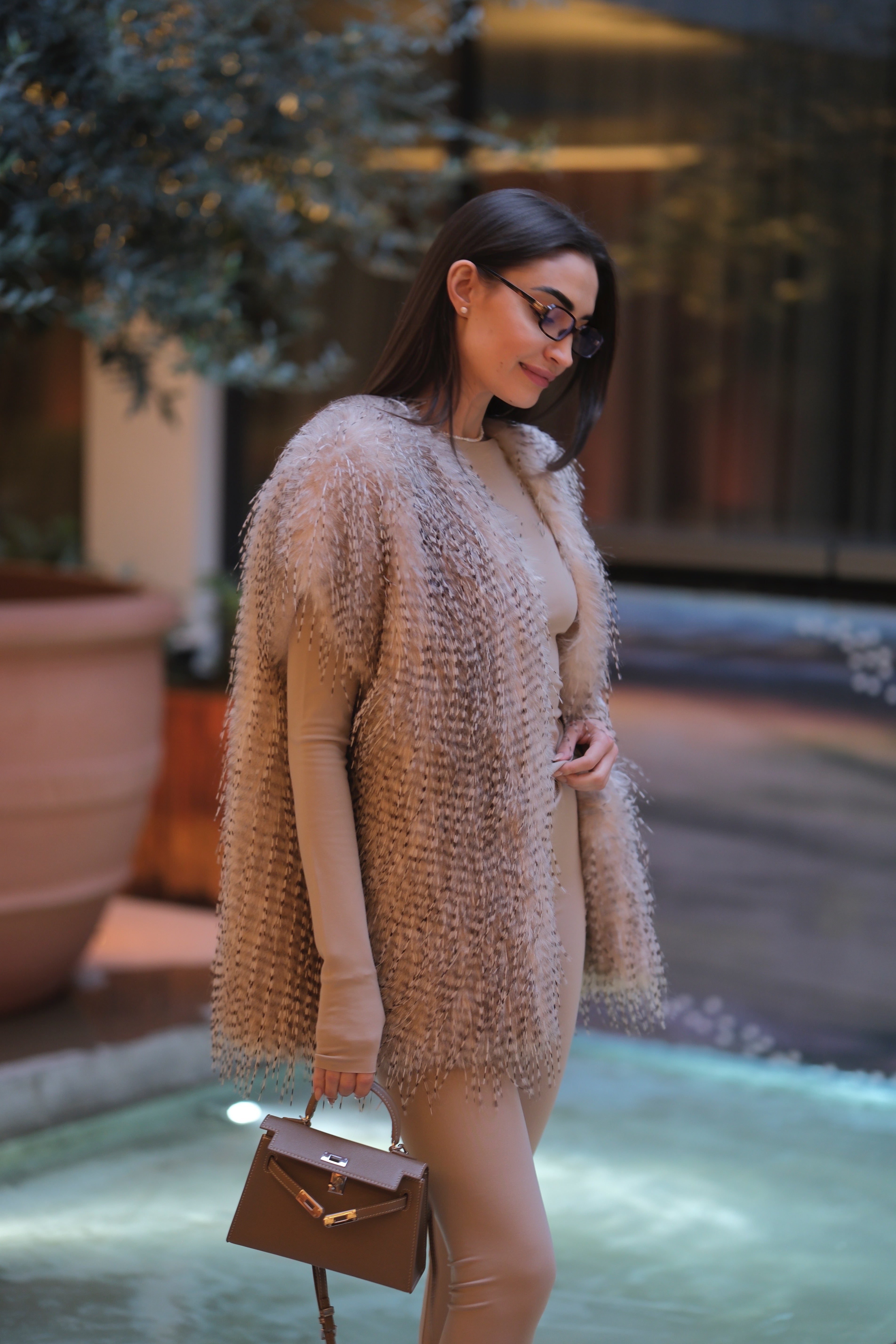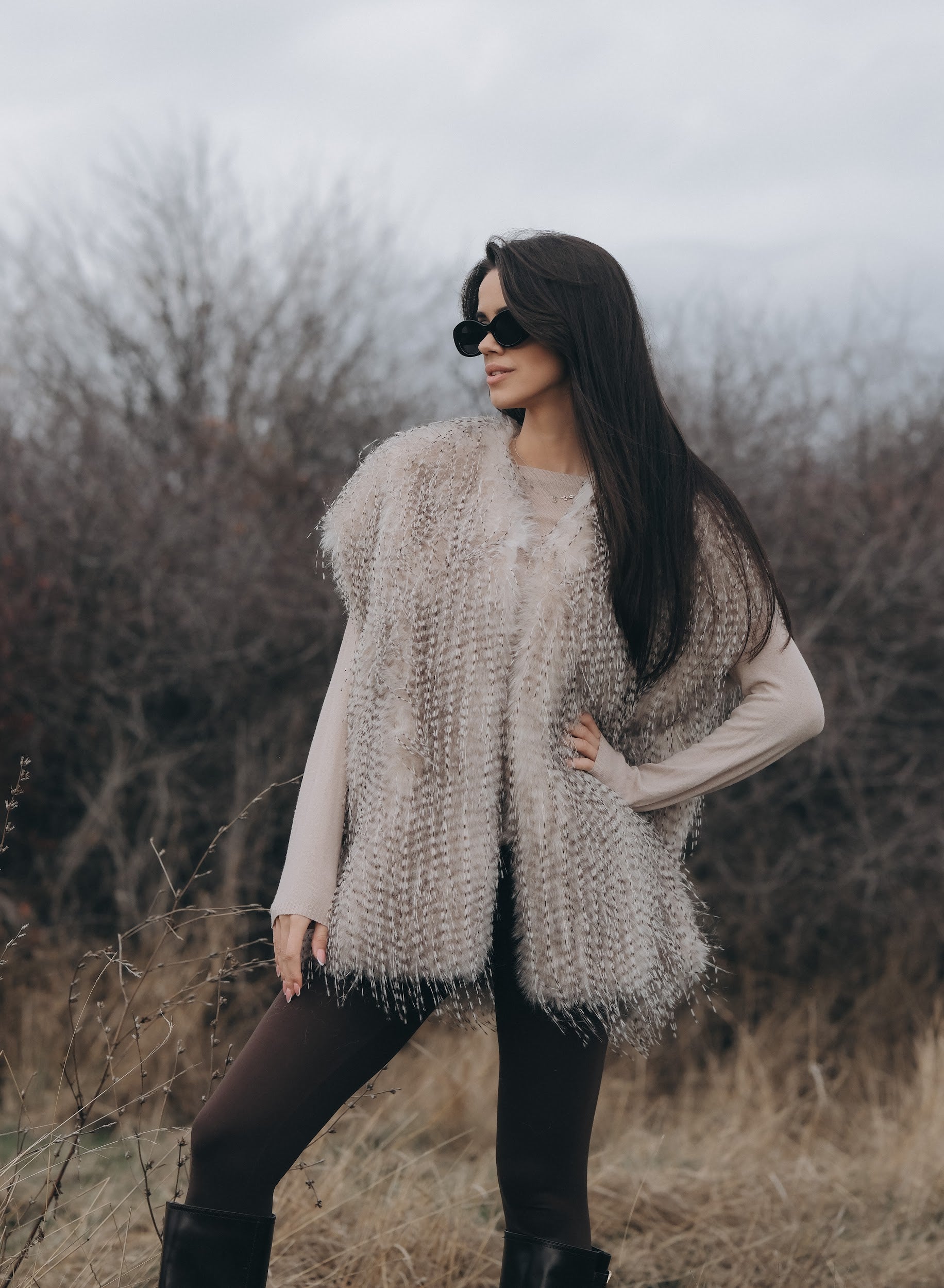 Ефектна къса жилетка, изработена от специални ресни с ефект на бодливо свинче. Къс ръкав тип наметка, дължина до към средата на бедрото и леко движение при всяка стъпка. Идеален завършек върху рокли, костюми и гащеризони. Дължина на наметалото - 75см.