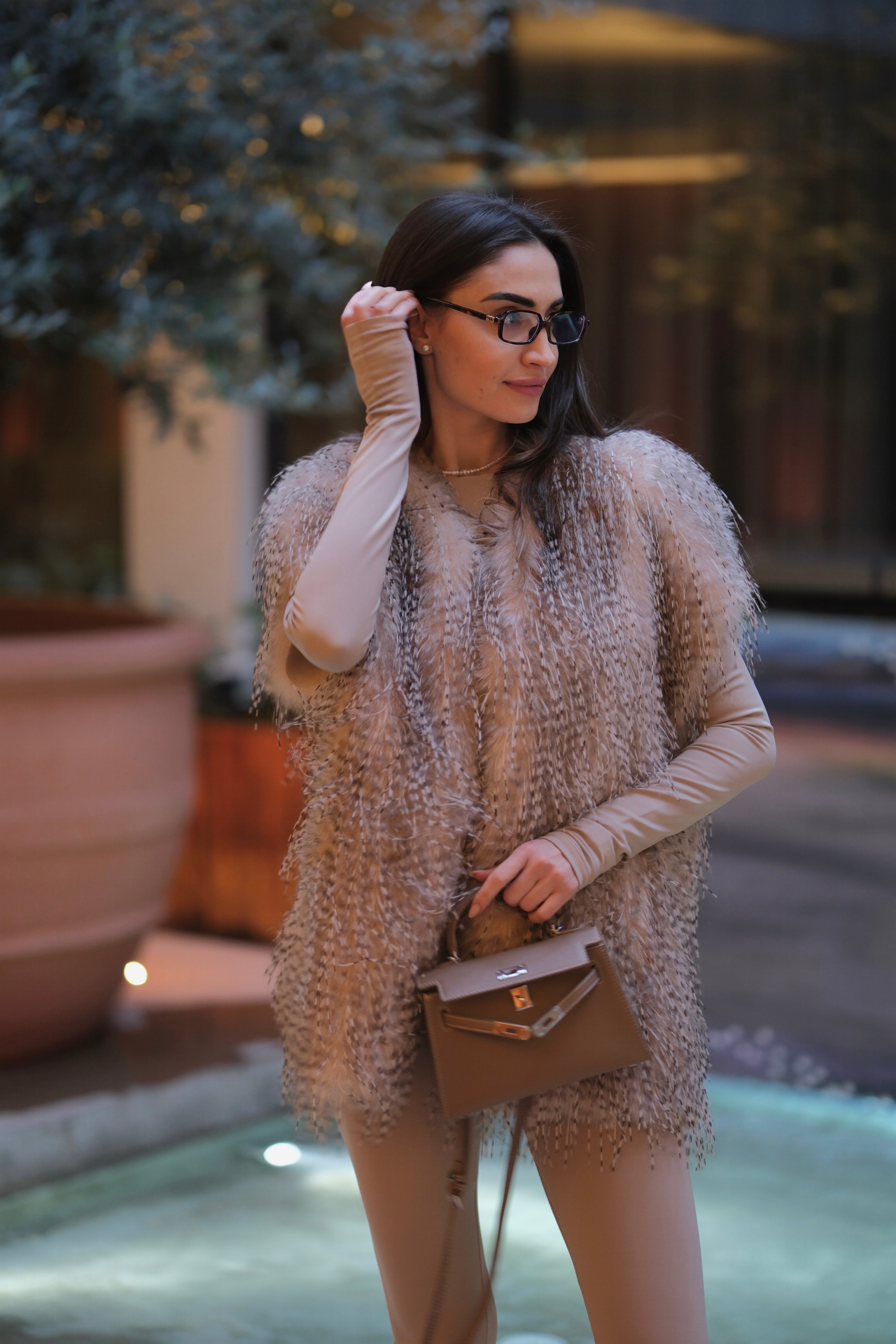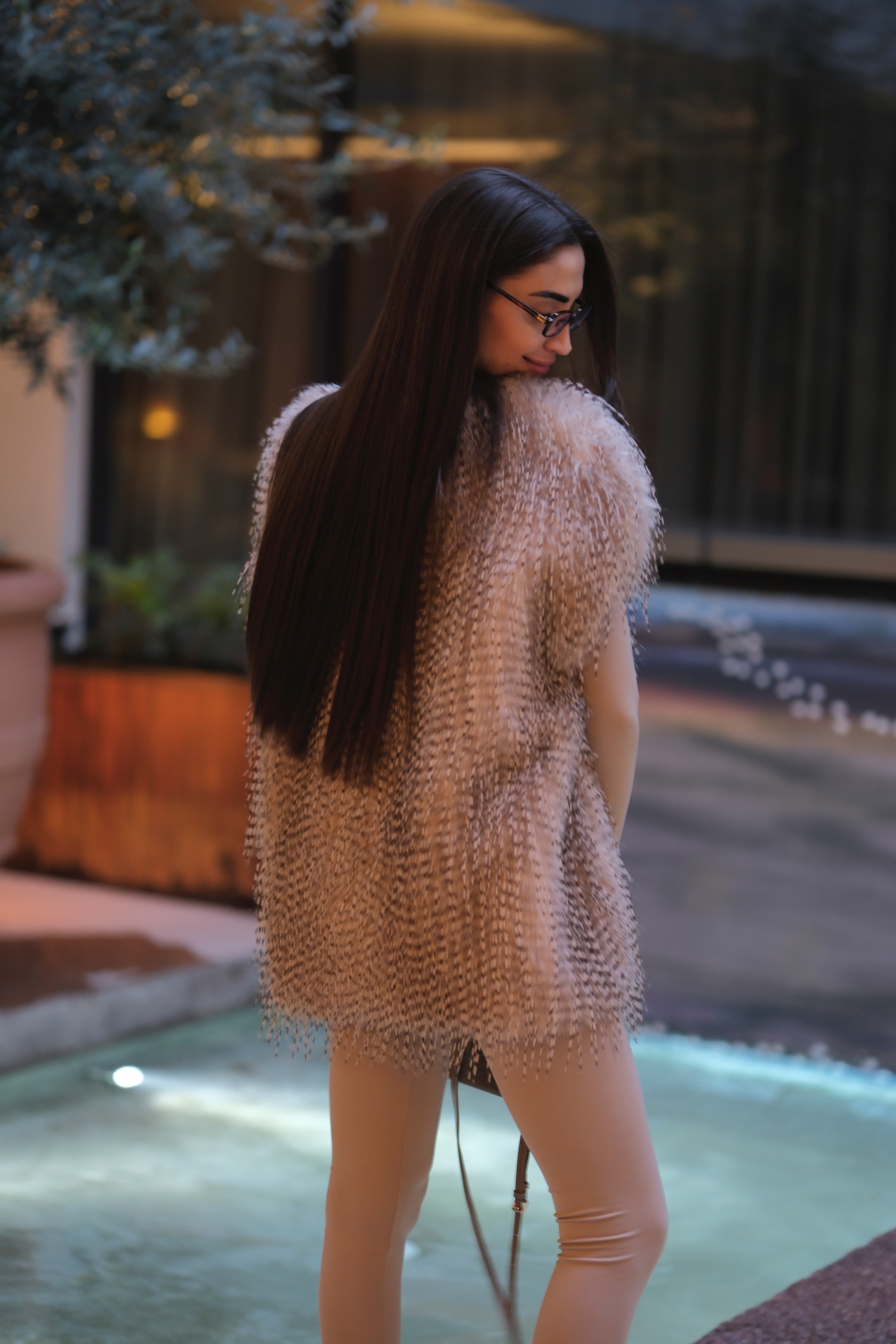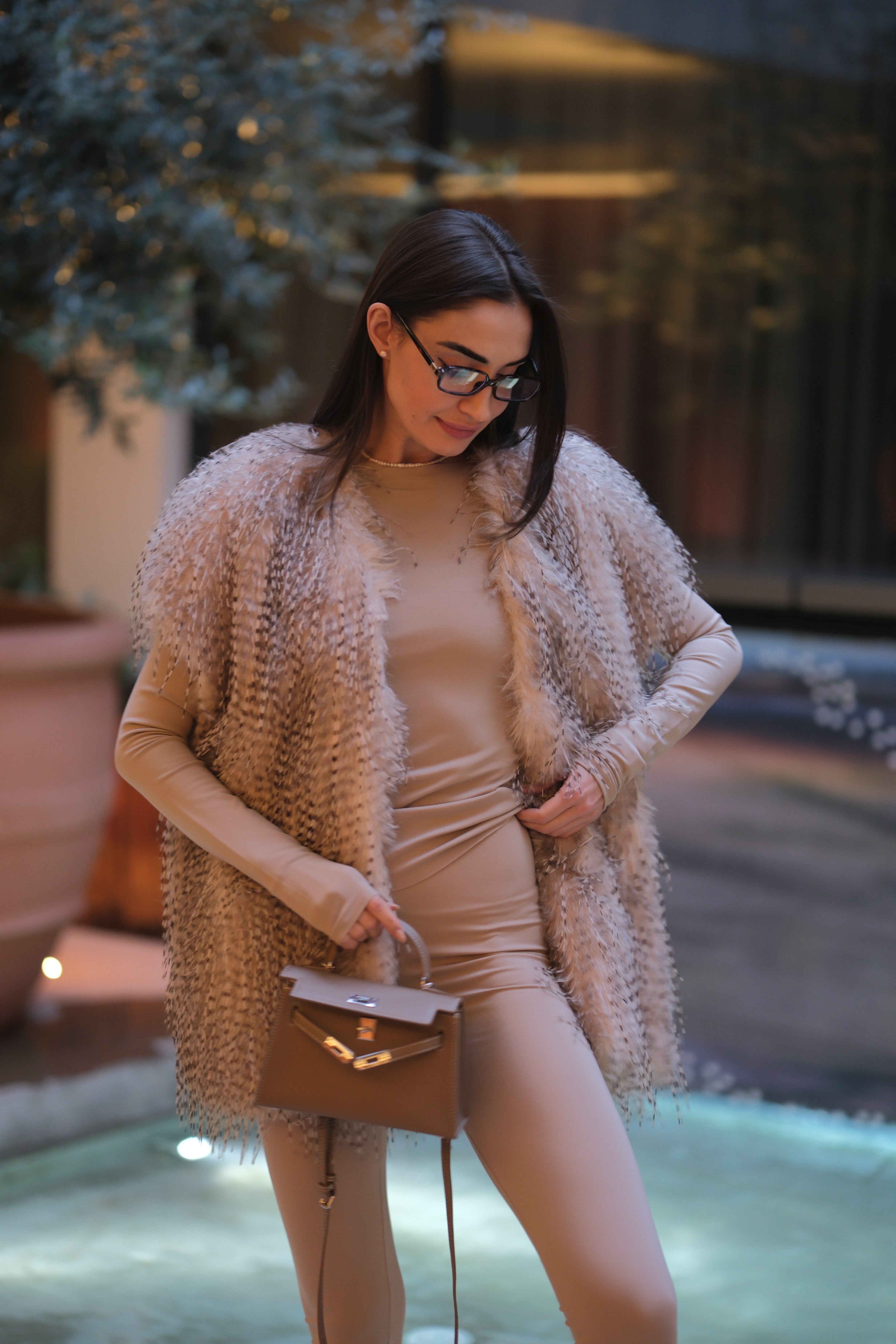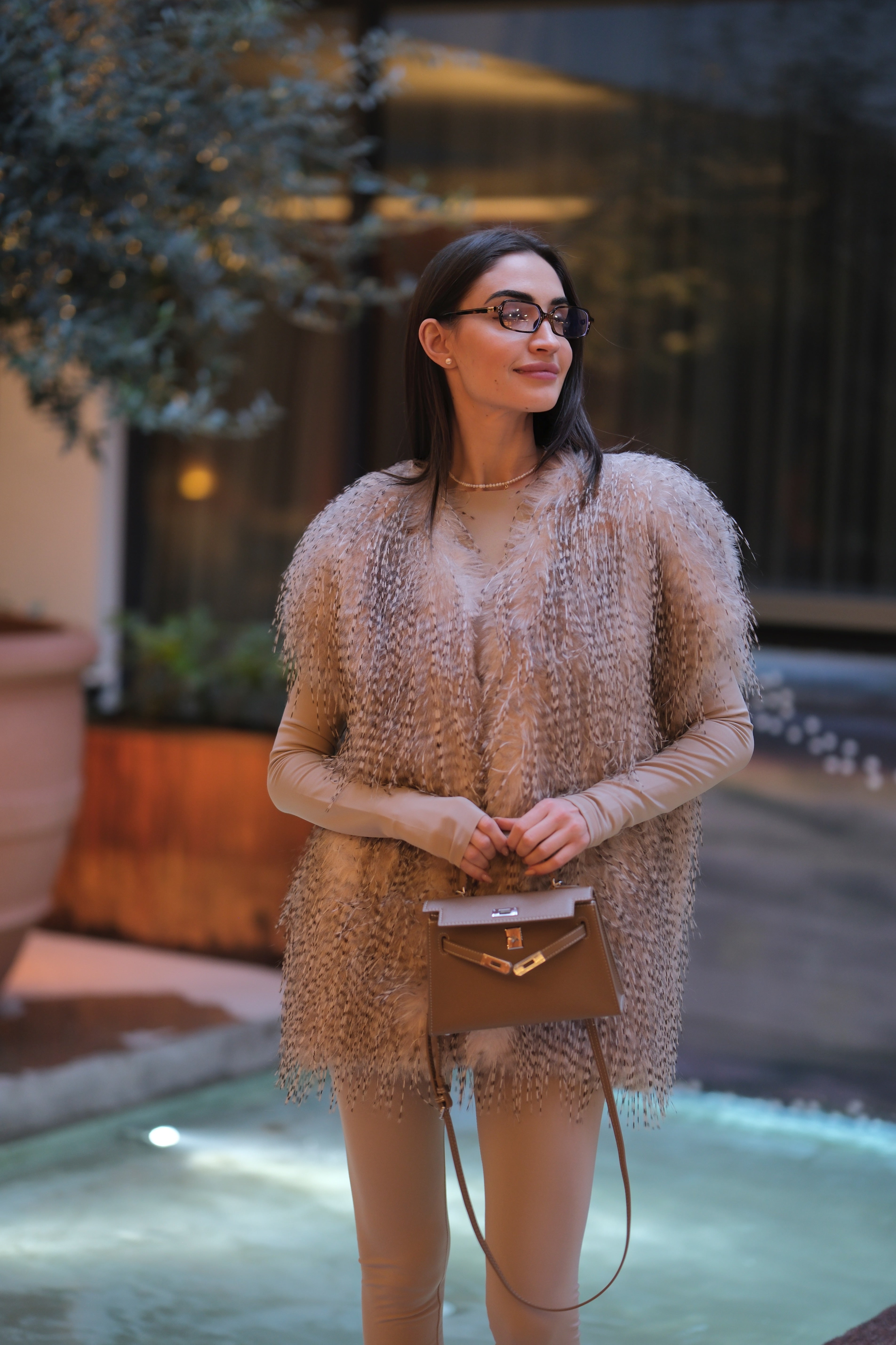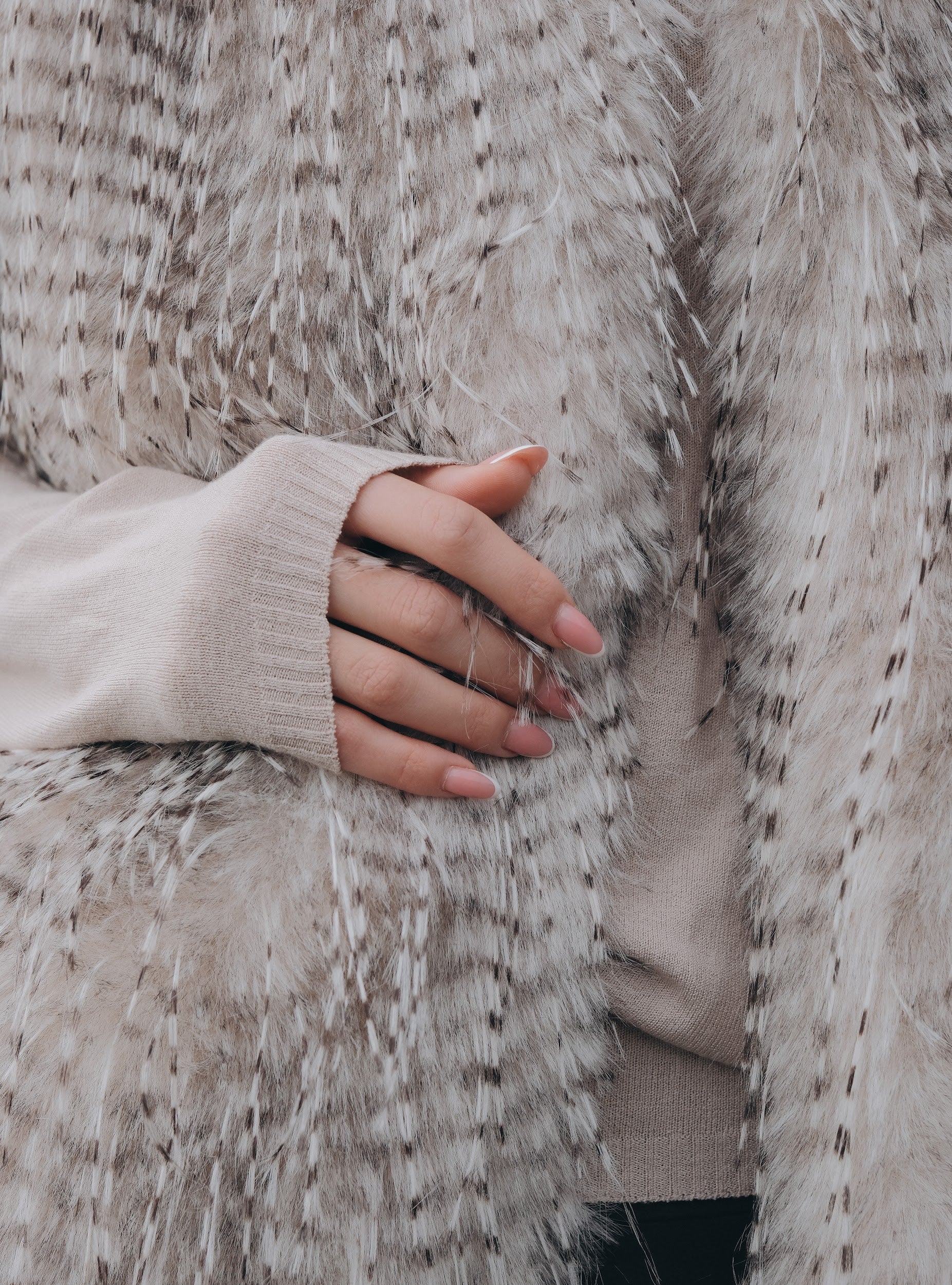 Ефектна къса жилетка, изработена от специални ресни с ефект на бодливо свинче. Къс ръкав тип наметка, дължина до към средата на бедрото и леко движение при всяка стъпка. Идеален завършек върху рокли, костюми и гащеризони. Дължина на наметалото - 75см.
