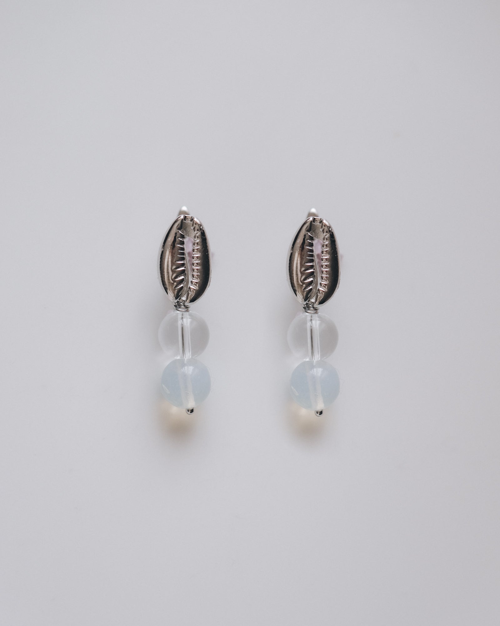 Елегантни обеци с акцент от декоративна мида и нежни полупрозрачни камъни в светли млечни и синкави нюанси. Обеците са леки и удобни за носене, подходящи както за ежедневни визии, така и като фин акцент към по-елегантен тоалет.