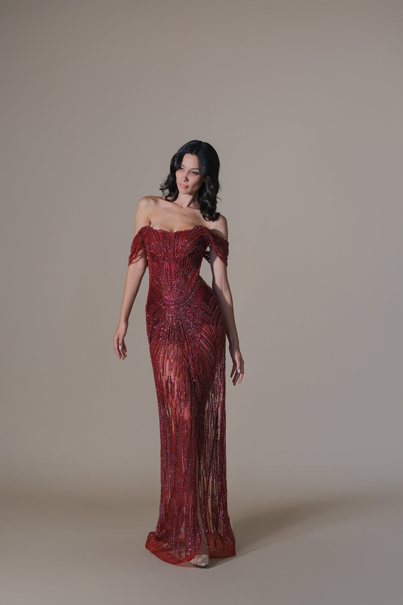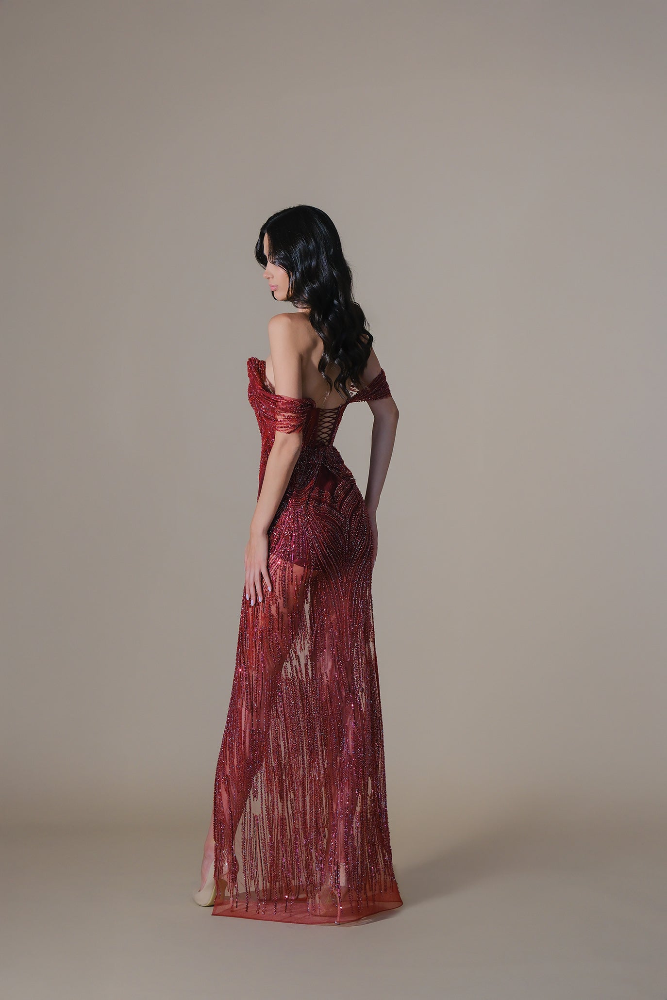 Вечерна рокля, която „рисува“ светлина по тялото. Горната част е тип корсет с подкрепяща конструкция и сърцевидно деколте, оформящо бюста. Раменете са ефектно спуснати, а линиите на нашитите кристали и стъклени мъниста се стичат вертикално и радиално, за да издължат силуета. Полата следва тялото и се спуска до пода с елегантен преден разрез за лекота на движението. Полупрозрачната дълга пола създава фин „nude“ ефект, като под нея има мини подплата/боди за комфорт и прикритие.