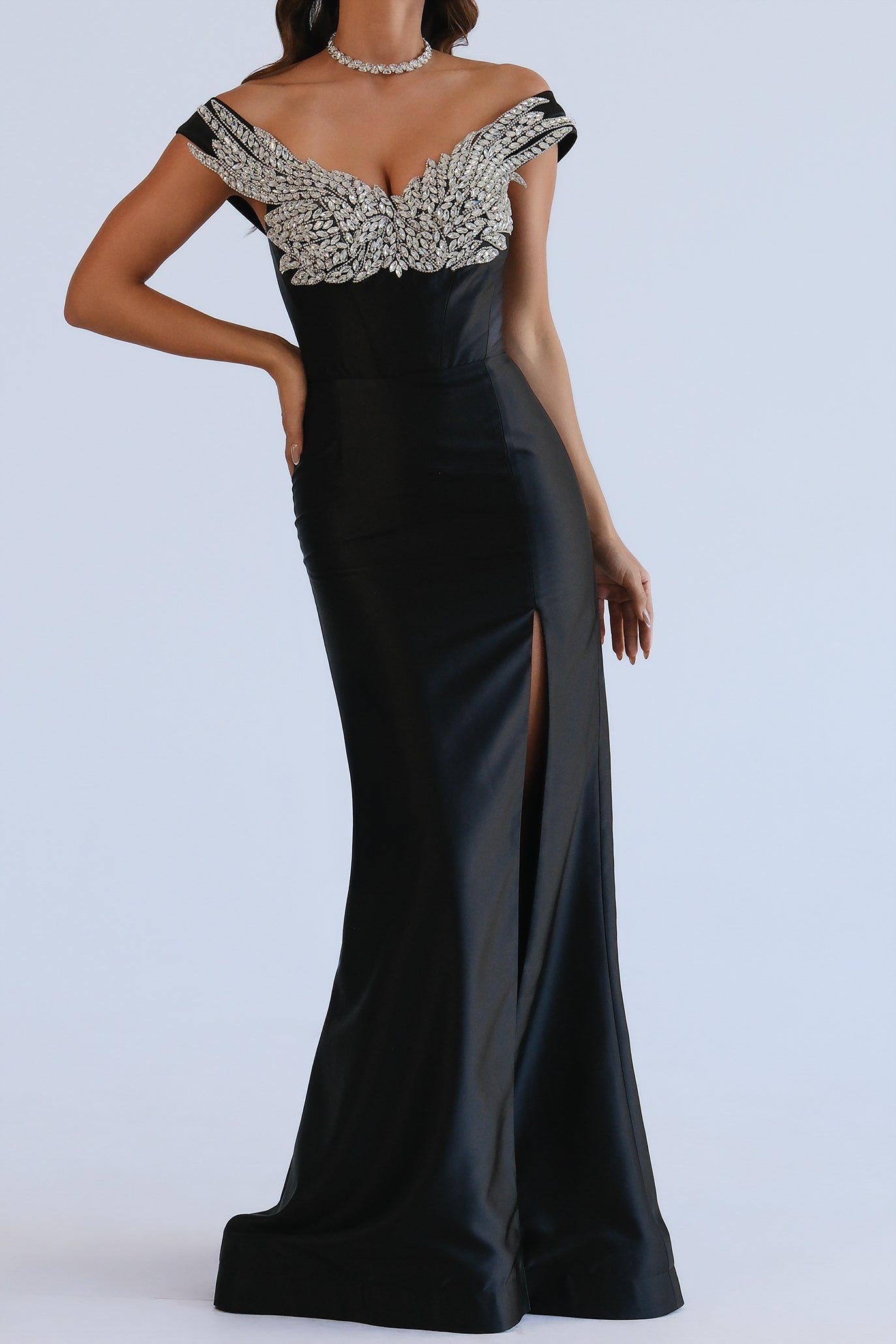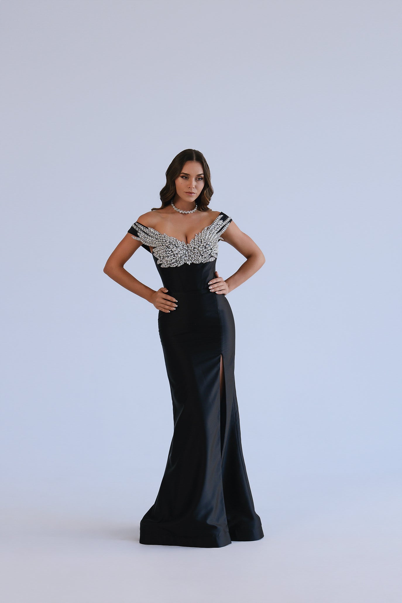 Вечерна рокля с изваяна корсетна горна част и широки презрамки, богато украсени с ръчно нашити кристали и пайети, които оформят ефектен 3D мотив около деколтето. Стегнатата талия преминава в дълга, прилепнала пола с висока цепка отпред за елегантен и издължен силует. Корсетът е със вградени банели и подплатени чашки за стабилност и поддръжка, а връзките на гърба позволяват прецизно напасване към фигурата. Материята е сатен с мек блясък; роклята е изцяло подплатена и не прозира. Продуктът пристига в персонализиран калъф за съхранение.