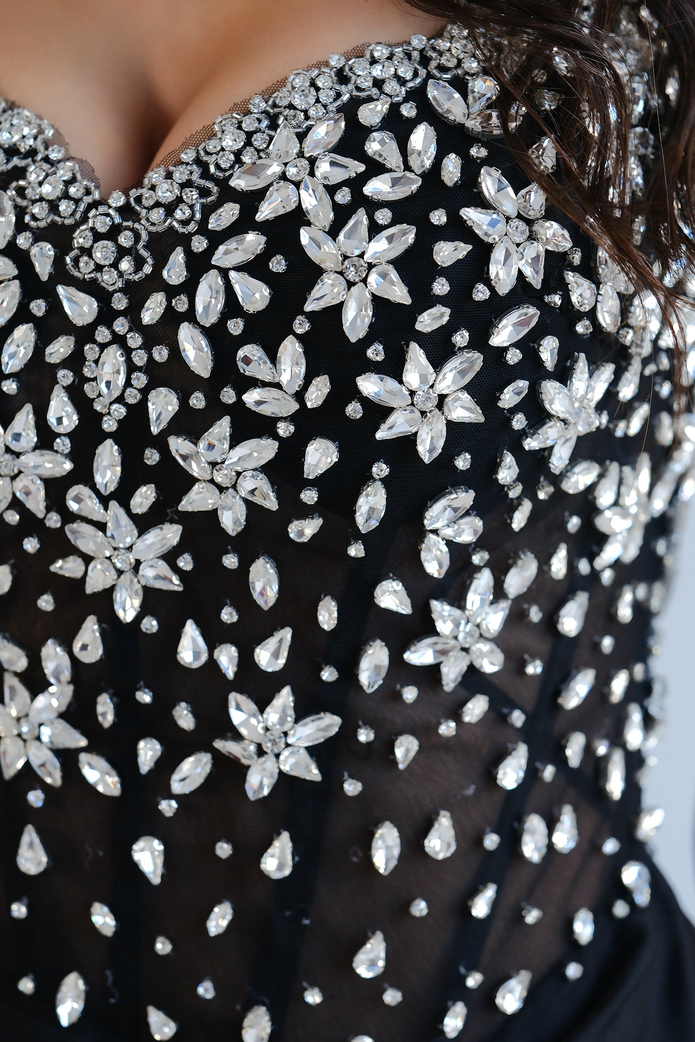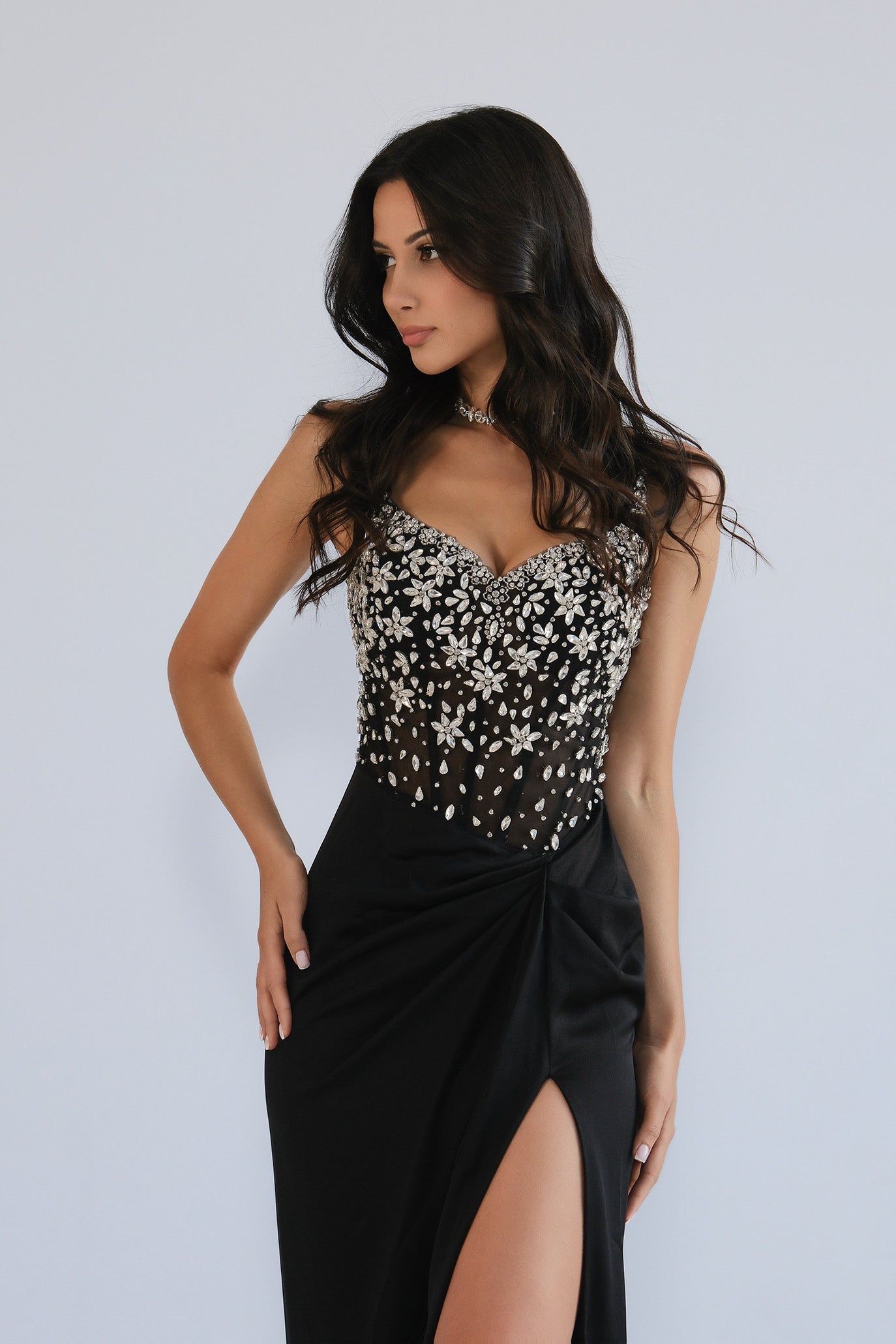 Елегантна дълга вечерна рокля с изваяна линия и висока цепка. Горната част е корсетна – богато декорирана с кристали и камъни във флорални мотиви, с искрящи презрамки и вградени чашки за сигурна поддръжка. С деколте, подчертаващо бюста. Полата е от фин сатен с красив драпаж по бедрото, прилепнала по тялото и завършваща с лек шлейф за ефектно падане. Продуктът пристига в персонализиран калъф.
