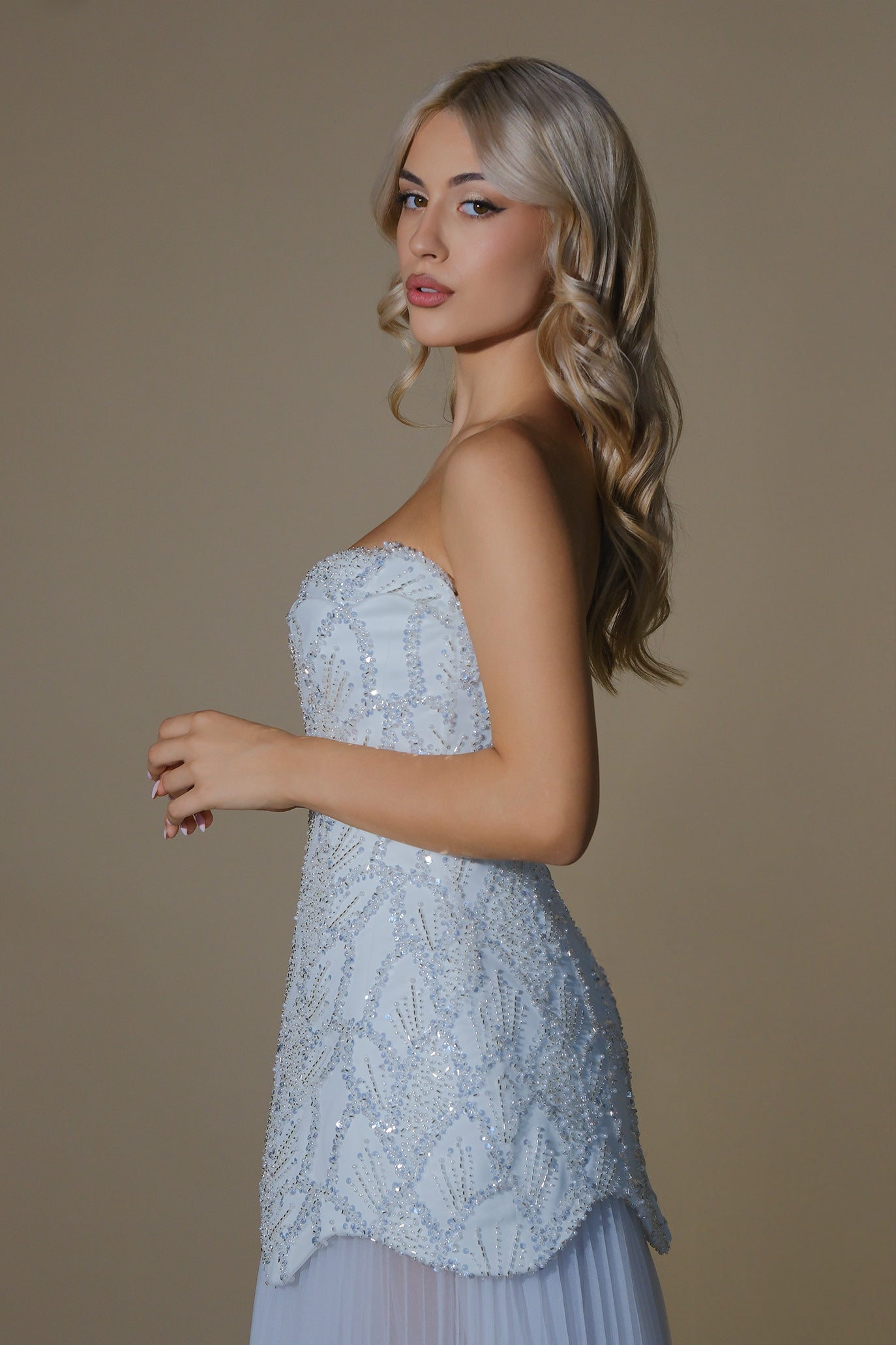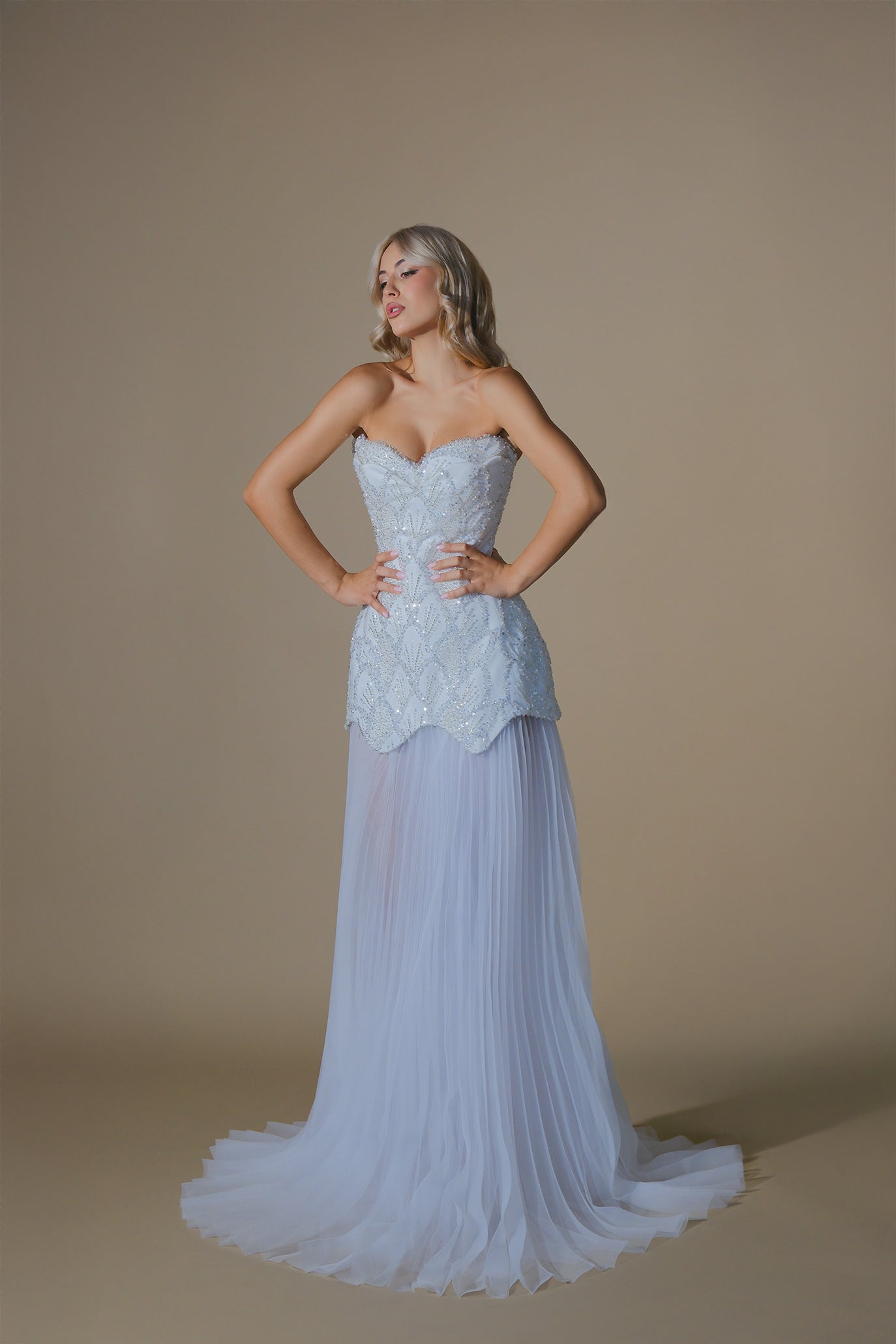 Впечатляваща вечерна рокля, изцяло ръчно изработена. Моделът е с дължина до пода и силует русалка, който елегантно издължава фигурата. Горната част е корсет със сърцевидно деколте, нестандартна издължена форма и връзки на гърба, които осигуряват перфектно прилягане към тялото. Оформя талията и придава стабилност. Върху ханша пада асиметричен пеплум с лек обем. Долната част е оформена в свободна пола от полупрозрачен плисиран тюл, създаващ ефект на движение.
