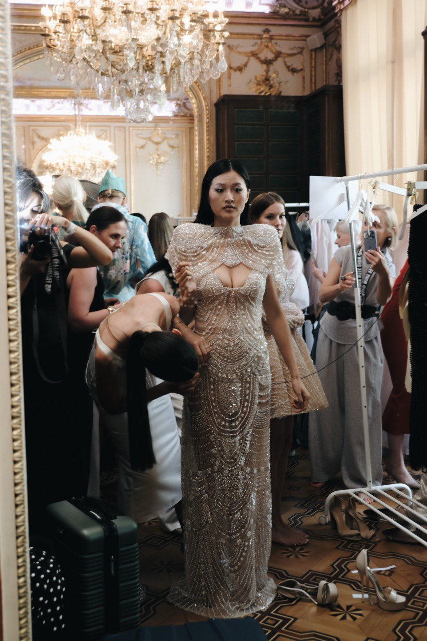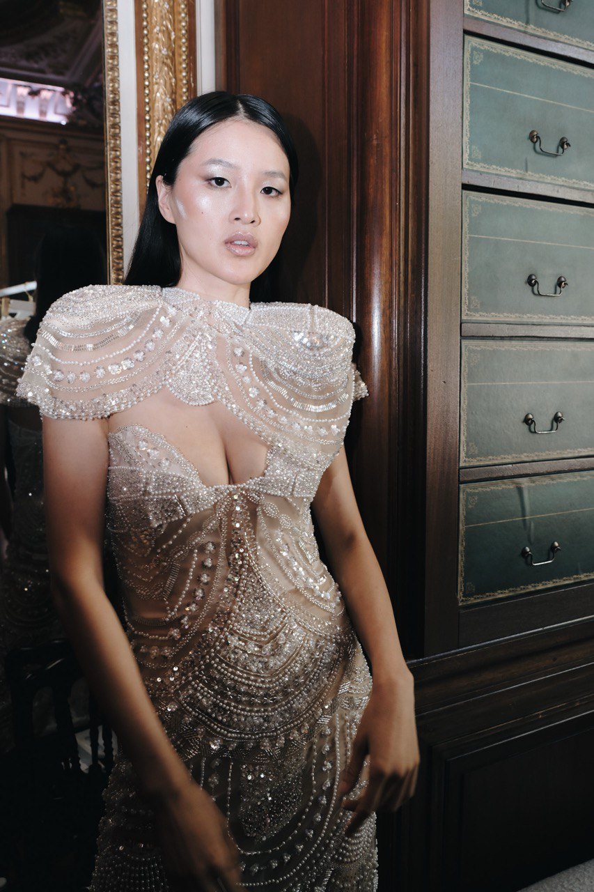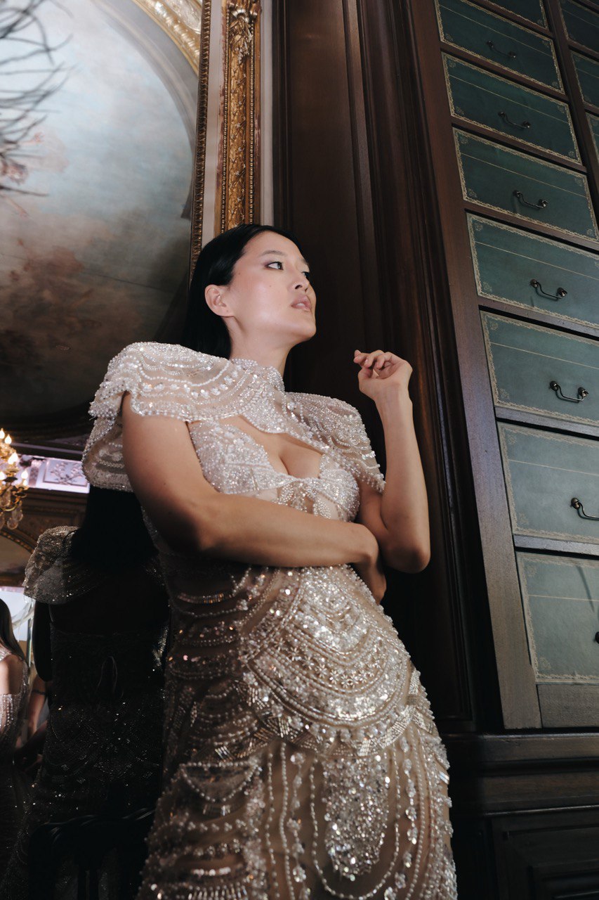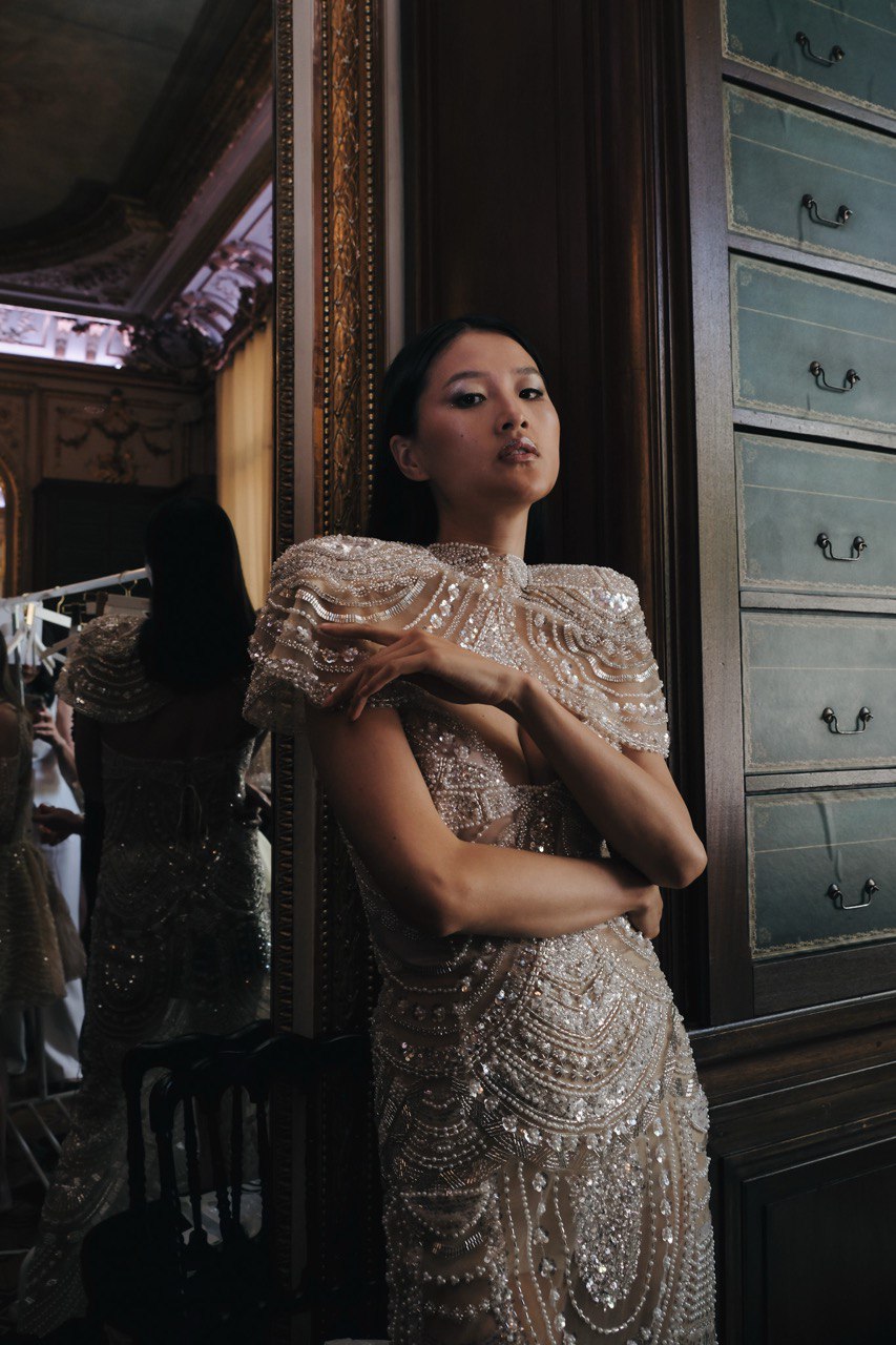 Впечатляваща вечерна рокля с ефектна пелерина от фин тюл с перли, пайети и кристали. Корсетната горна част е с твърда конструкция и елегантен изрез, които подчертават деколтето и стойката. Силуетът следва линията на тялото и завършва с дължина до пода за максимален блясък и присъствие.