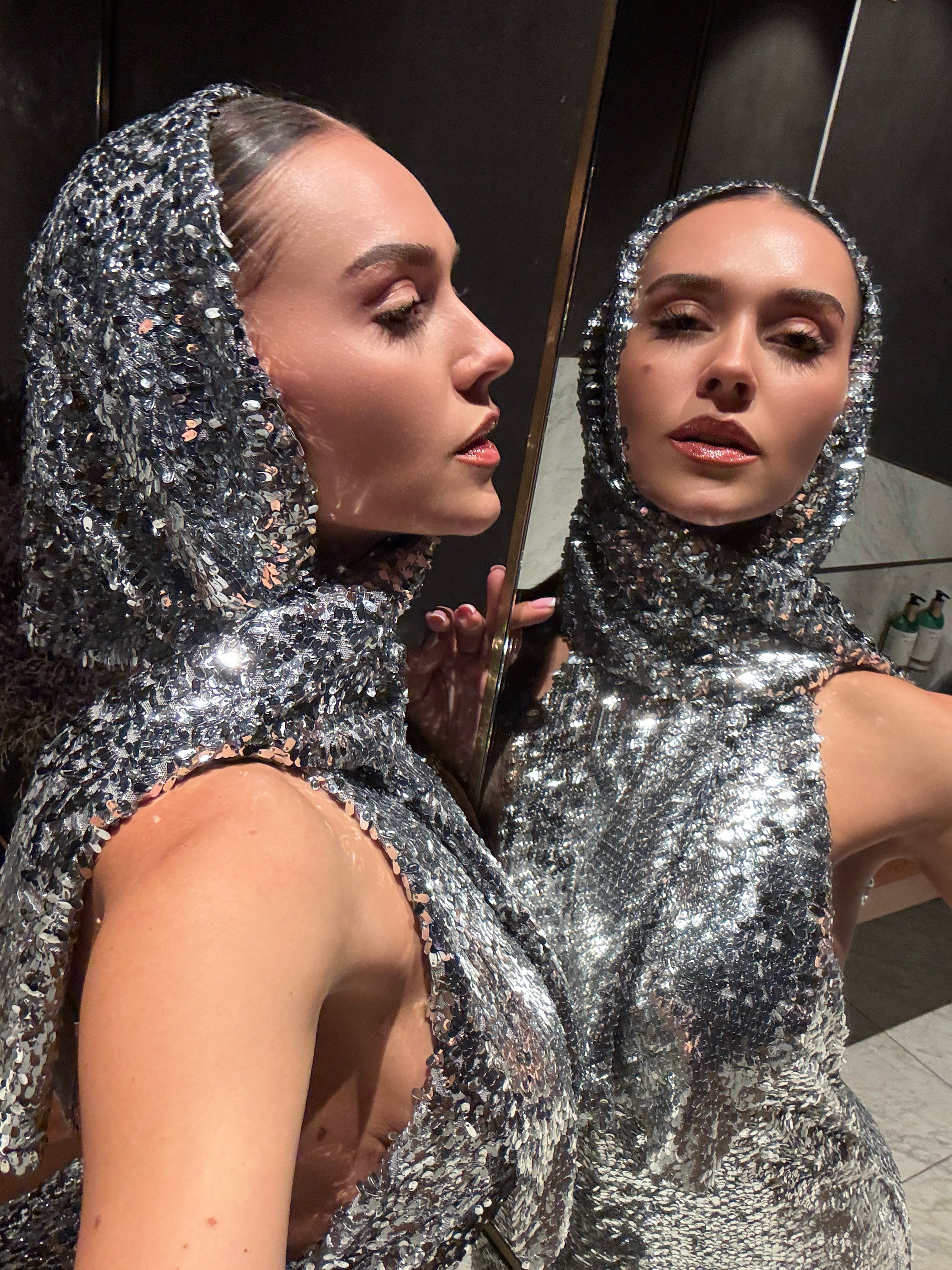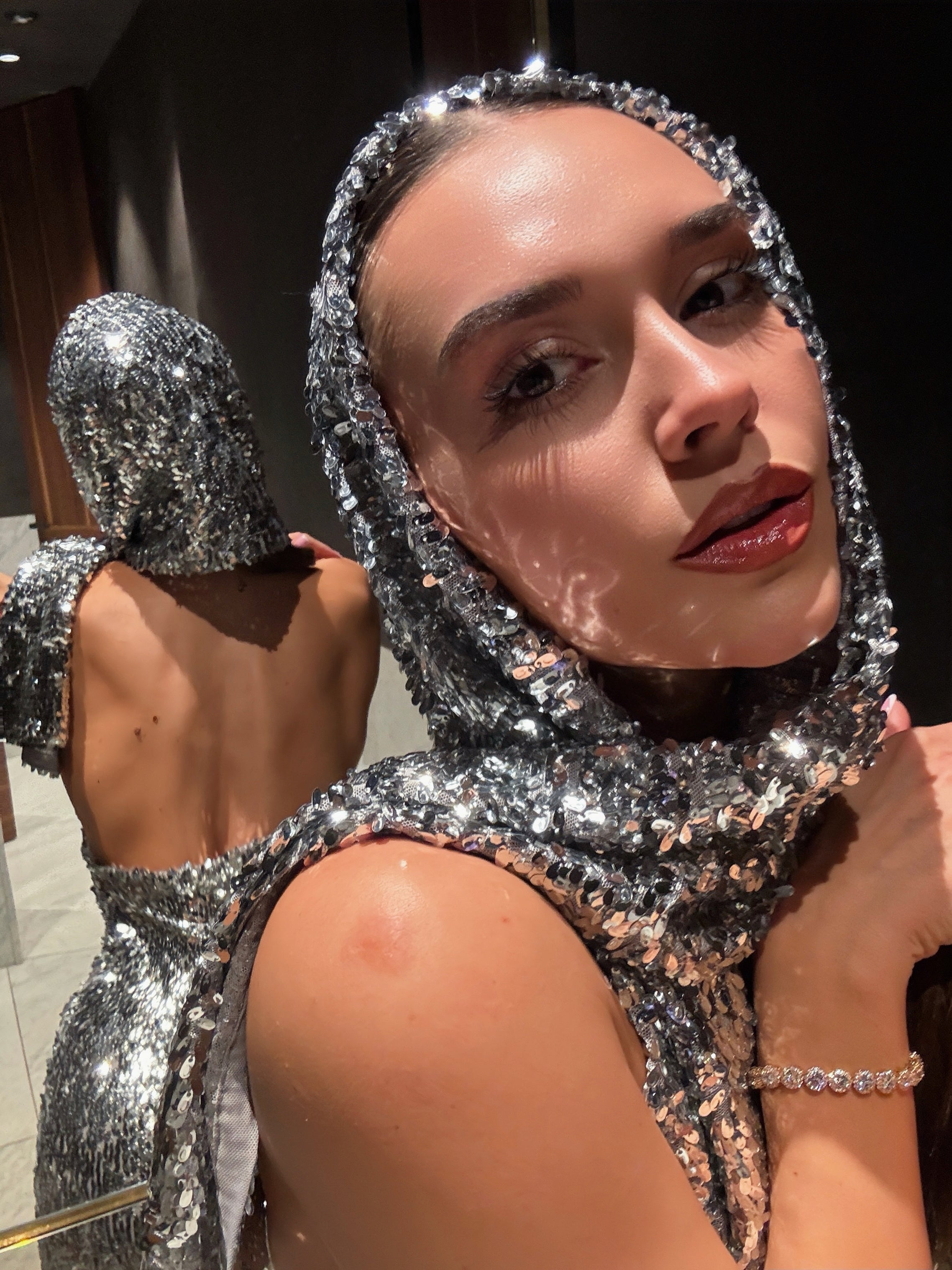 Дълга рокля, изработена от висококачествен еластичен специален плат с безброй пайети, който следва извивките на тялото и придава блясък. Кройката е с халтер деколте и гол гръб с извивка. Има мека подплата и силует тип русалка за пълен комфорт през цялата вечер. Може да се добави тип шал от същата материя с пайети срещу допълнително заплащане.