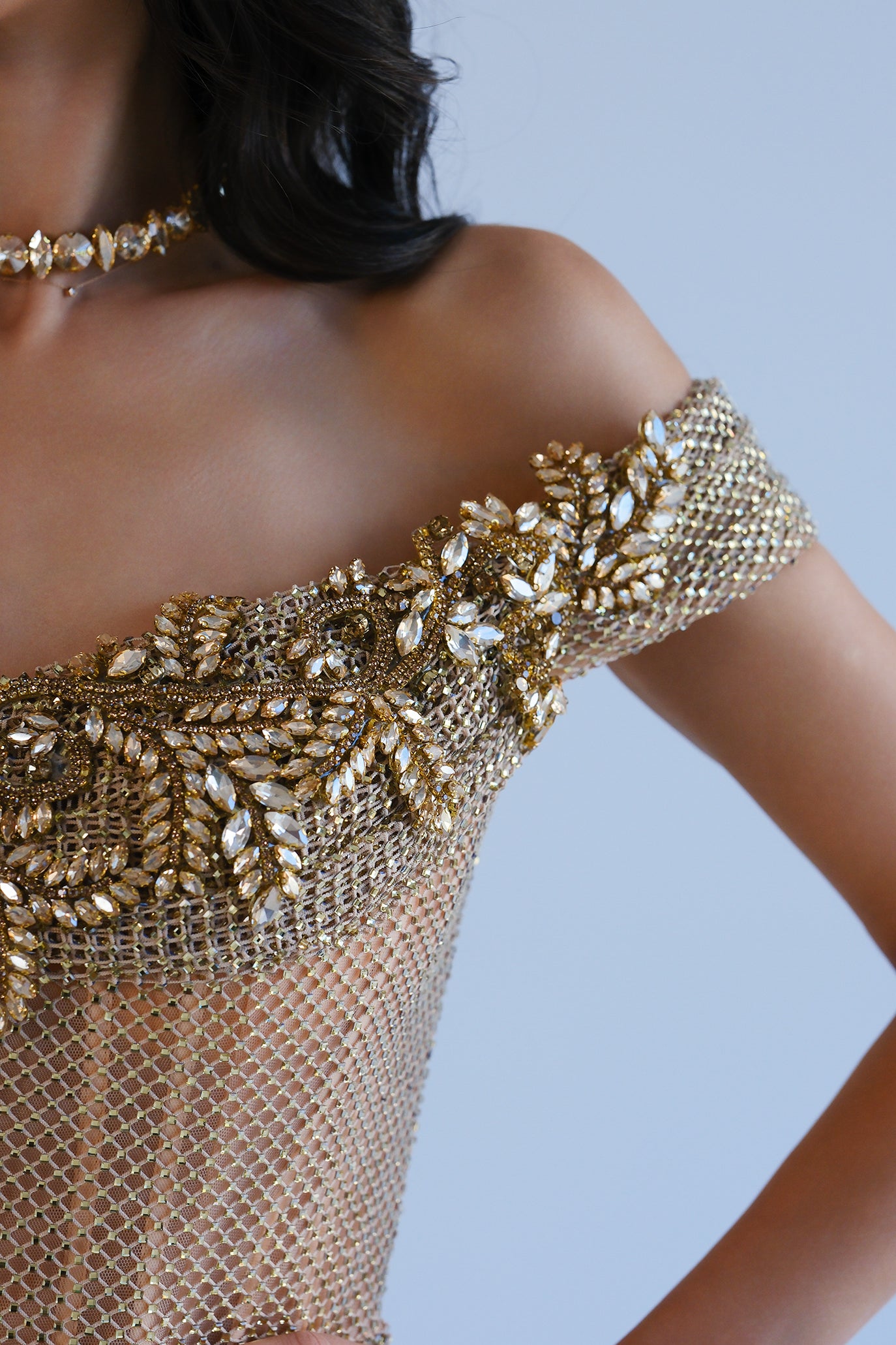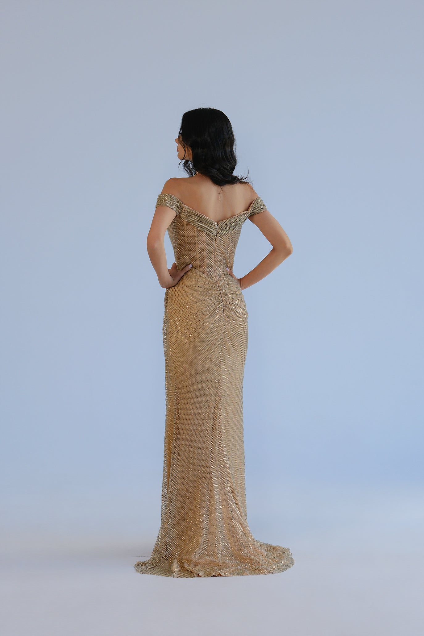 Елегантна дълга вечерна рокля с off-shoulder деколте и изящно декориран корсет. Горната част е полупрозрачна с фини банели и ръчно нашити кристали в златна гама, които преливат като бижу около бюста и раменете. Полата е по тялото с ефектно драпиране на бедрото, висока цепка отпред и лек шлейф за удължен силует. Моделът е изработен от златист плат с микропайети, който дава интензивен блясък и комфорт при движение. Вградени чашки и тънка подплата за стабилност и удобство. Продуктът пристига в персонализиран калъф.
