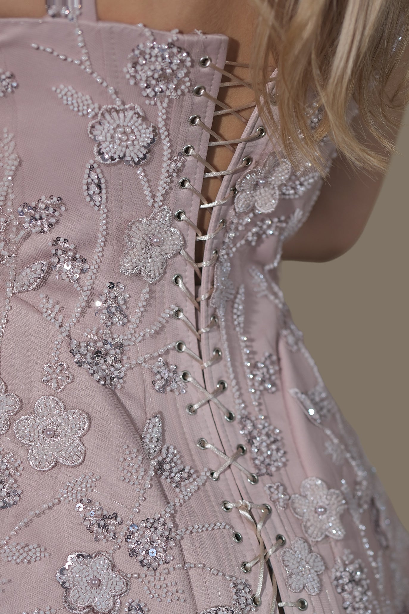 Комплект от корсет и пола, изработен изцяло на ръка. Корсетът е със структурирана корсетна конструкция и оформени чашки, които повдигат и подчертават бюста. Регулиращото връзване на гърба позволява перфектно прилягане към талията. Богато нашит е с флорална апликация, а пеплумът в долната част моделира ефект „пясъчен часовник“ и придава елегантен обем. Полата е с прав силует до средата на прасеца, изработена от гладък сатениран плат, с цепка отзад за свобода на движение.