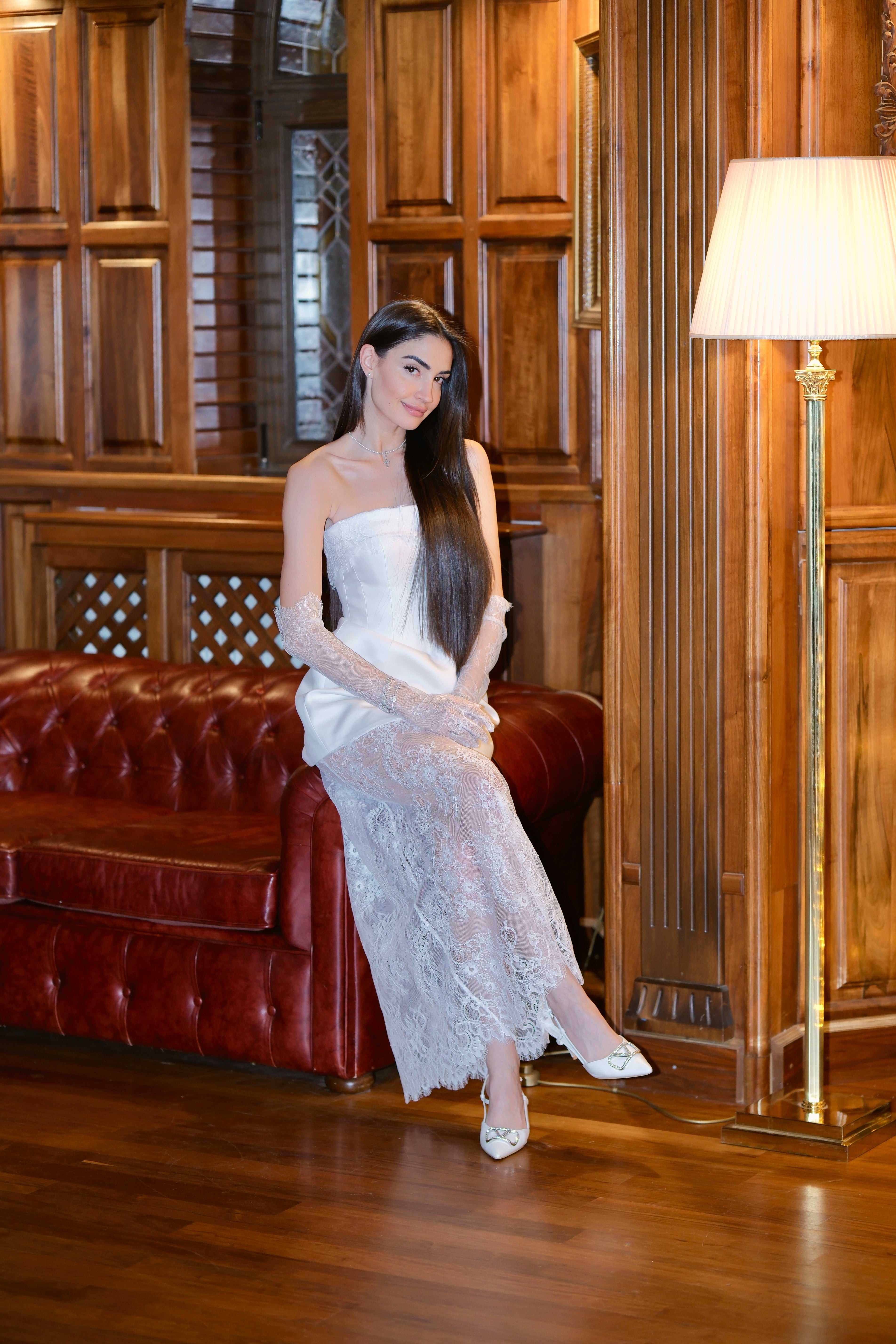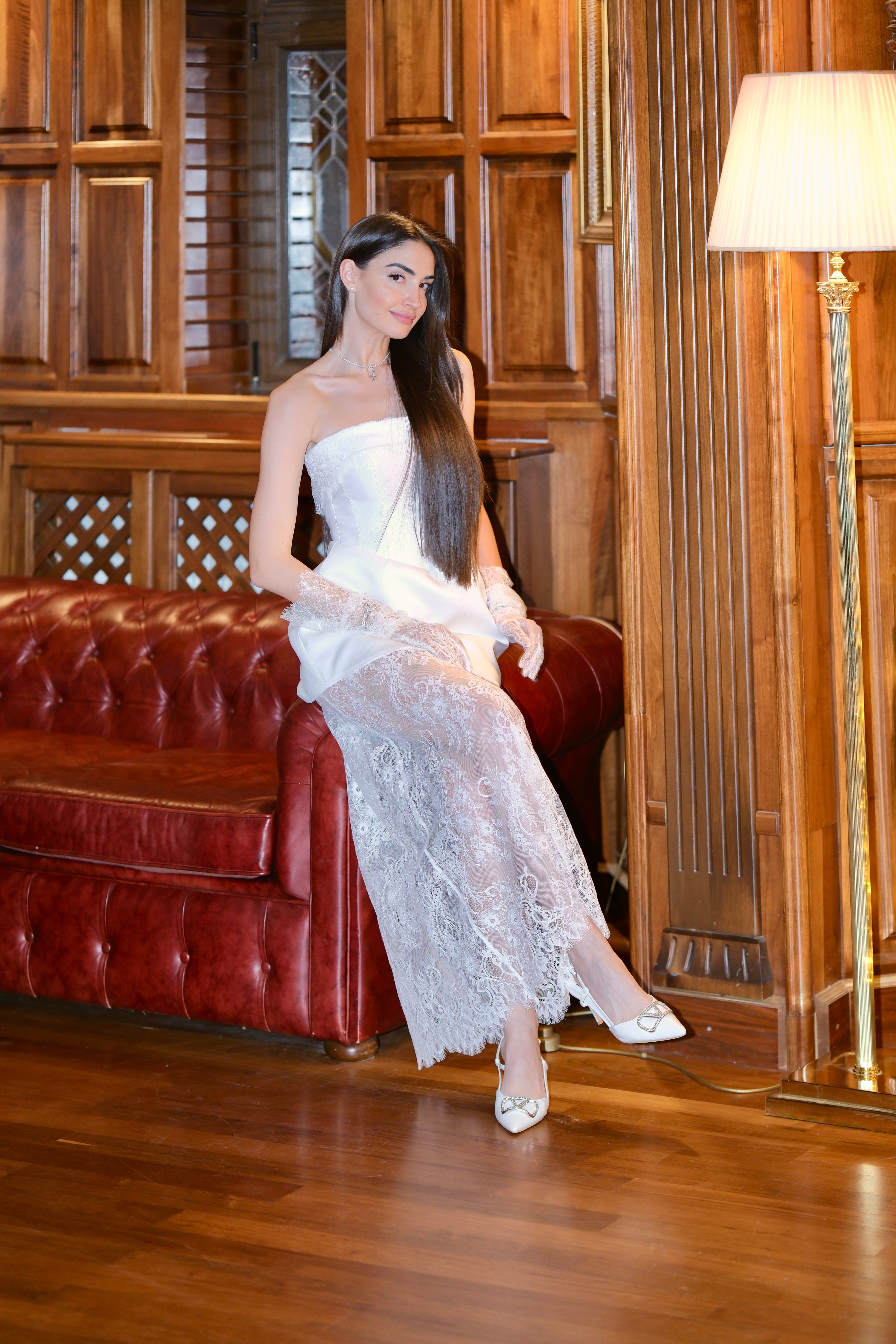 Изискана и елегантна къса рокля с корсет и прозрачни дантелени панели. Горната част на роклята е изработена от луксозен сатен, който приляга по тялото, подчертавайки контурите, а корсетното завръзване в задната част осигурява перфектно прилягане и комфорт. Долната част на роклята е от нежна дантела, която създава ефирен ефект.