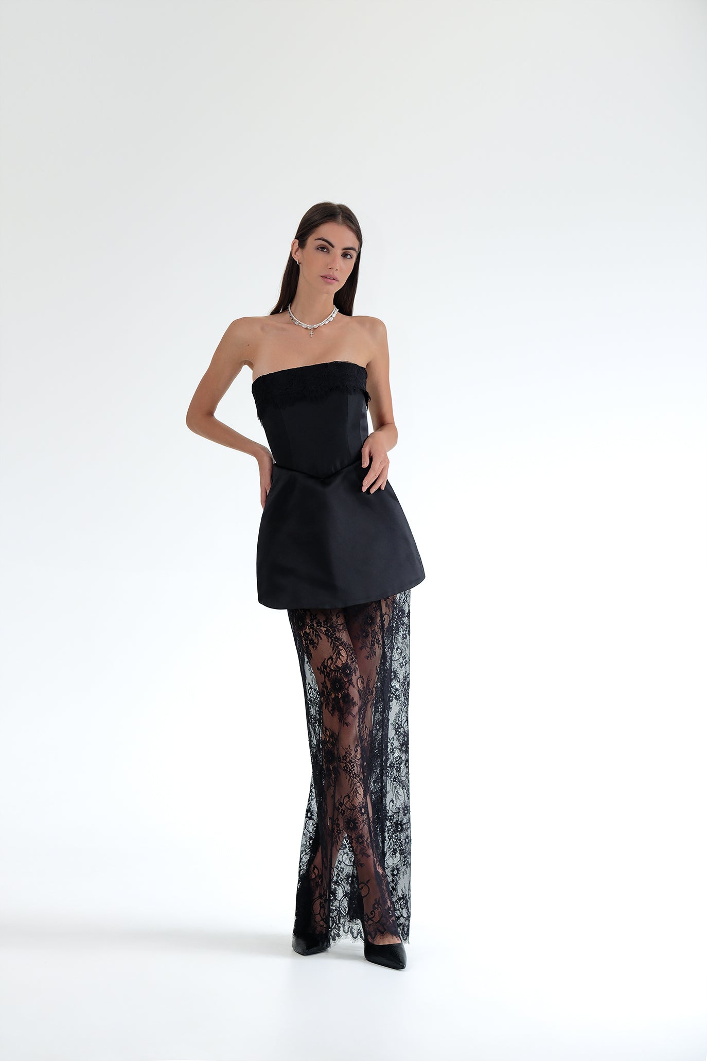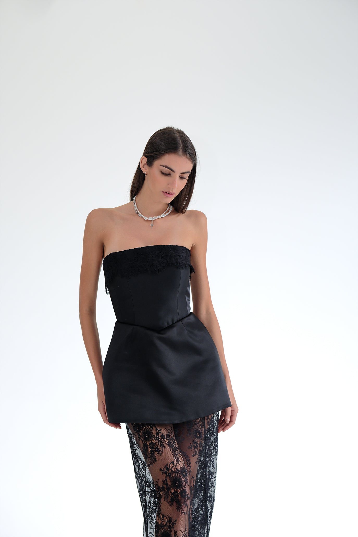 Изискана и елегантна къса рокля с корсет и прозрачни дантелени панели. Горната част на роклята е изработена от луксозен сатен, който приляга по тялото, подчертавайки контурите, а корсетното завръзване в задната част осигурява перфектно прилягане и комфорт. Долната част на роклята е от нежна дантела, която създава ефирен ефект.