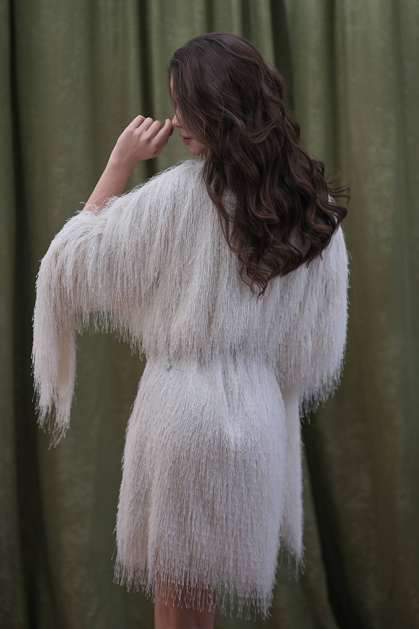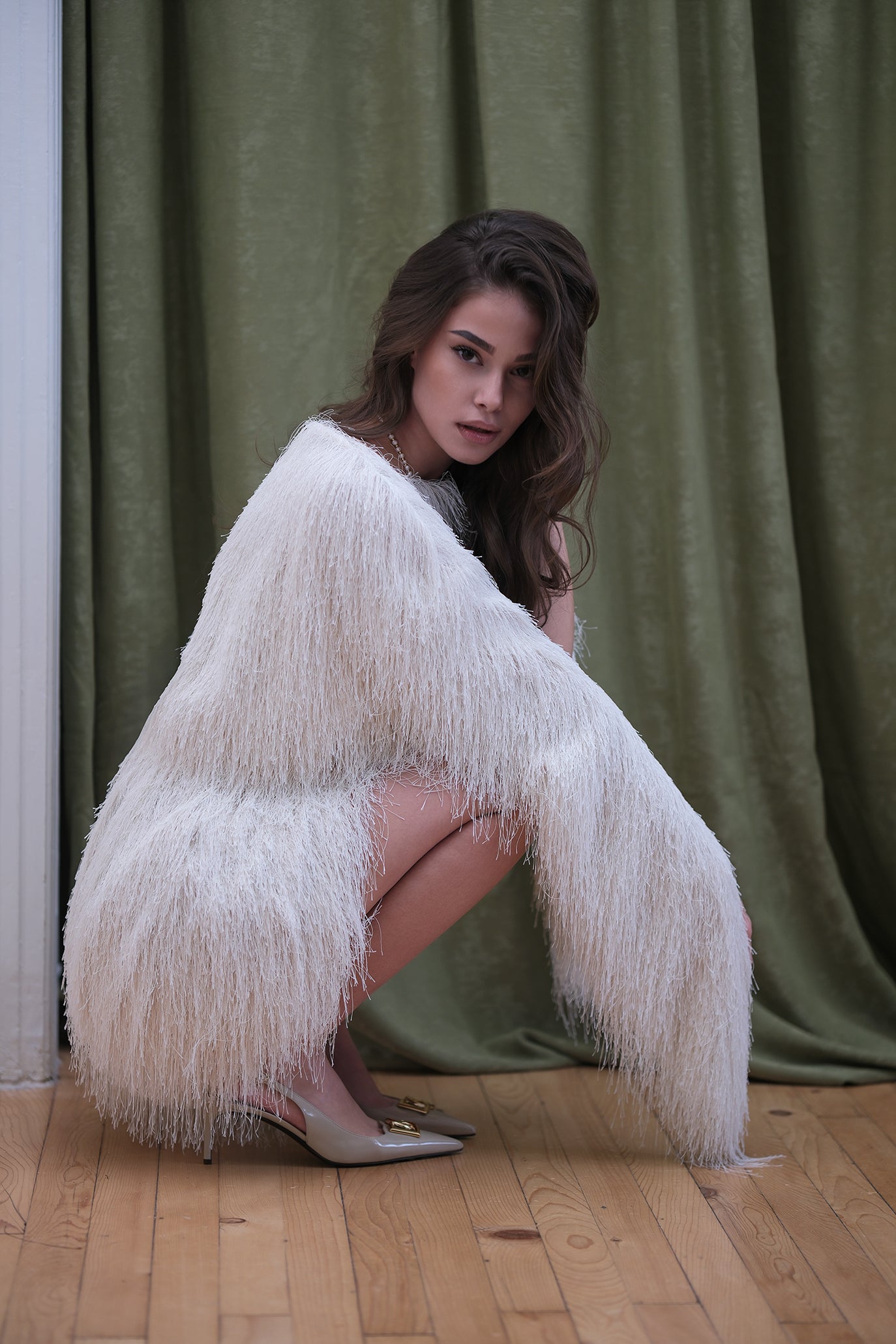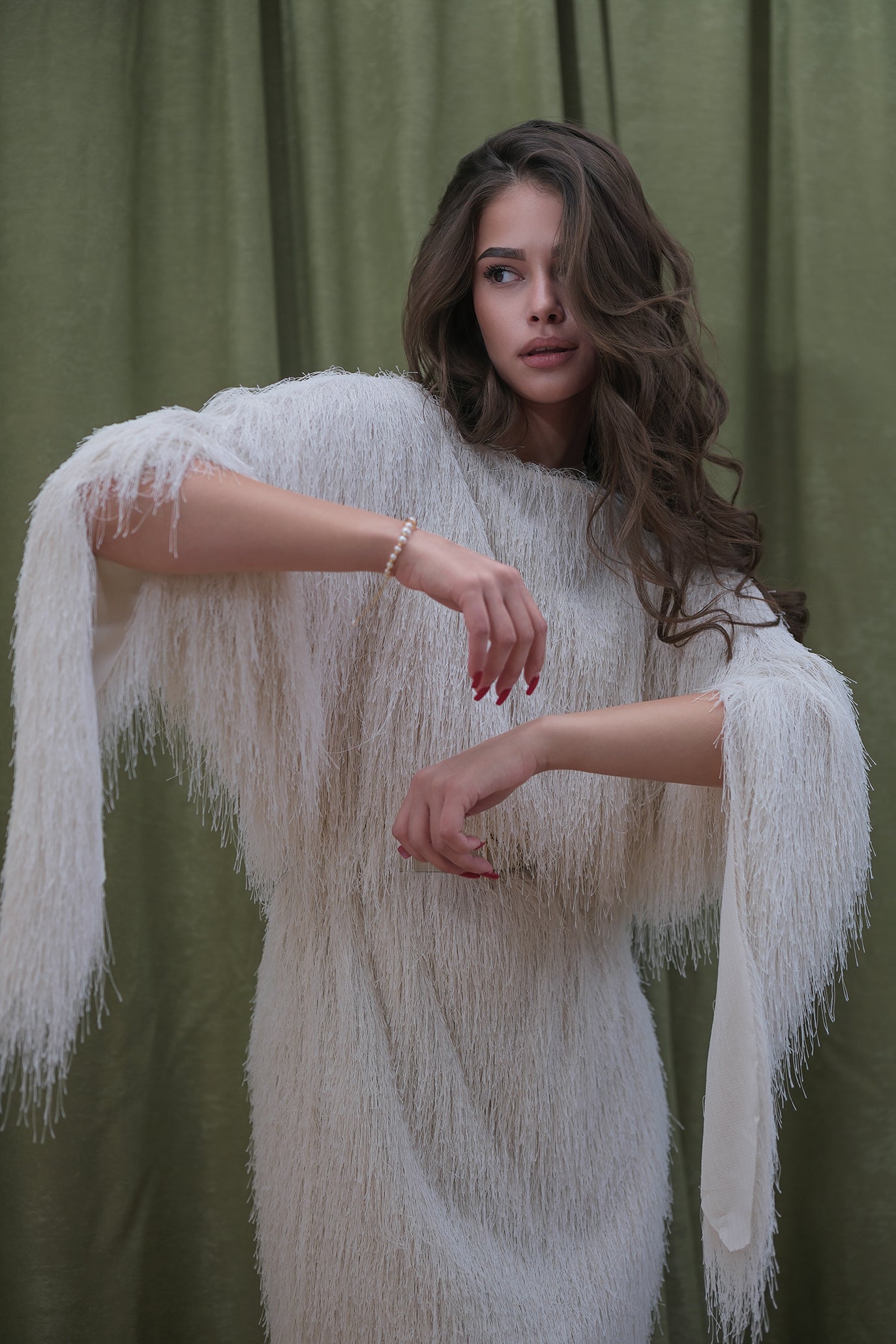Елегантна мини рокля с ефектна текстура от фини нишки, които създават богато движение и изразителен визуален ефект. Множество специални конци - ресни с ефект на пера или косъм. Моделът е със свободен силует и пада нежно по тялото, като придава усещане за лекота. Акцентът е в характерната повърхност на плата, която докосва кожата.