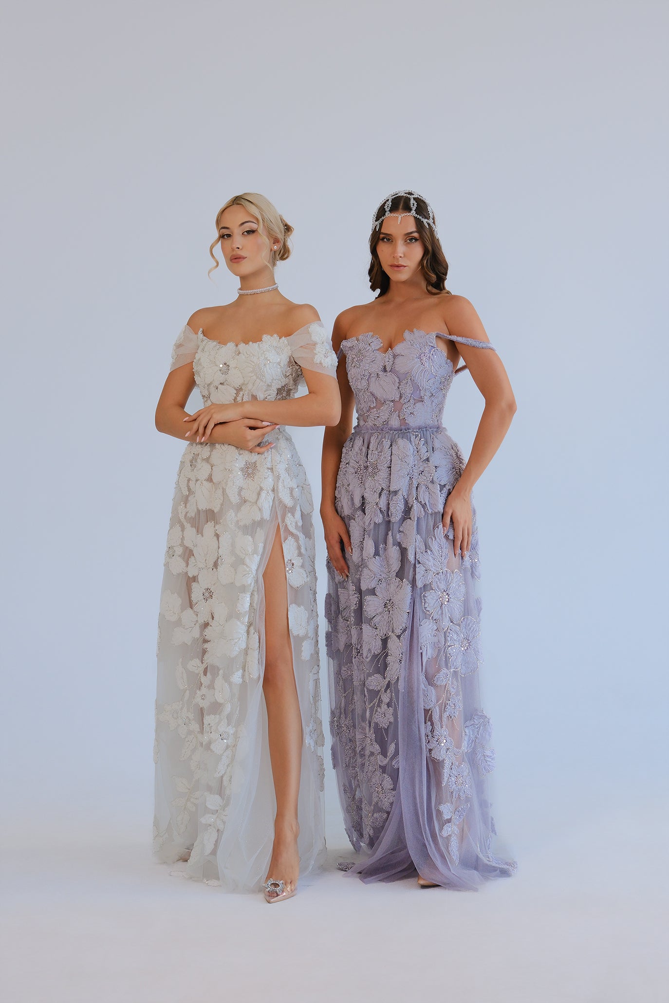 Ефирна рокля, изработена от многопластов тюл и покрита с богати 3D флорални апликации, декорирани с пайети и фини кристални акценти. Горната част е тип корсет със сърцевидно деколте и деликатни презрамки, които подчертават линията на раменете и осигуряват сигурна поддръжка и перфектно прилягане благодарение на връзките на гърба. Полата е права до А-силует с леко падаща линия и дискретна цепка отпред за свобода на движение и елегантен ефект при ходене. Продуктът идва в персонализиран калъф.