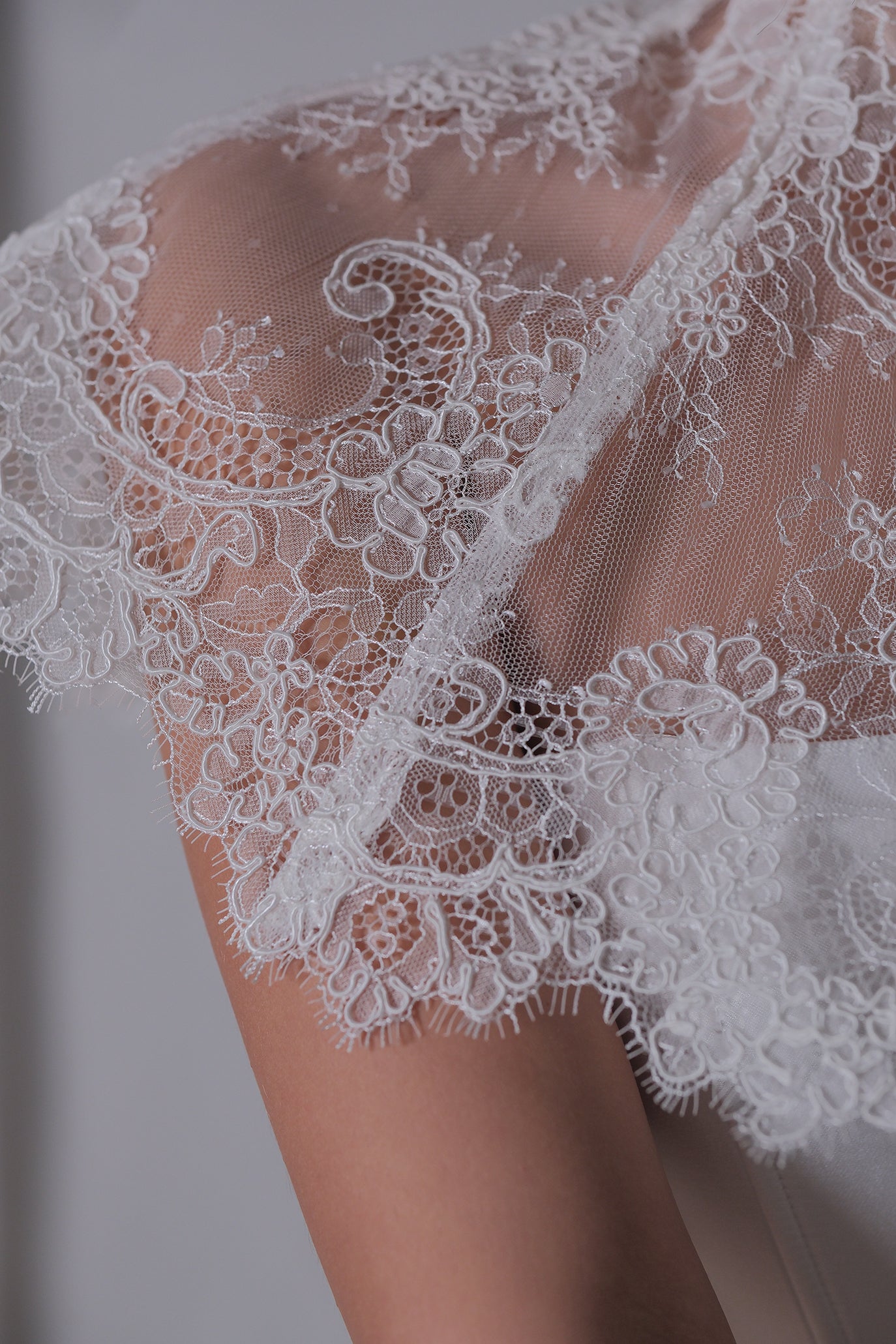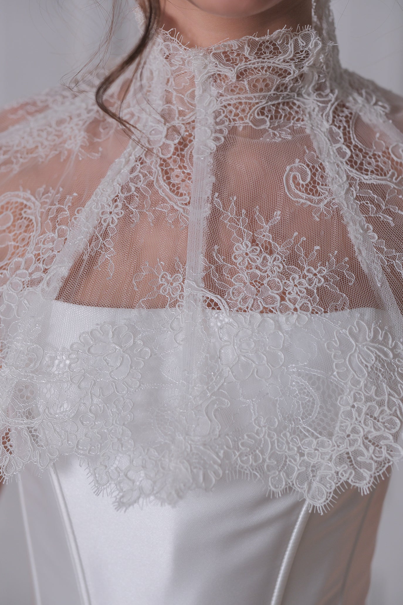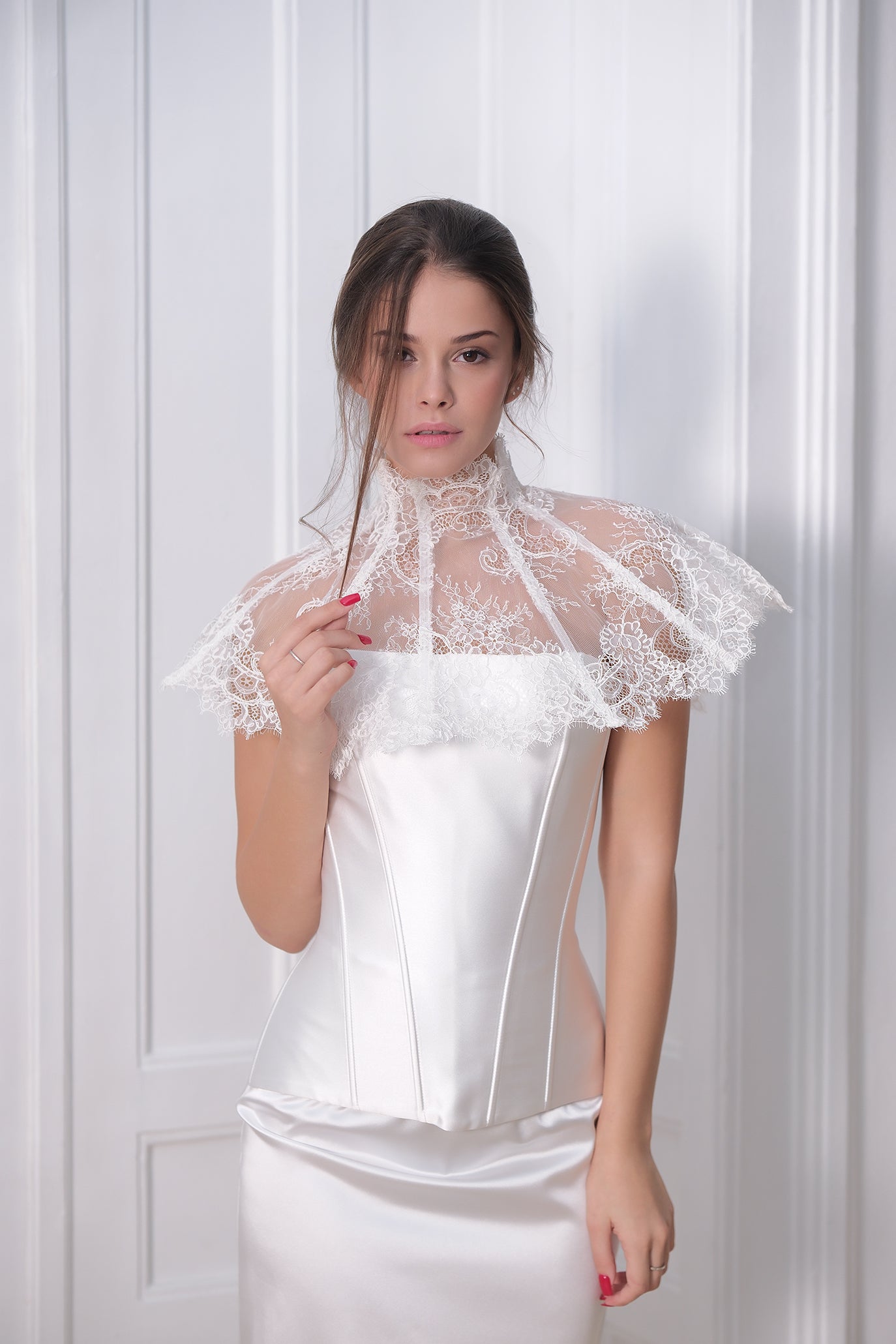 Нежна дантелена яка с флорални елементи, която придава неповторима елегантност и присъстие. Перфектно допълнение към всяка рокля или корсет, тя оформя изискана линия на деколтето, акцентирайки на врата с елегантен, винтидж ефект. Формата се поддържа чрез банели. Яката е с ефирен и женствен вид, придаващ класическо очарование и е идеален избор за специални поводи и официални събития.