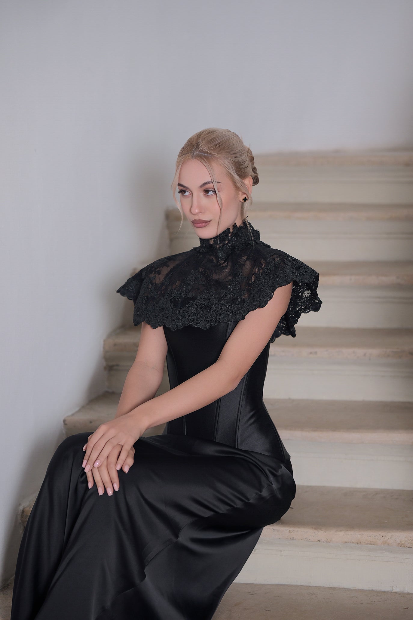 Нежна дантелена яка с флорални елементи, която придава неповторима елегантност и присъстие. Перфектно допълнение към всяка рокля или корсет, тя оформя изискана линия на деколтето, акцентирайки на врата с елегантен, винтидж ефект. Формата се поддържа чрез банели. Яката е с ефирен и женствен вид, придаващ класическо очарование и е идеален избор за специални поводи и официални събития.