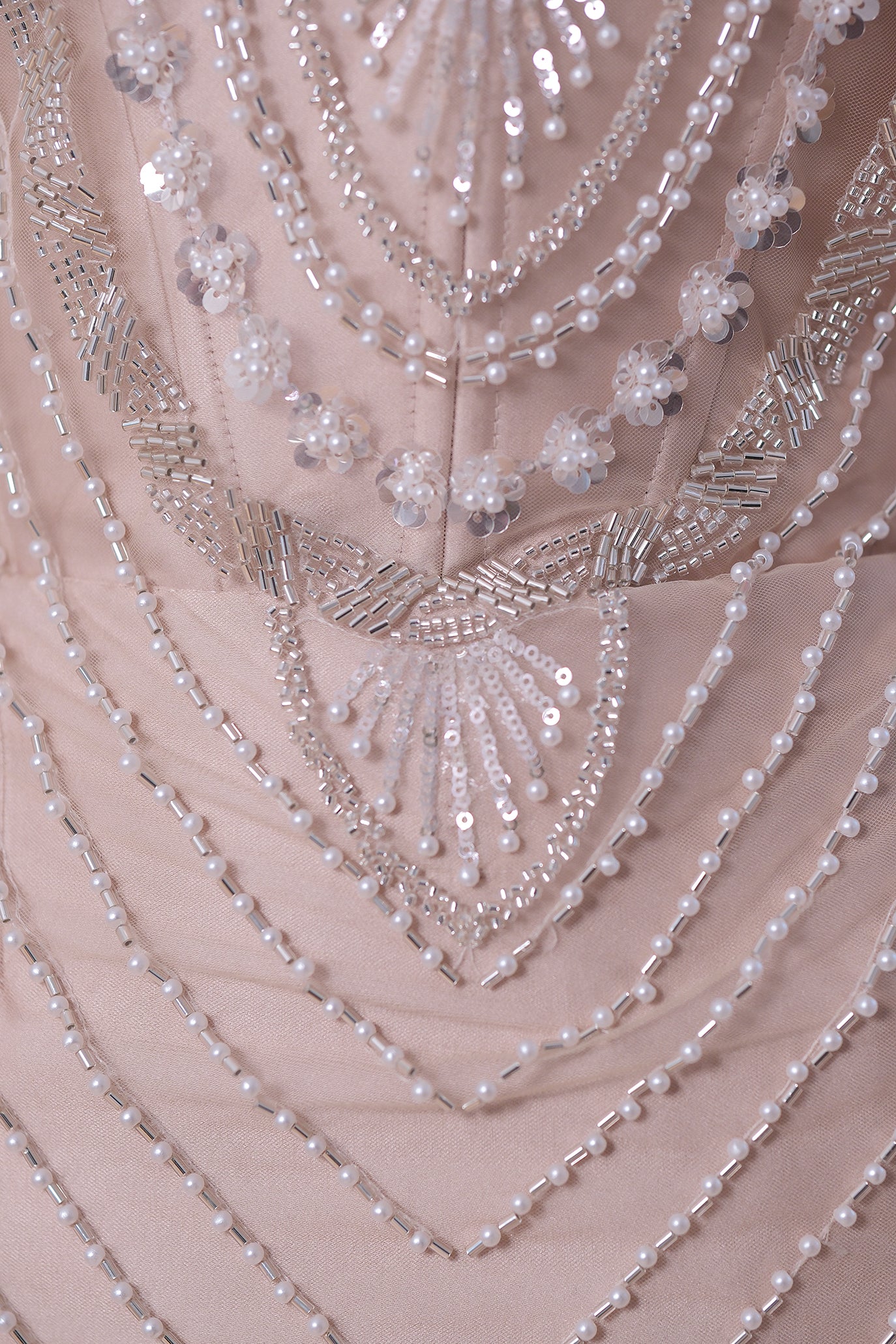 Къса официална рокля „мини“, изработена върху фина телесна основа и изцяло ръчно обшита с перли, мъниста и пайети в сложни геометрични мотиви, които създават релеф и сияние. Корсетното бюстие с оформени чашки и дълбоко деколте подчертава силуета и осигурява стабилност и комфорт. Моделът впечатлява с прецизната ръчна изработка и прилепналата кройка, която акцентира върху талията и извивките на тялото.