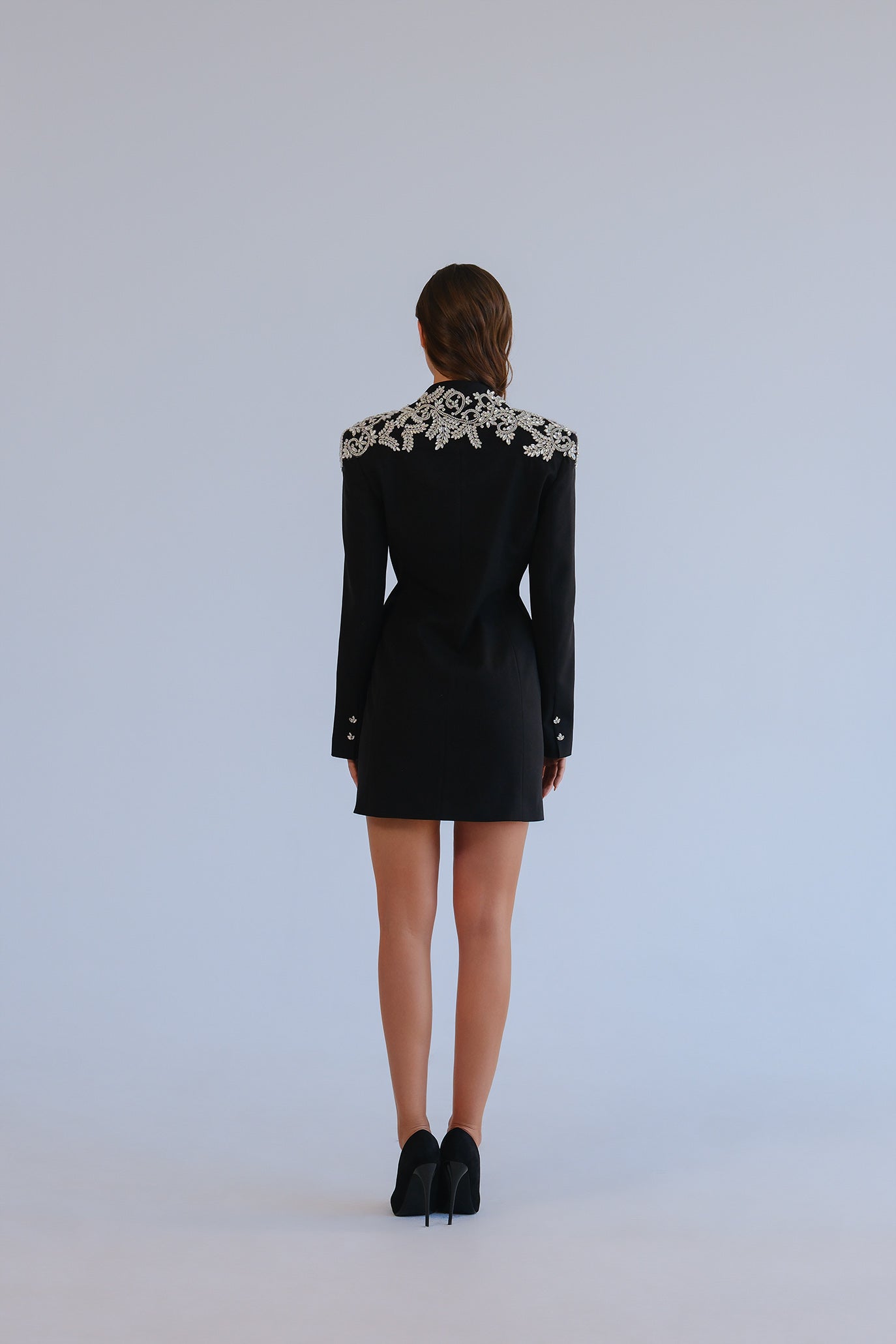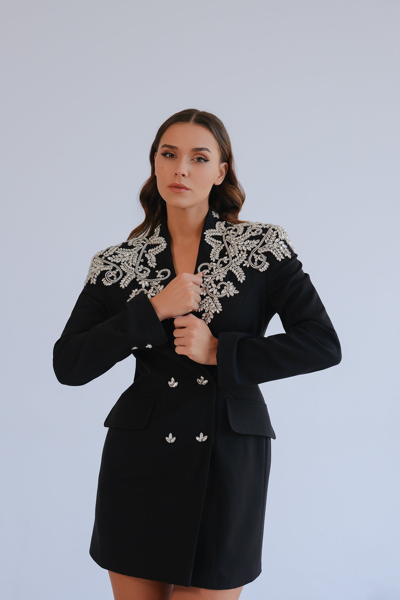 Къса рокля с елегантна кройка, вдъхновена от класическия блейзър. Дългите ръкави придават модерно излъчване и правят роклята изключително подходяща за есенно-зимния сезон. Леко вталената кройка подчертава фигурата, отдолу има мека трикотажна подплата. По раменете е ръчно декориран с блестящи камъни и кристали тип Swarovski. Закопчаването е с облечени копчета, а деколтето е с дълбока яка тип „ревер“.