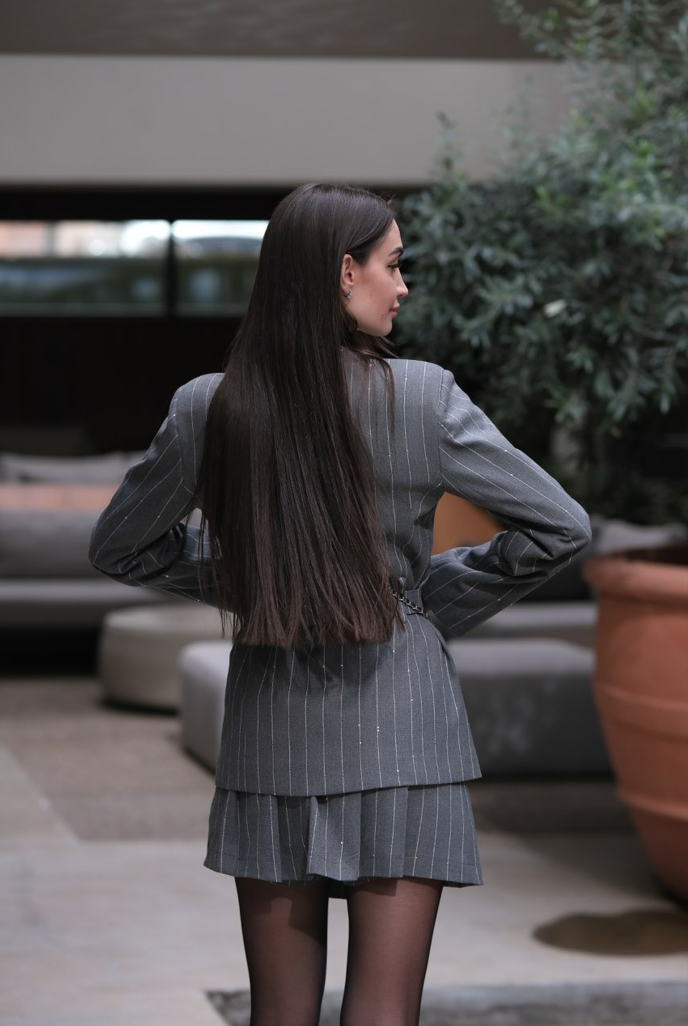 Стилно сако в сиво райе. Има елегантен колан, който подчертава талията. има мека трикотажна подплата.
