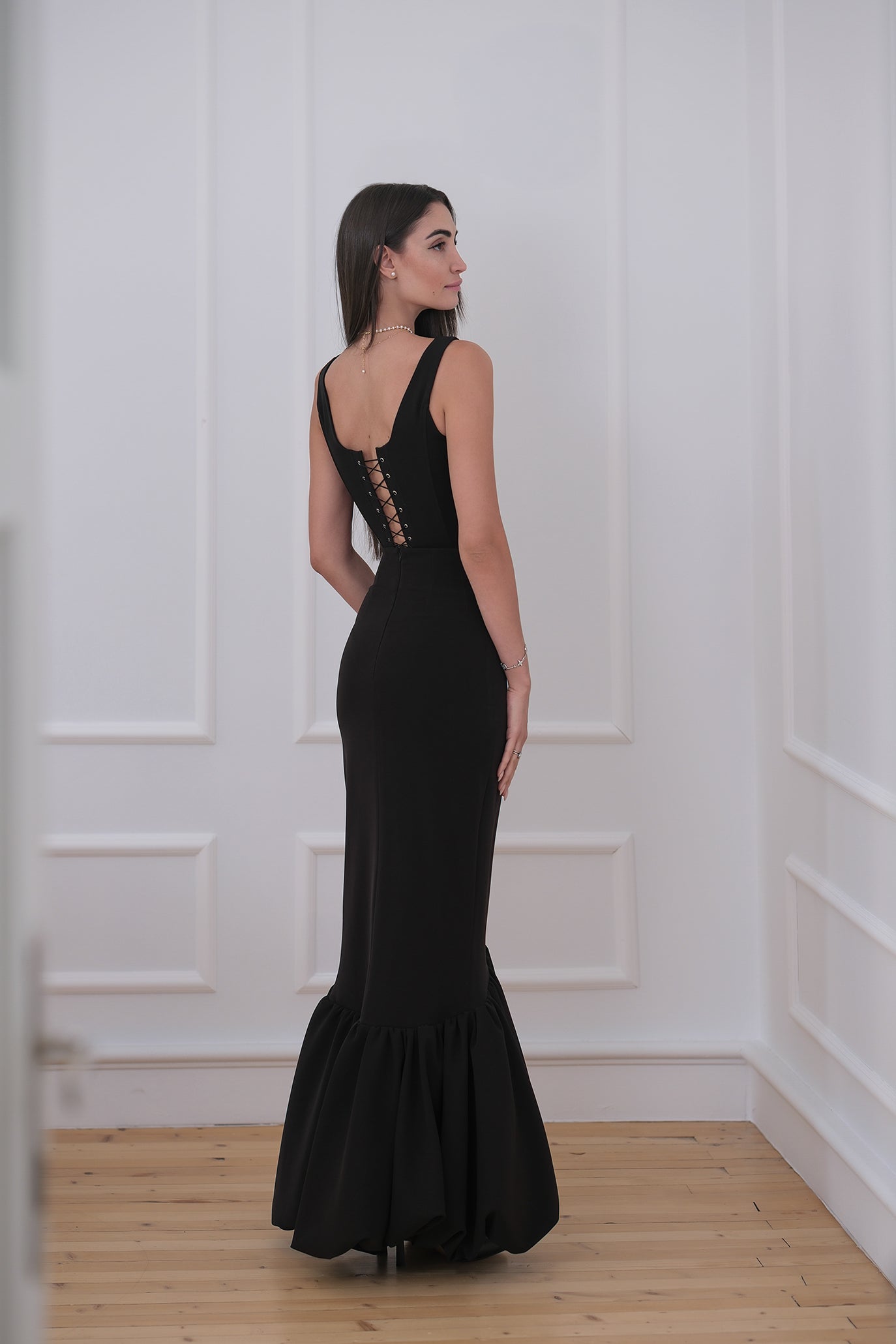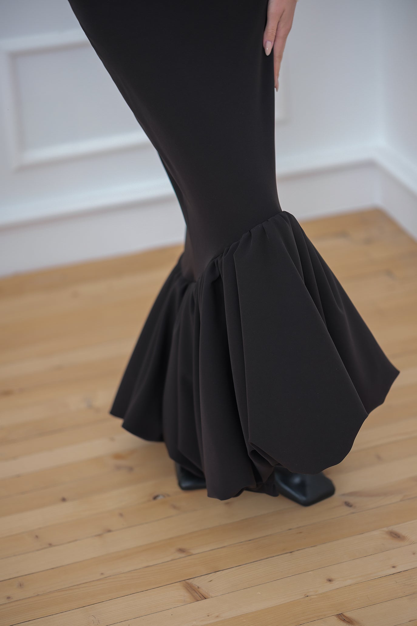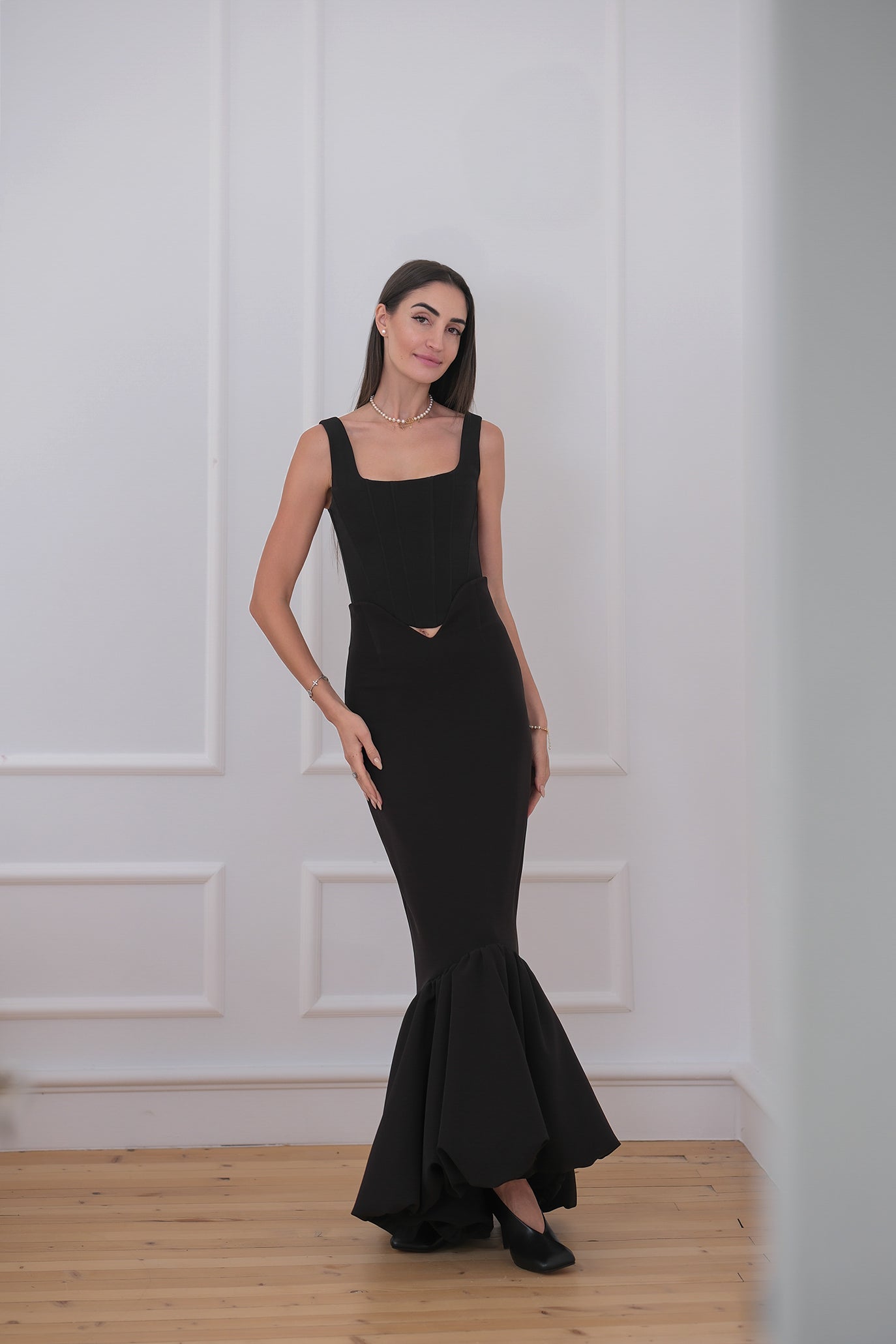 Елегантен костюм, съставен от корсет и пола, създаден да подчертае силуета с изчистена кройка и изразена женственост. Корсетът е с оформени вертикални банели за визуално издължаване на тялото и корсетно завръзване на гърба, което позволява прецизно регулиране и стабилност. Деколтето е елегантно, а долната част е завършена с характерна скосена линия, която плавно преминава към полата. Полата е с висока талия и изчистена линия в горната част, която преминава в ефирен разкроен подгъв за движение и лекота.