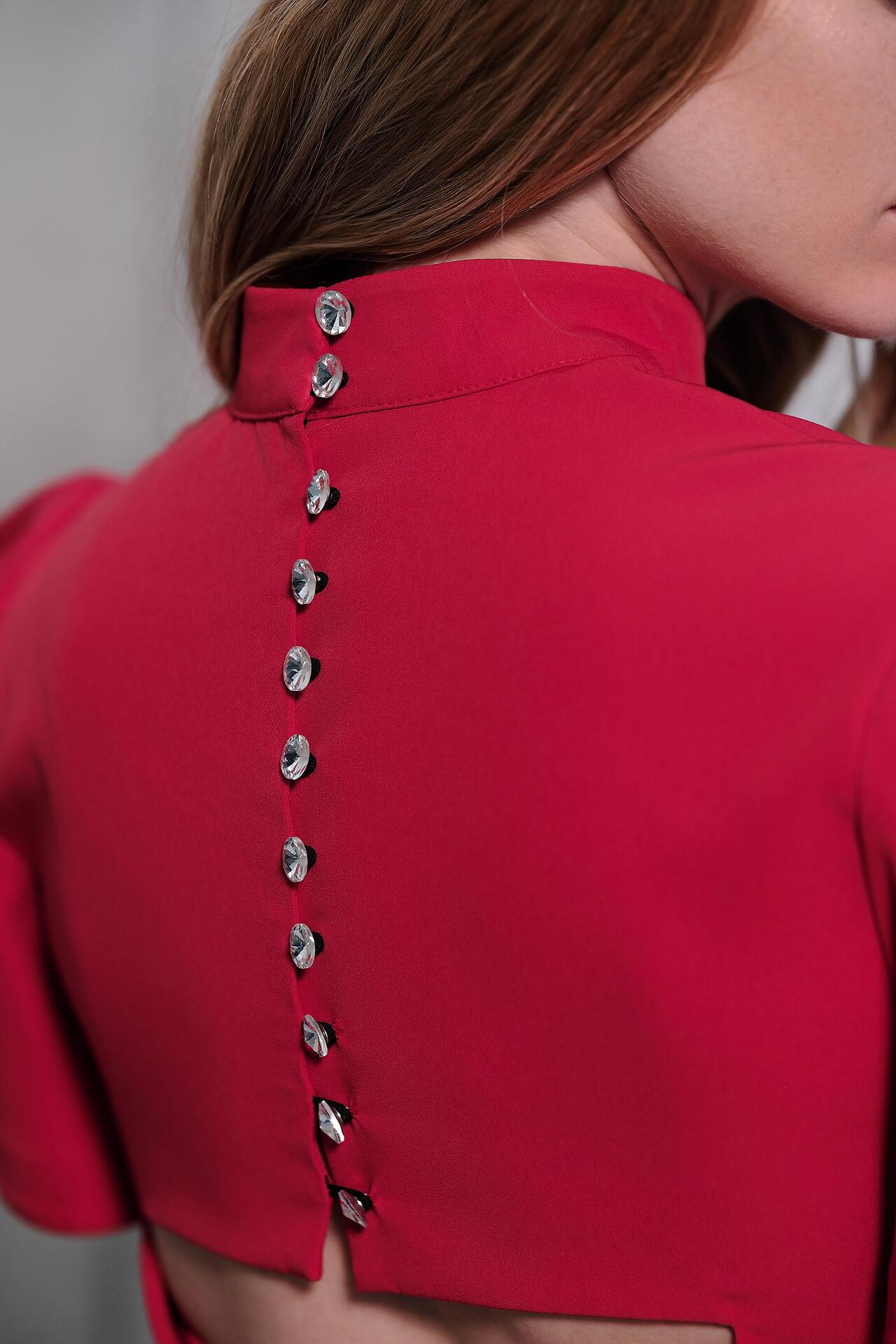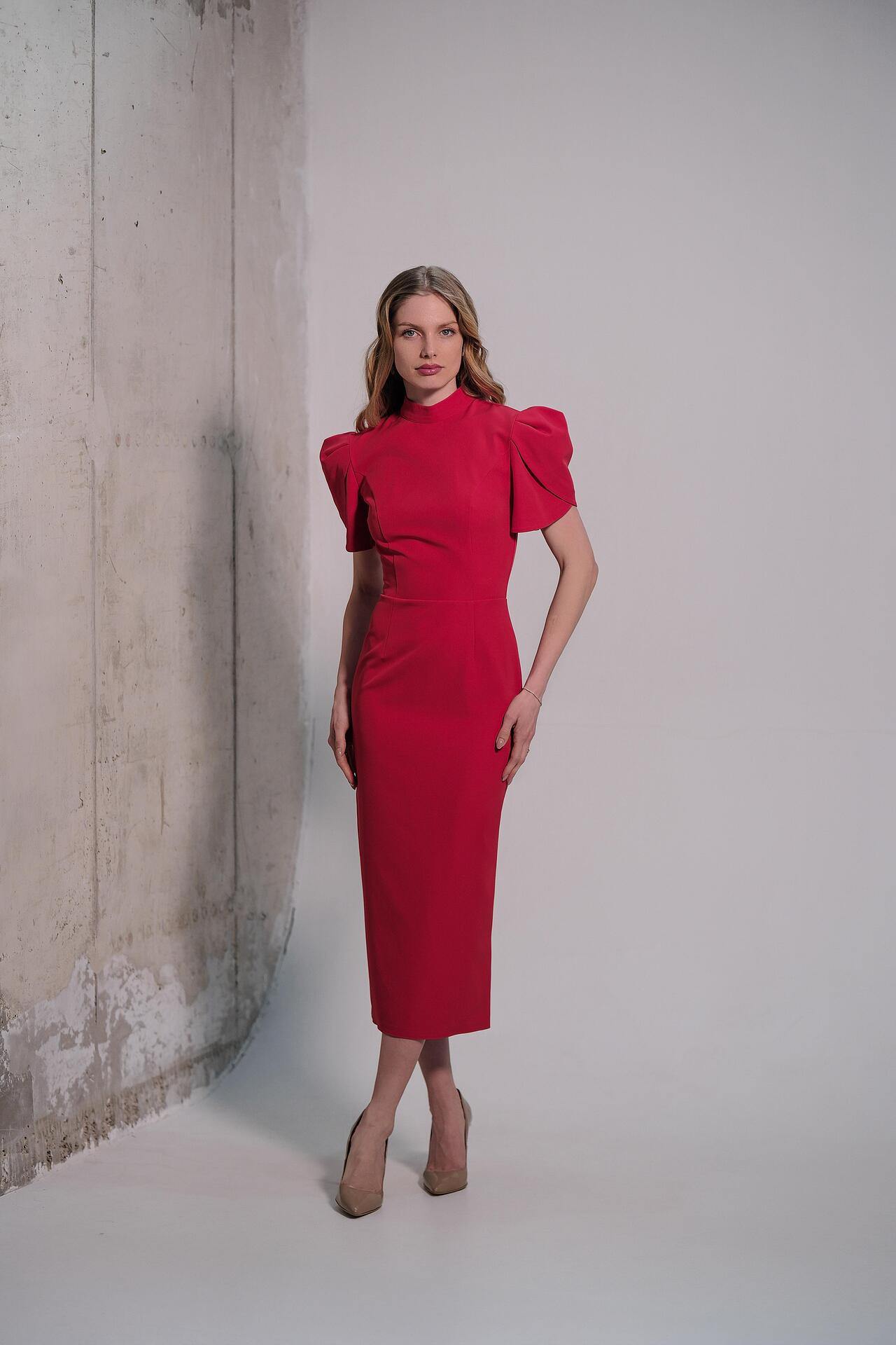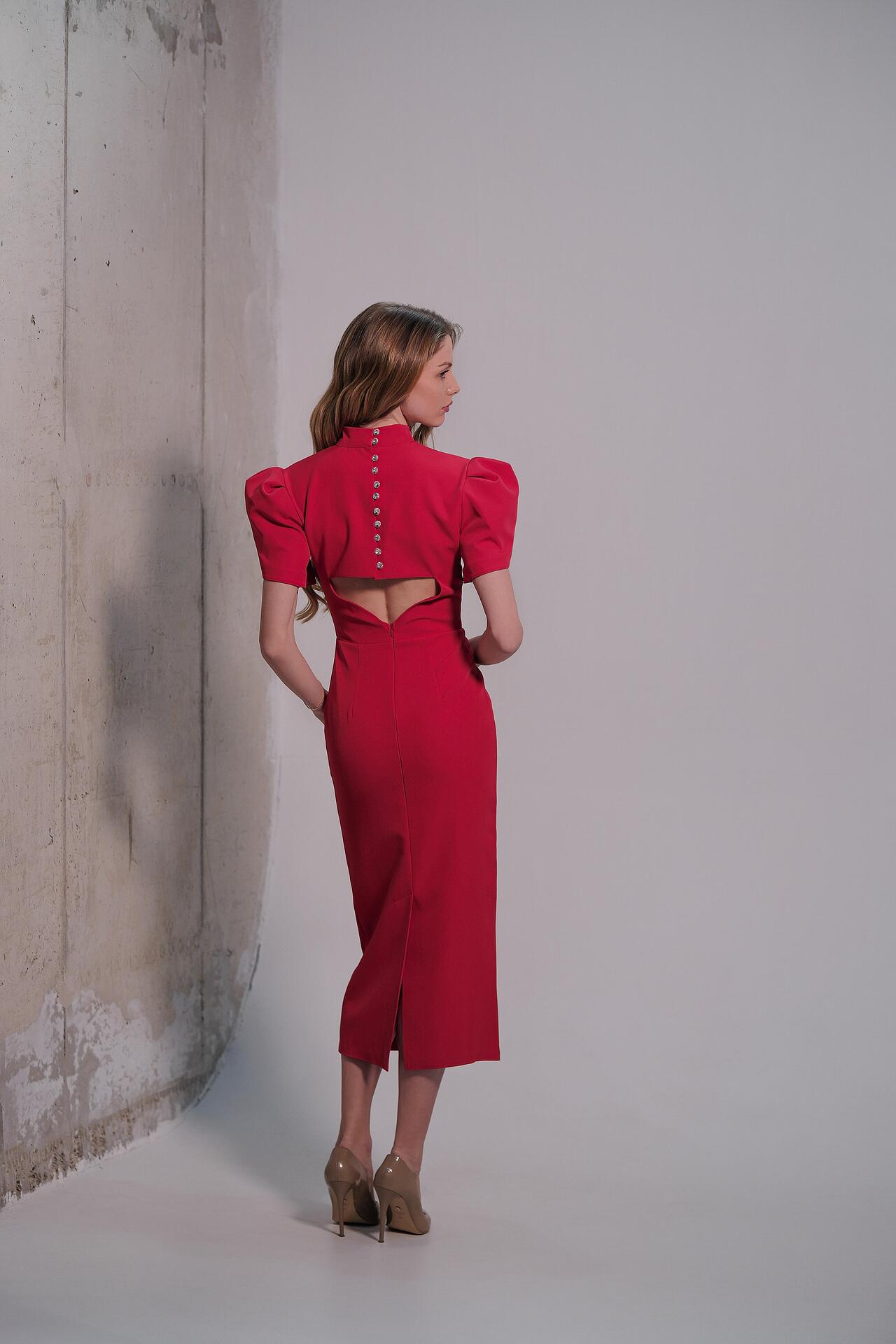 Elegant dress in deep red. The top has a high collar and structured voluminous sleeves. The back has impressive decorative buttons and a delicate opening that adds elegance and femininity. The skirt has a straight silhouette and a slight narrowing at the bottom, providing an elongated and stylish look.