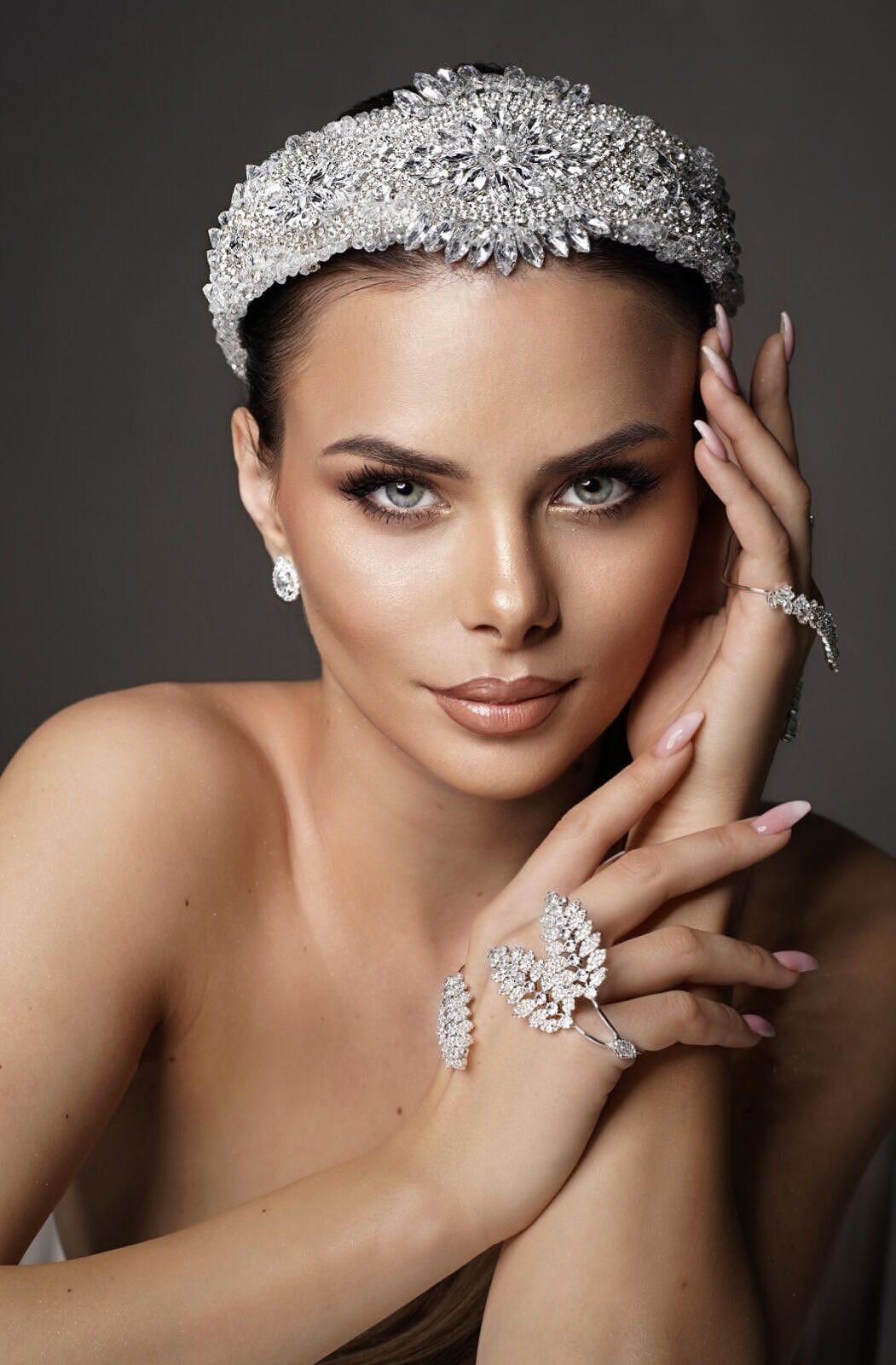 A voluminous high-stone tiara, lined with shiny crystals and beads, 8 cm wide.