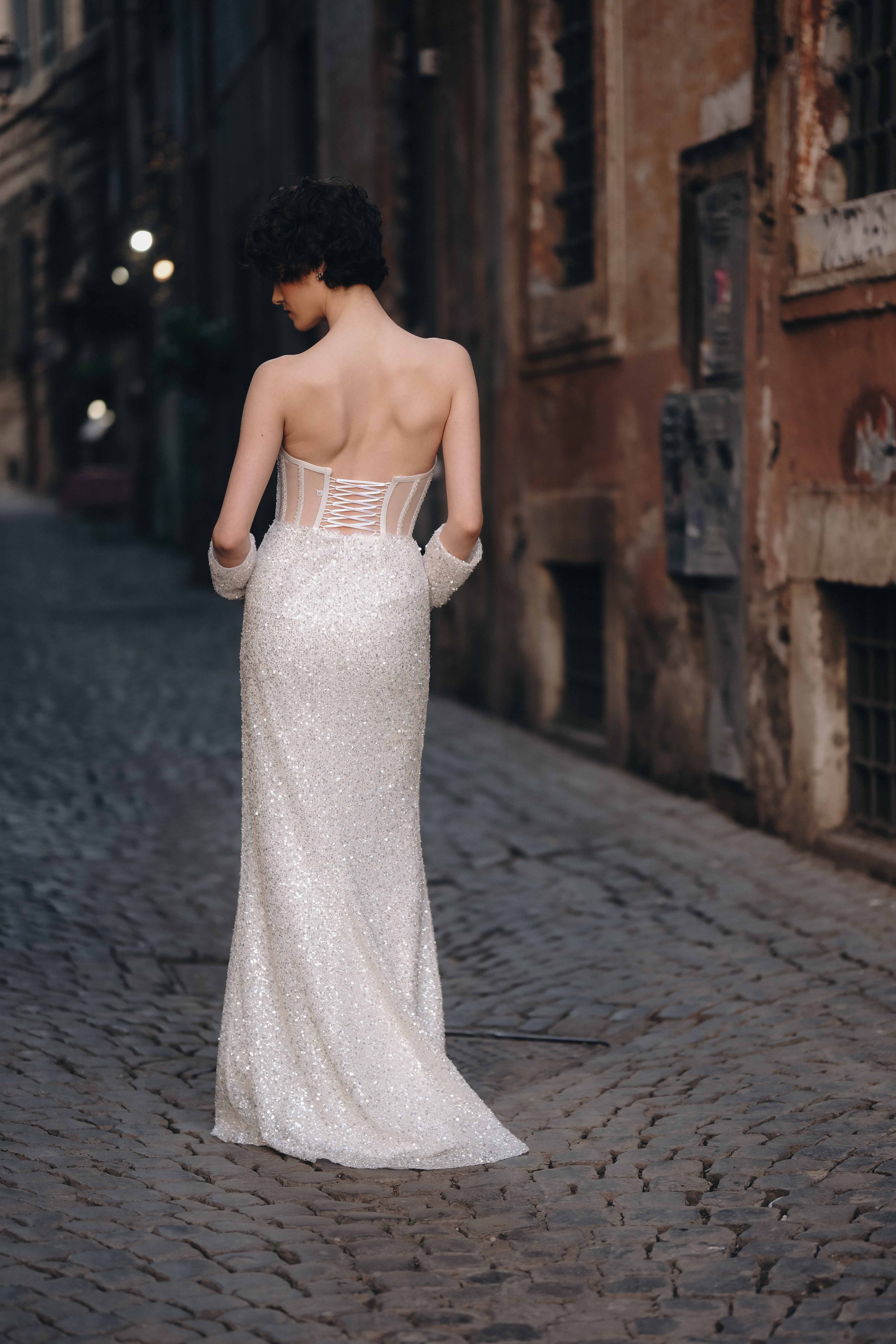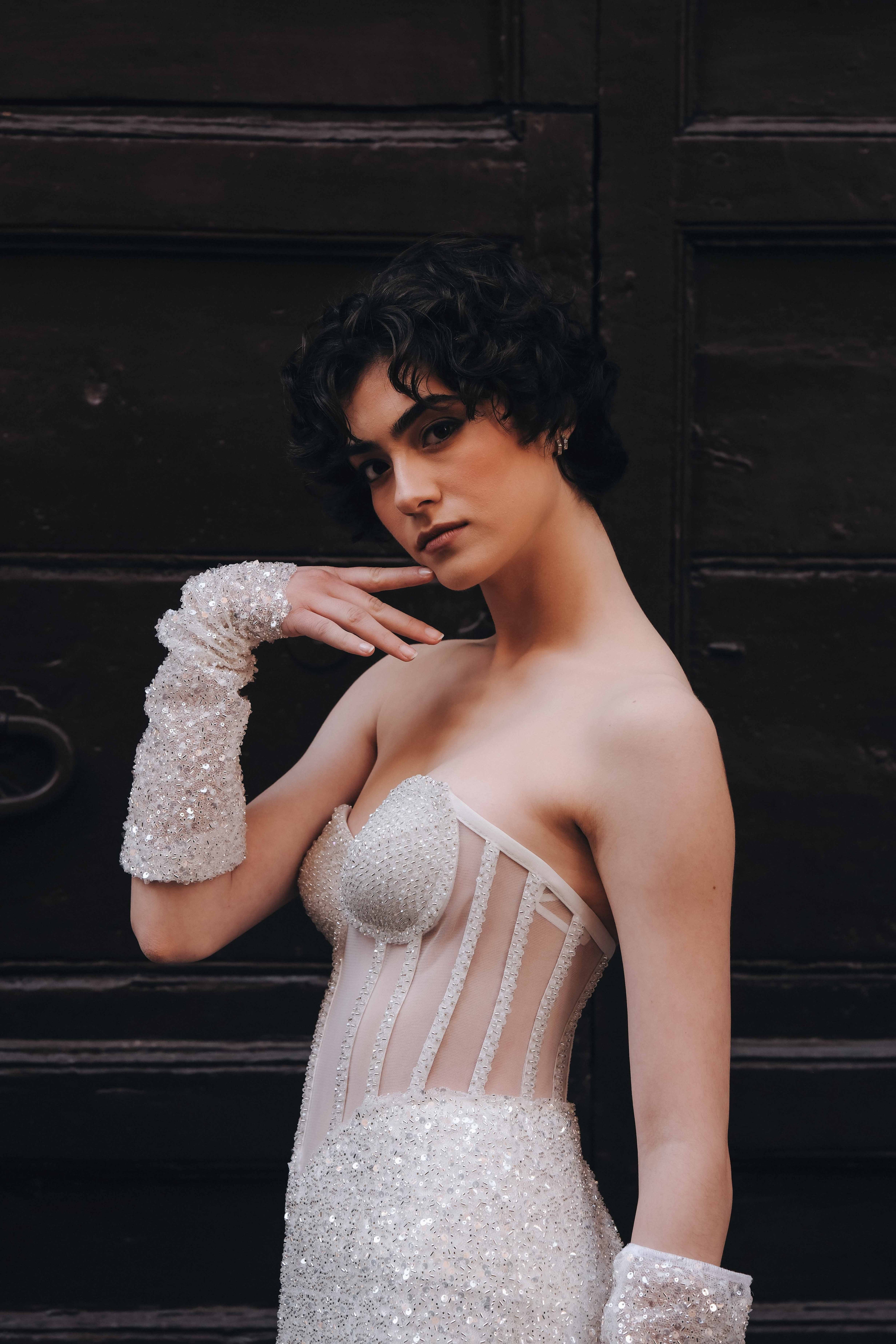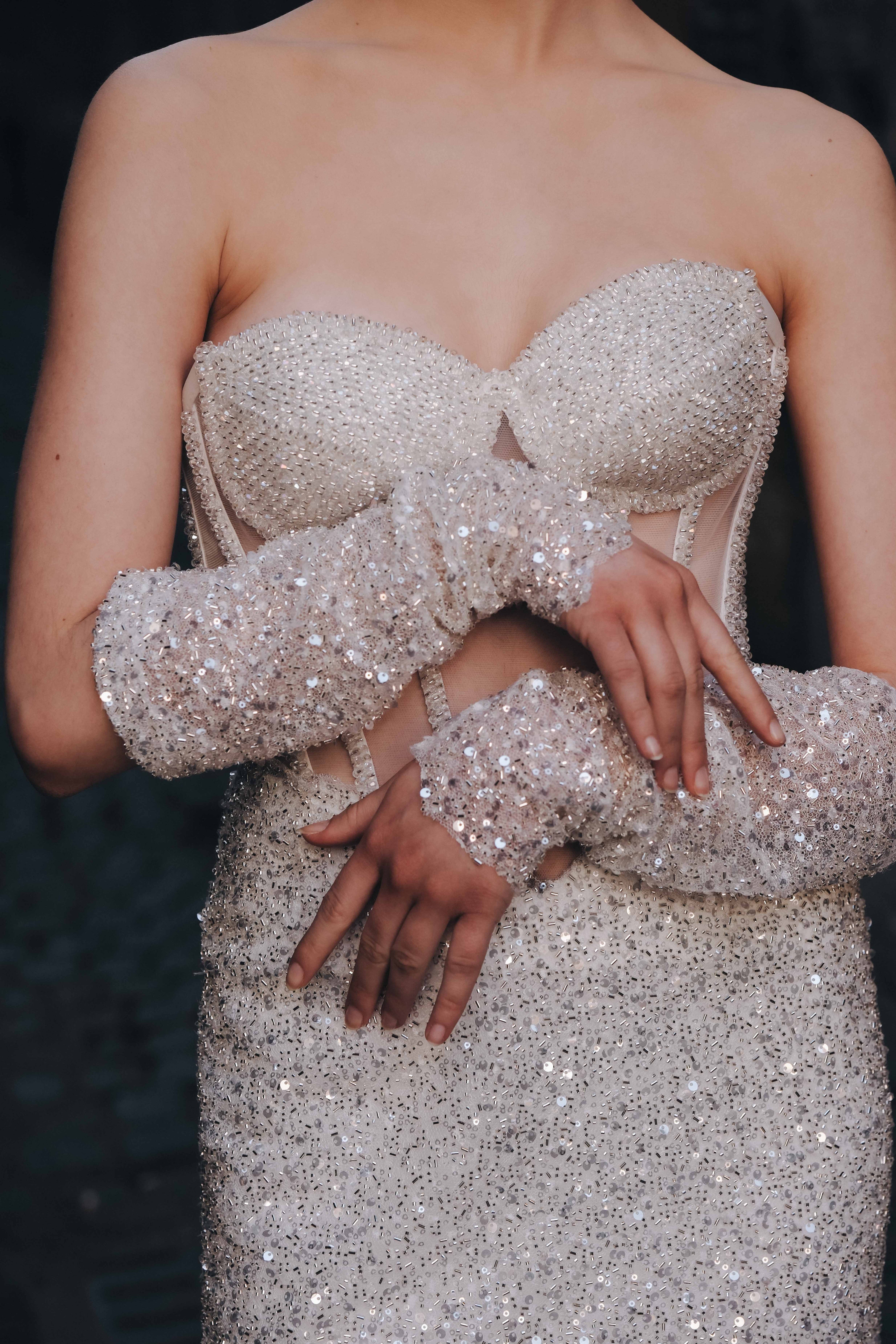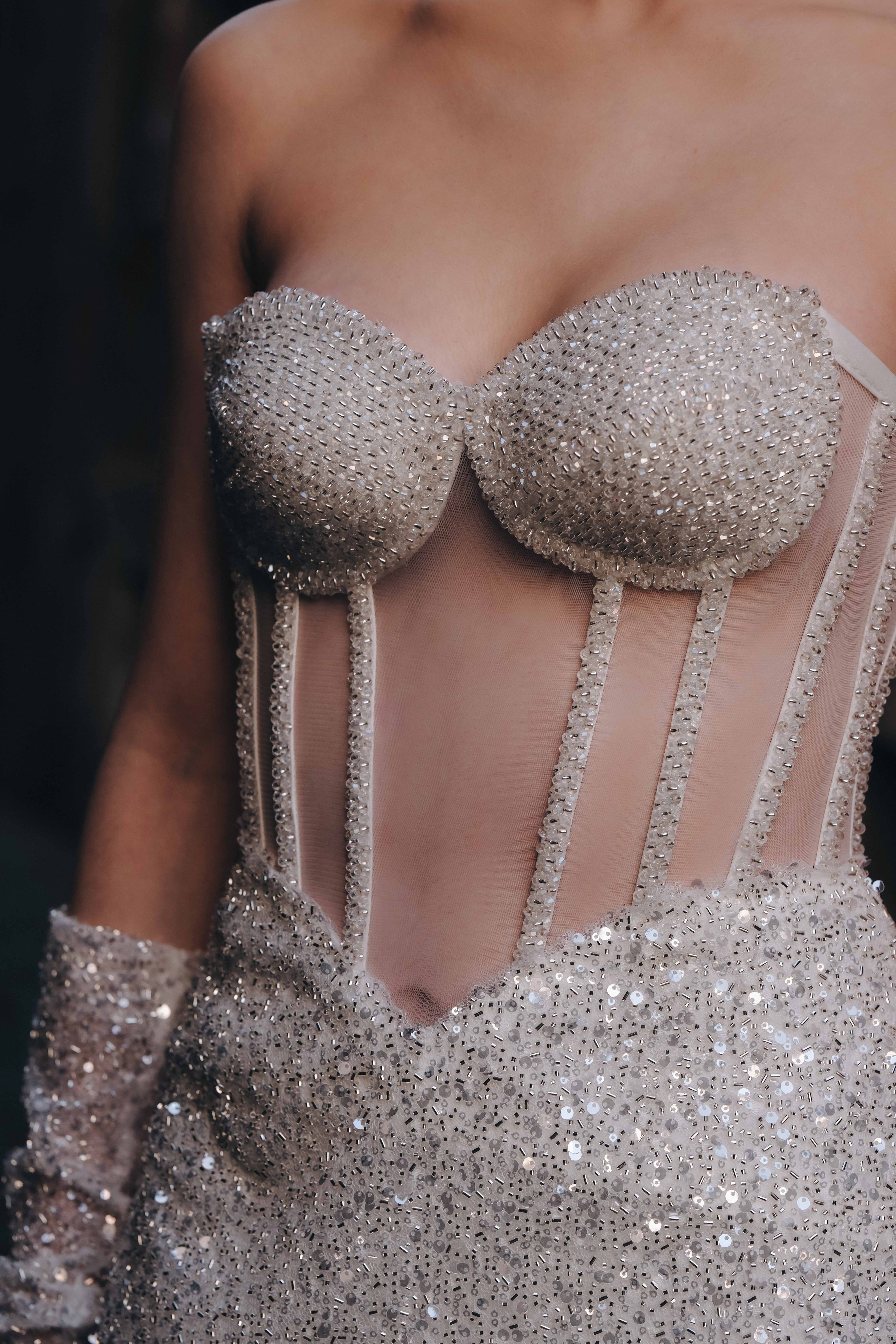 This handmade evening dress is a real jewel in the wardrobe of every lady looking for a memorable look. The top is a corset-like design with built-in underwires that shape and accentuate the silhouette. The sheer panels between the vertical elements create an elegant illusion of a "second skin" without revealing too much. The skirt is made of fine mesh, studded with thousands of hand-appliquéd glittering sequins, beads and embroidered geometric motifs. The bottom part is cut slightly, like a mermaid, creating an airy movement with every step.