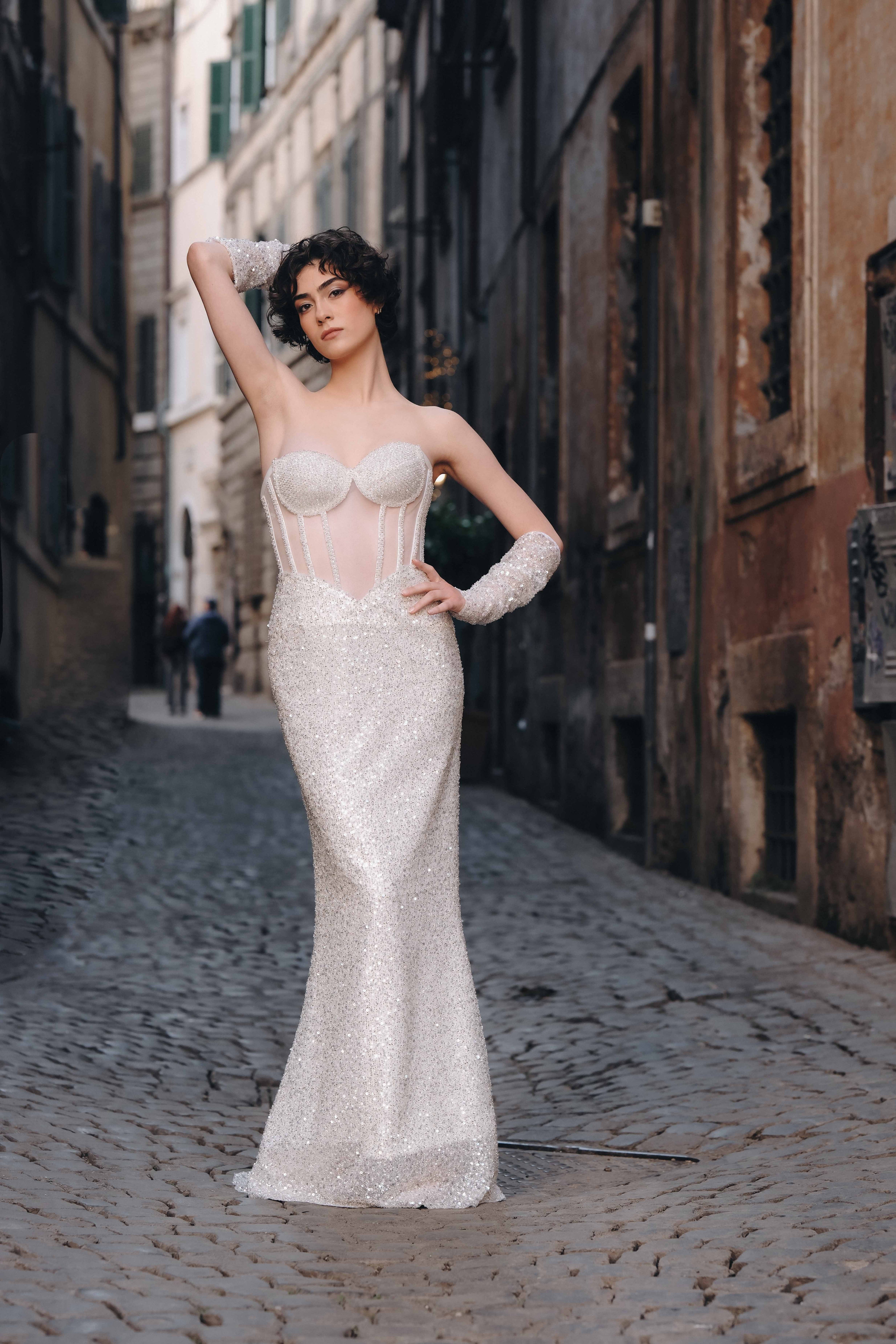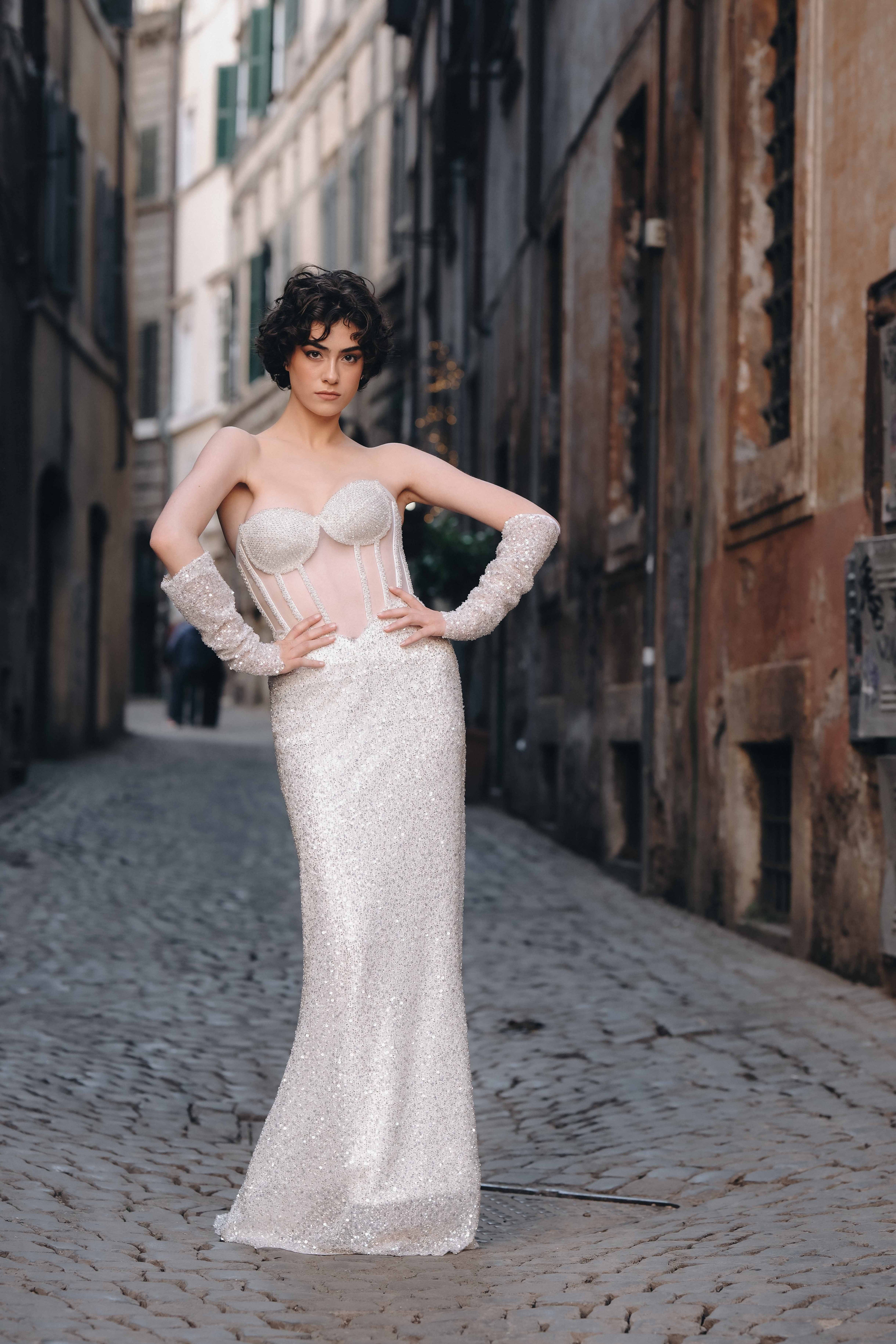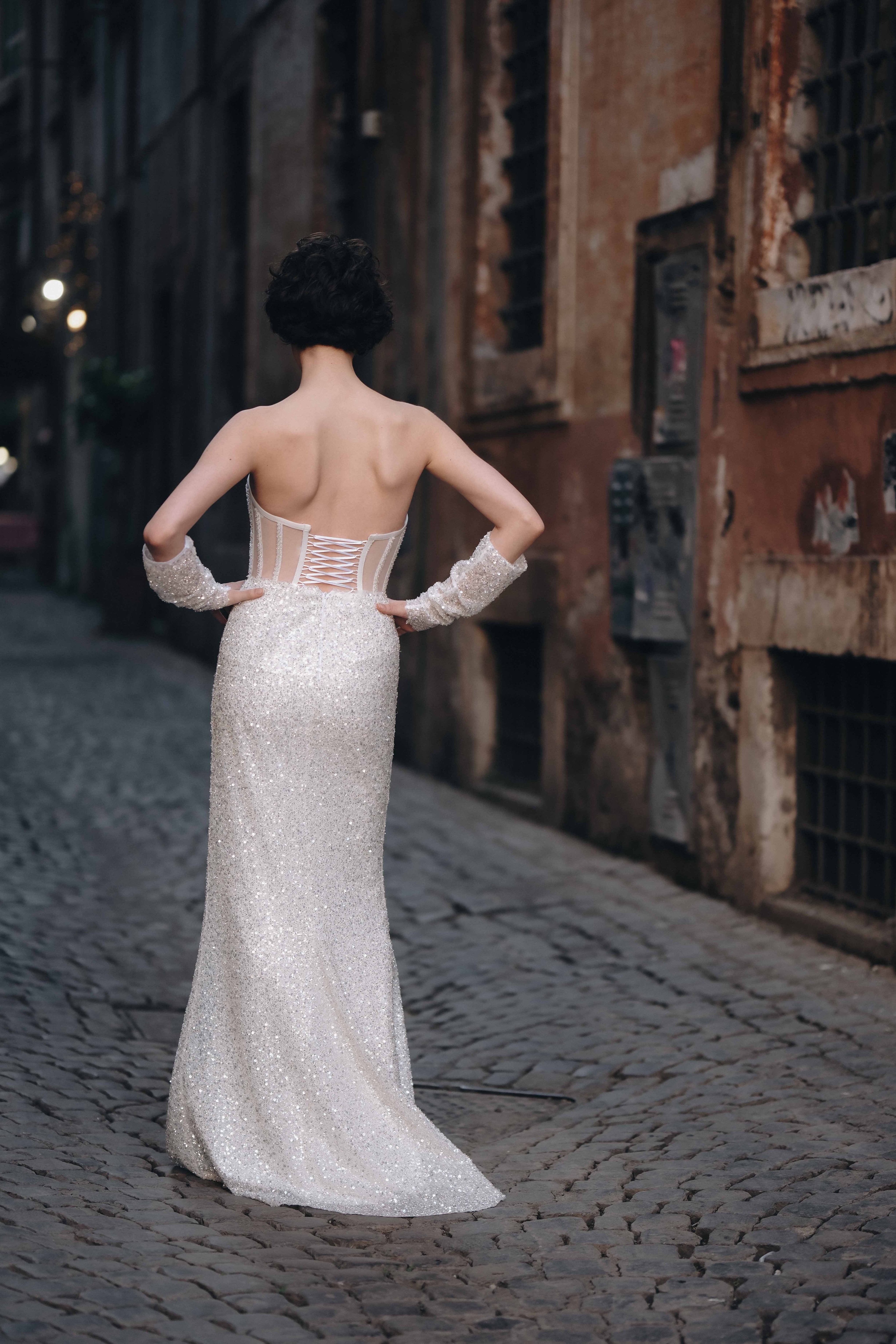 This handmade evening dress is a real jewel in the wardrobe of every lady looking for a memorable look. The top is a corset-like design with built-in underwires that shape and accentuate the silhouette. The sheer panels between the vertical elements create an elegant illusion of a "second skin" without revealing too much. The skirt is made of fine mesh, studded with thousands of hand-appliquéd glittering sequins, beads and embroidered geometric motifs. The bottom part is cut slightly, like a mermaid, creating an airy movement with every step.