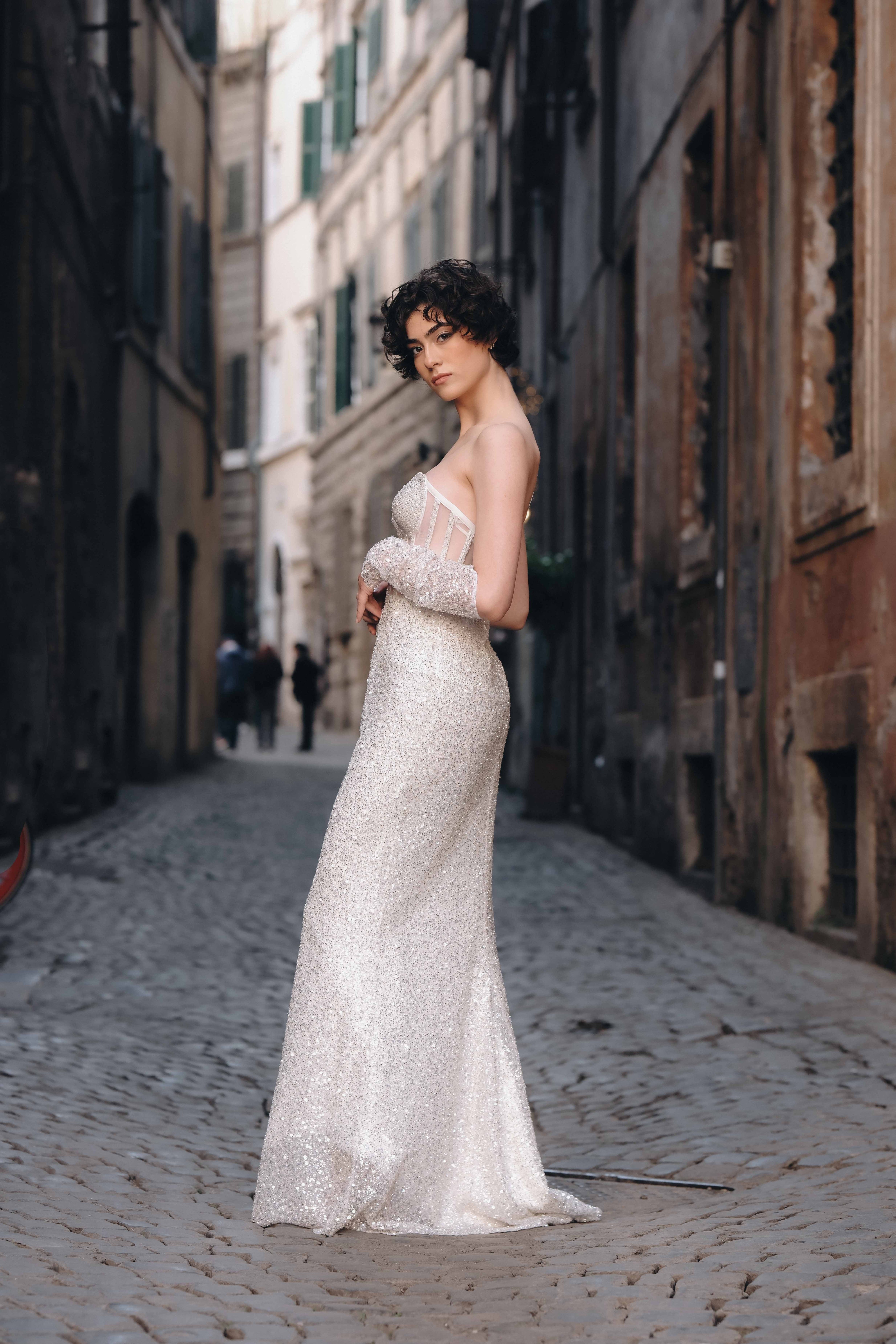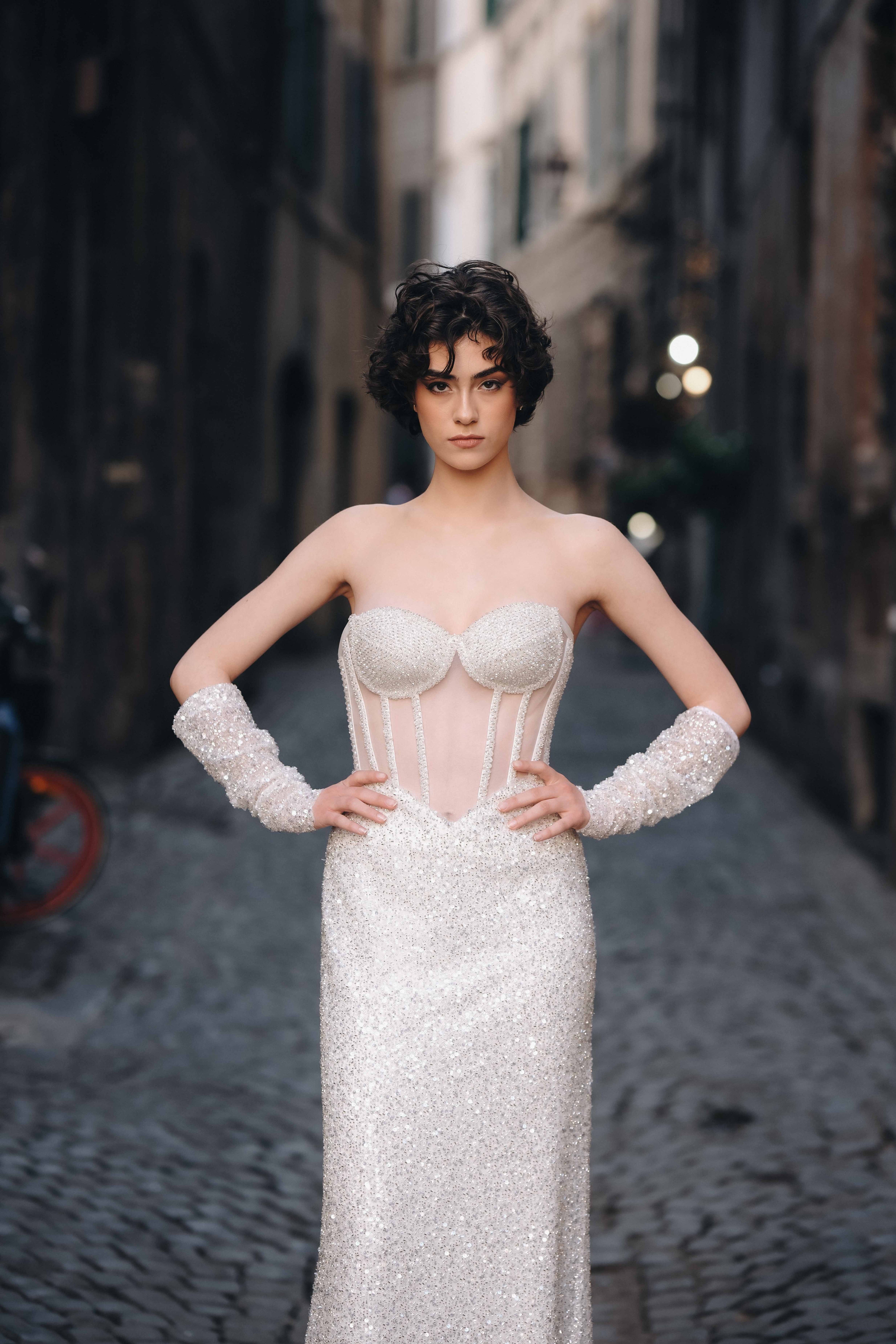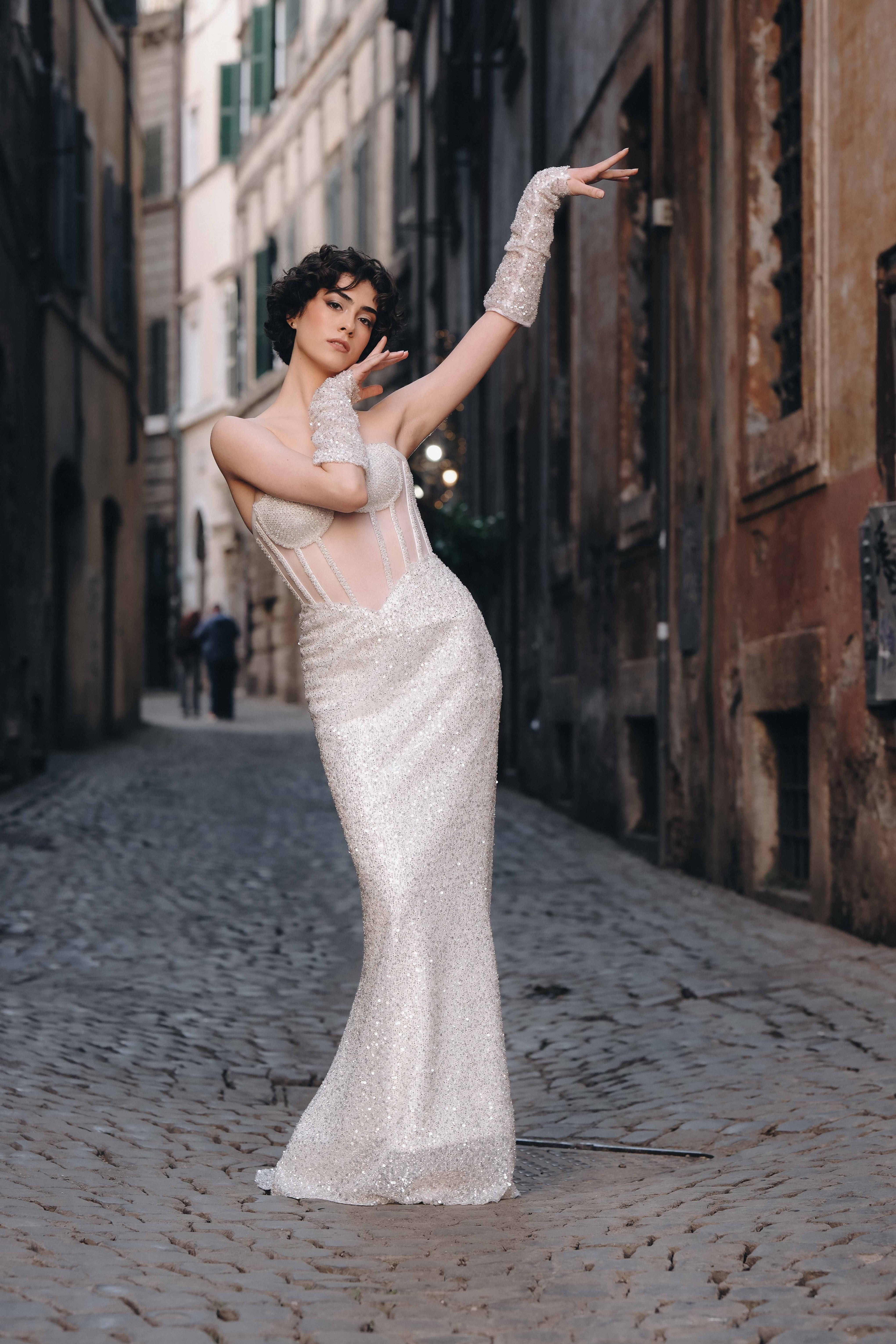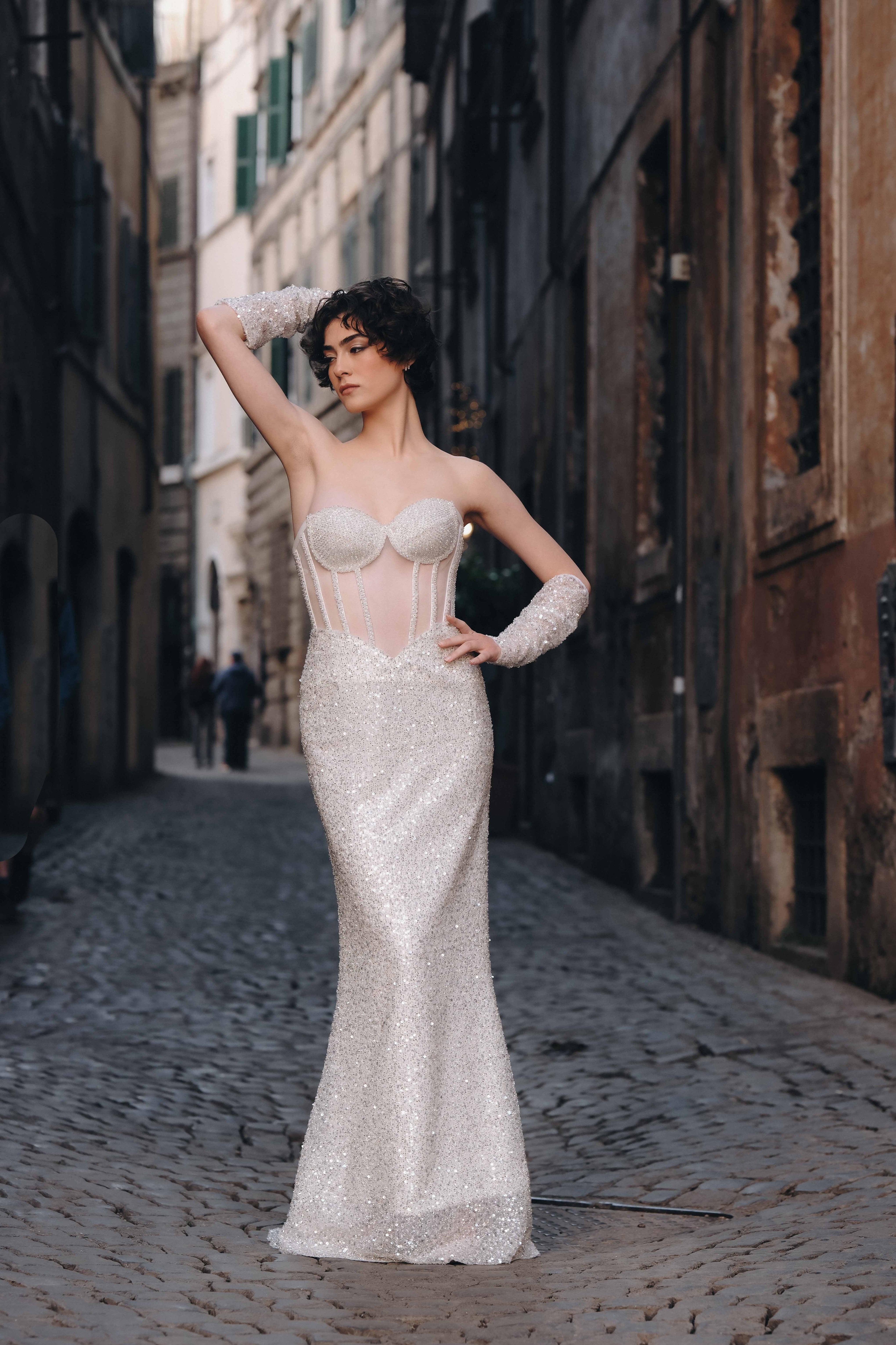 This handmade evening dress is a real jewel in the wardrobe of every lady looking for a memorable look. The top is a corset-like design with built-in underwires that shape and accentuate the silhouette. The sheer panels between the vertical elements create an elegant illusion of a "second skin" without revealing too much. The skirt is made of fine mesh, studded with thousands of hand-appliquéd glittering sequins, beads and embroidered geometric motifs. The bottom part is cut slightly, like a mermaid, creating an airy movement with every step.