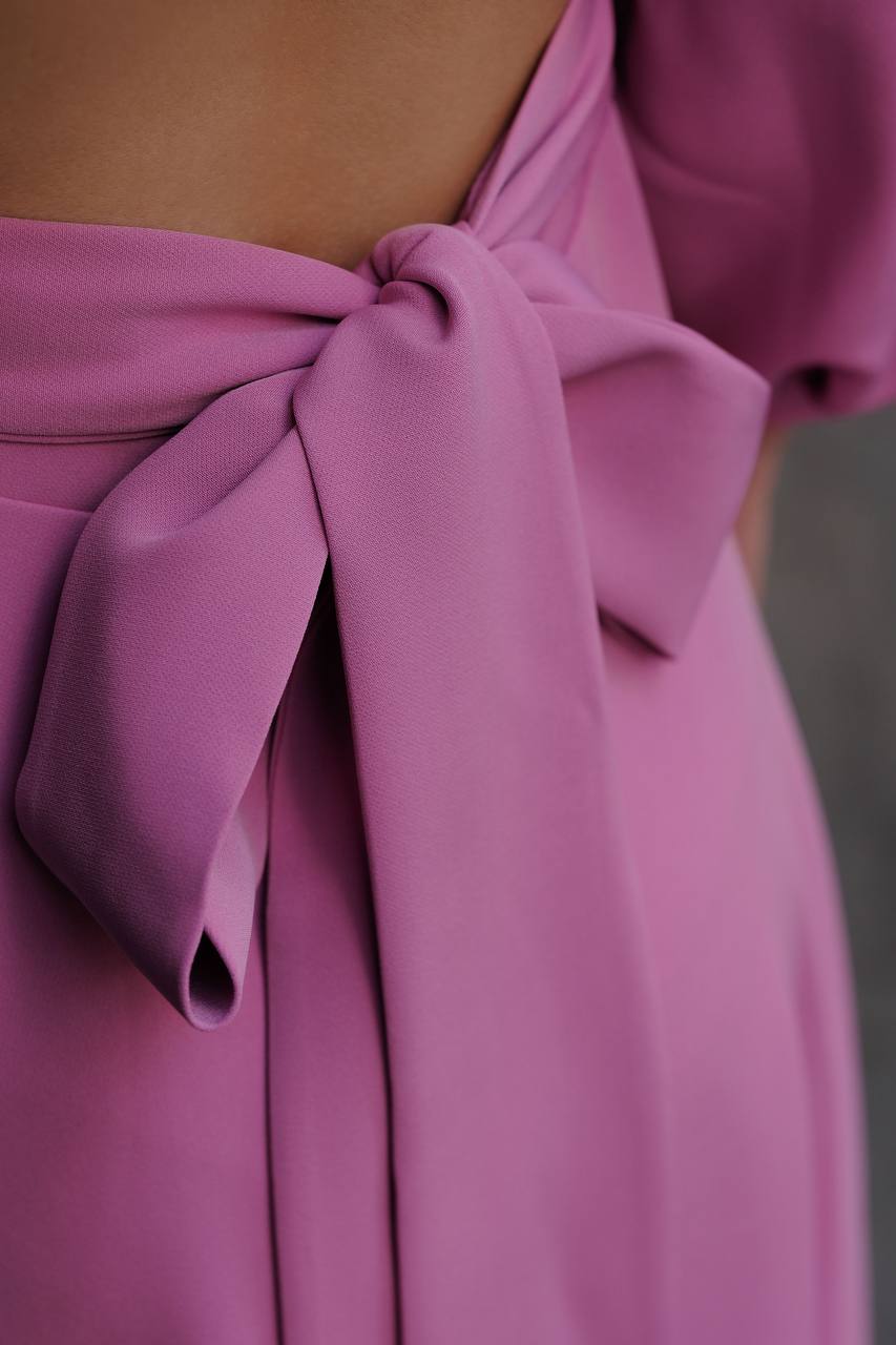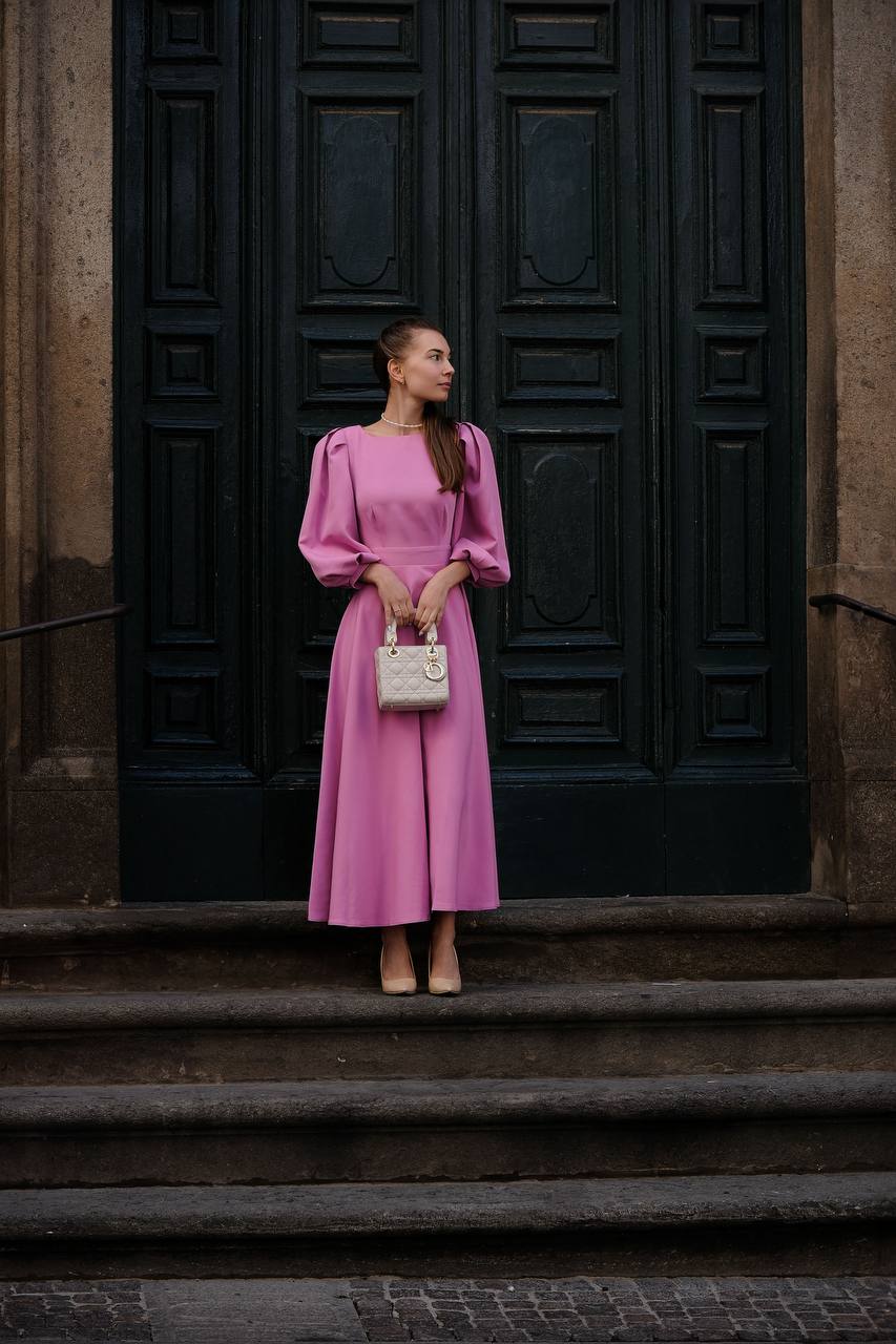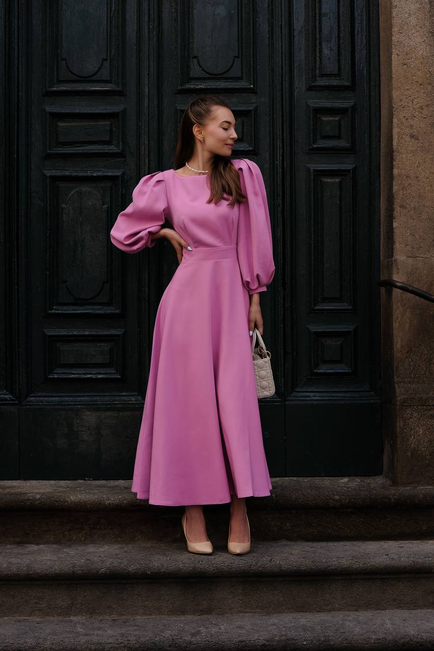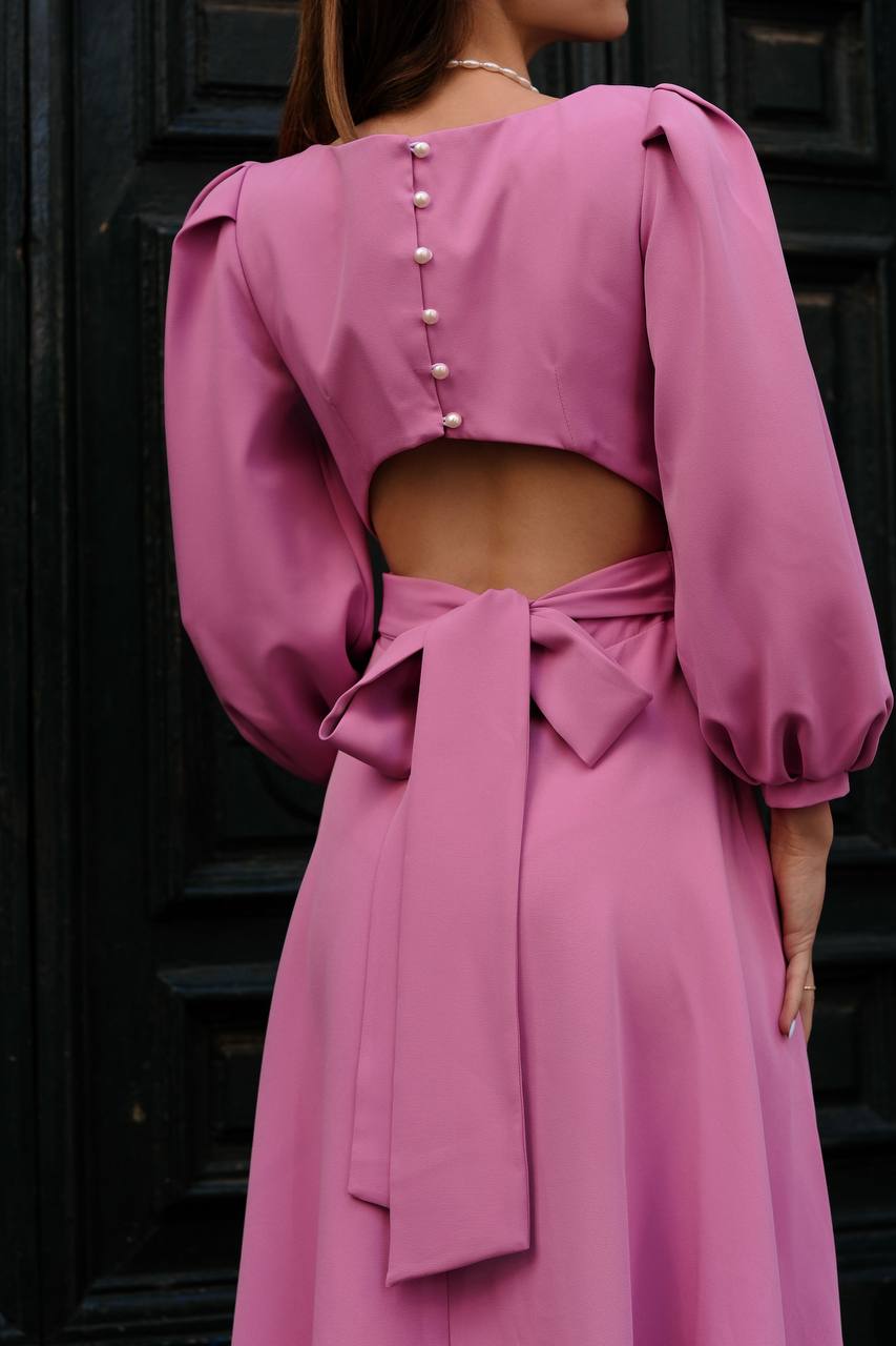 This elegant midi-length dress is made of a soft and lightweight fabric that provides comfort and freedom of movement. The top is simple, with long puff sleeves. On the back, the dress reveals an exquisite detail with pearl buttons and a ribbon that emphasizes the waist. The lower part of the dress is slightly flared, creating a sophisticated and elegant silhouette.