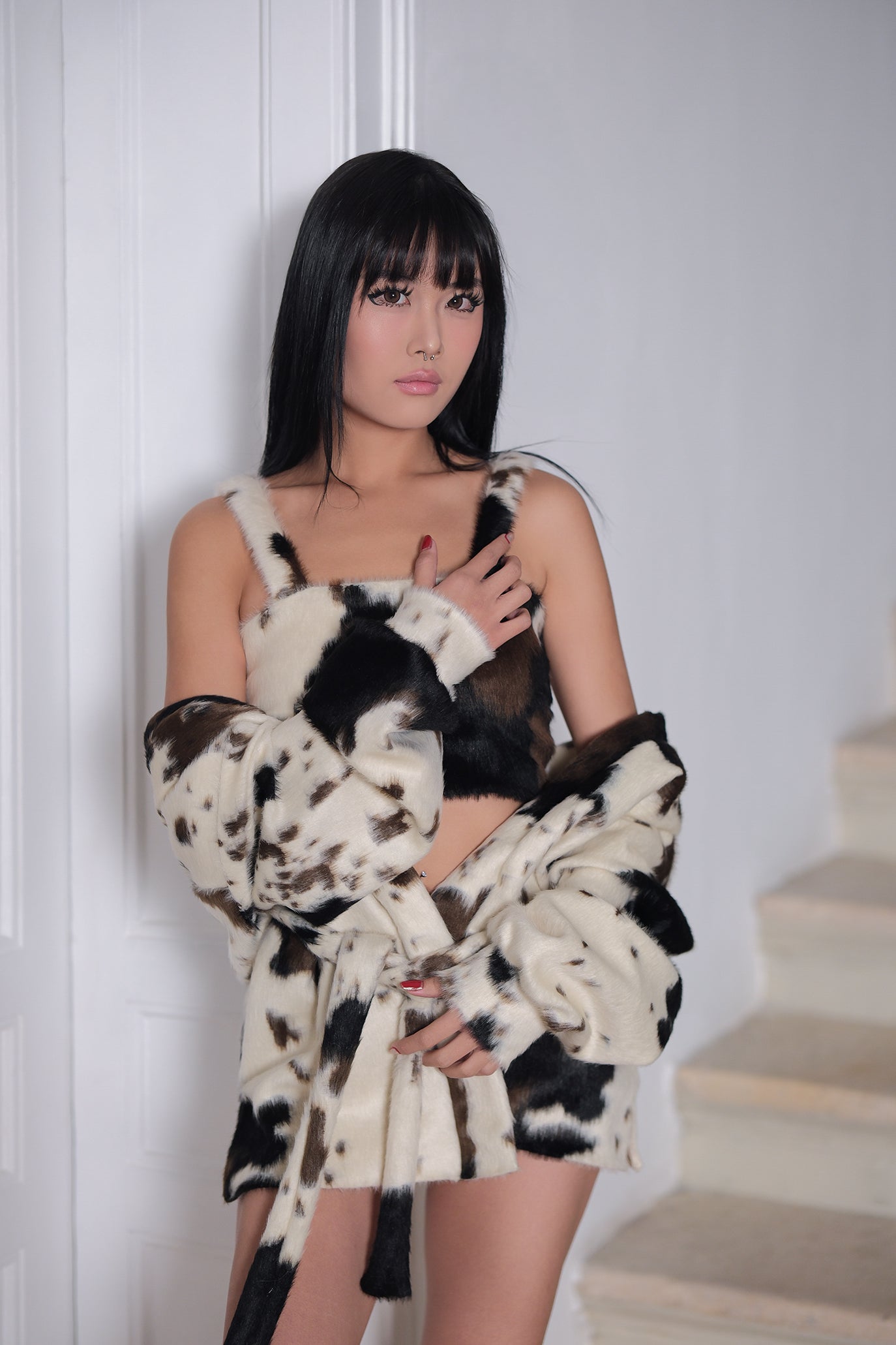 Дързък и стилен сет от топ и пола, от луксозен еко пух с ефектен animal принт. Полата е с прав силует, кройка тип "прегърни ме" с тик-так копчета и висока цепка, акцентира на фигурата. В комплект вървят къси панталонки за отдолу за максимален комфорт. Линията на бюстието е нежно оформена и създава изключителен женствен силует. Съчетайте този сет с жилетка от същата серия.