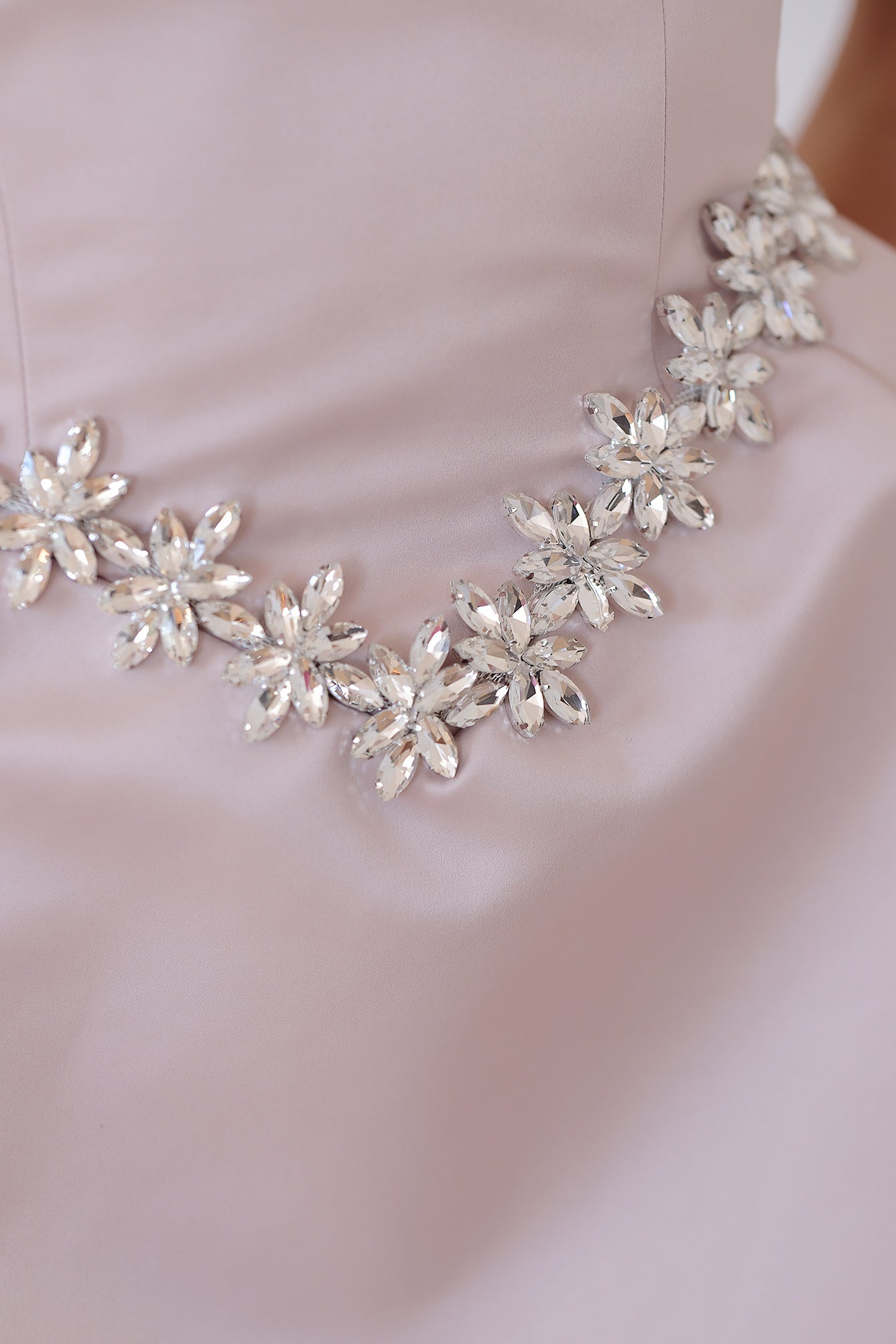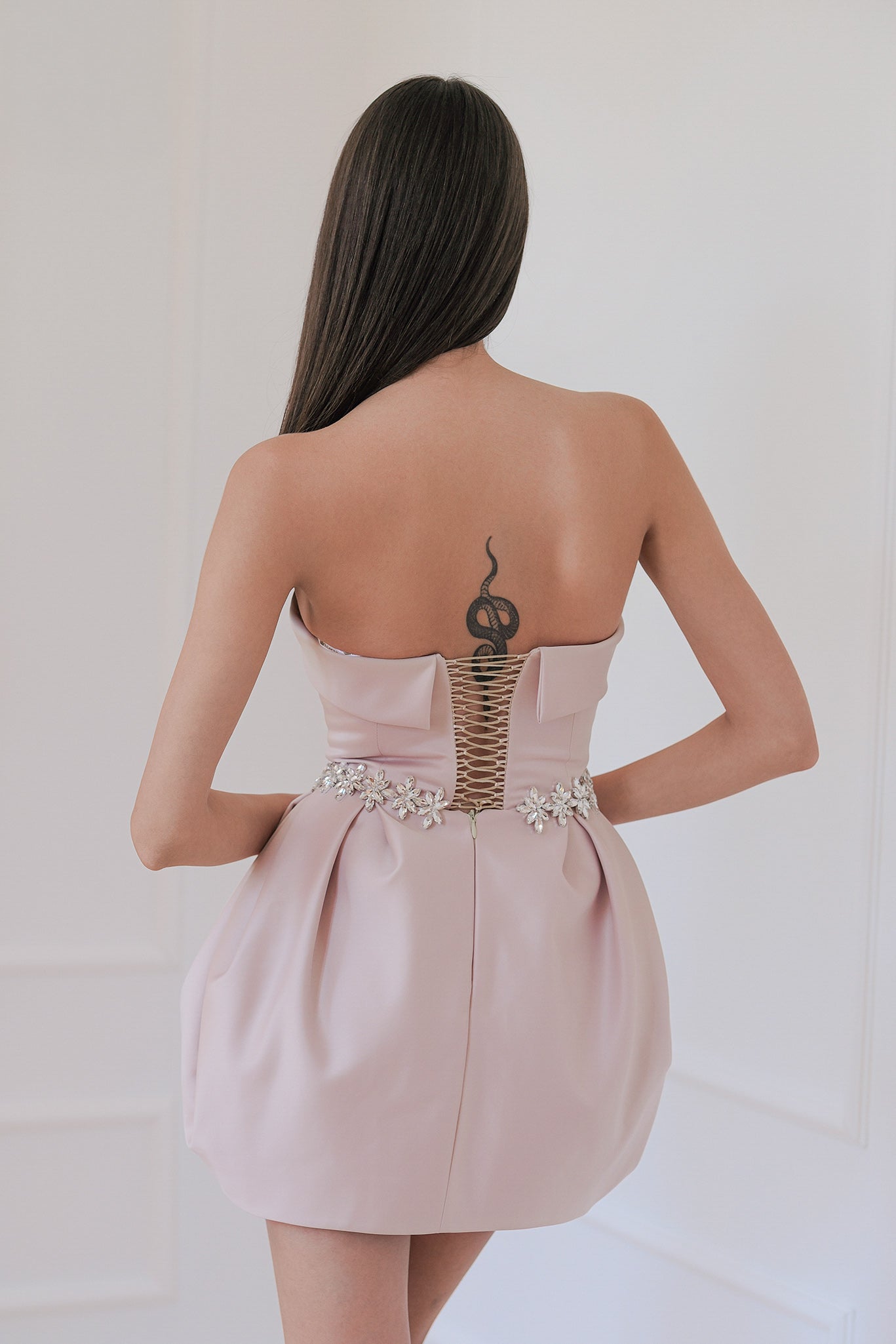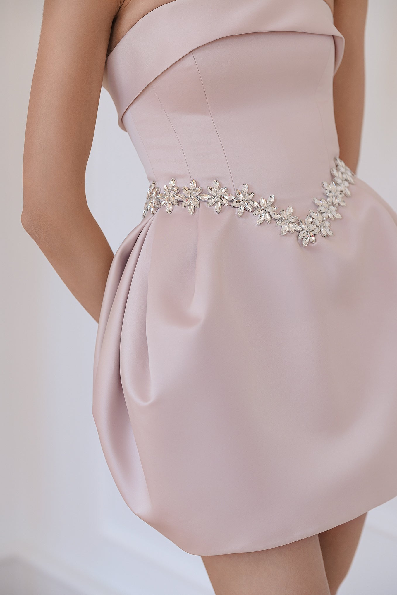Luxurious, completely handmade short dress with delicate details of a chain of sparkling zirconia crystals. The fabric is high-quality American thick satin, thanks to which the lower part holds its voluminous shape. The dress is strapless, with built-in cups. It fastens with laces at the back. It can be made according to the customer's measurements for an additional fee.
