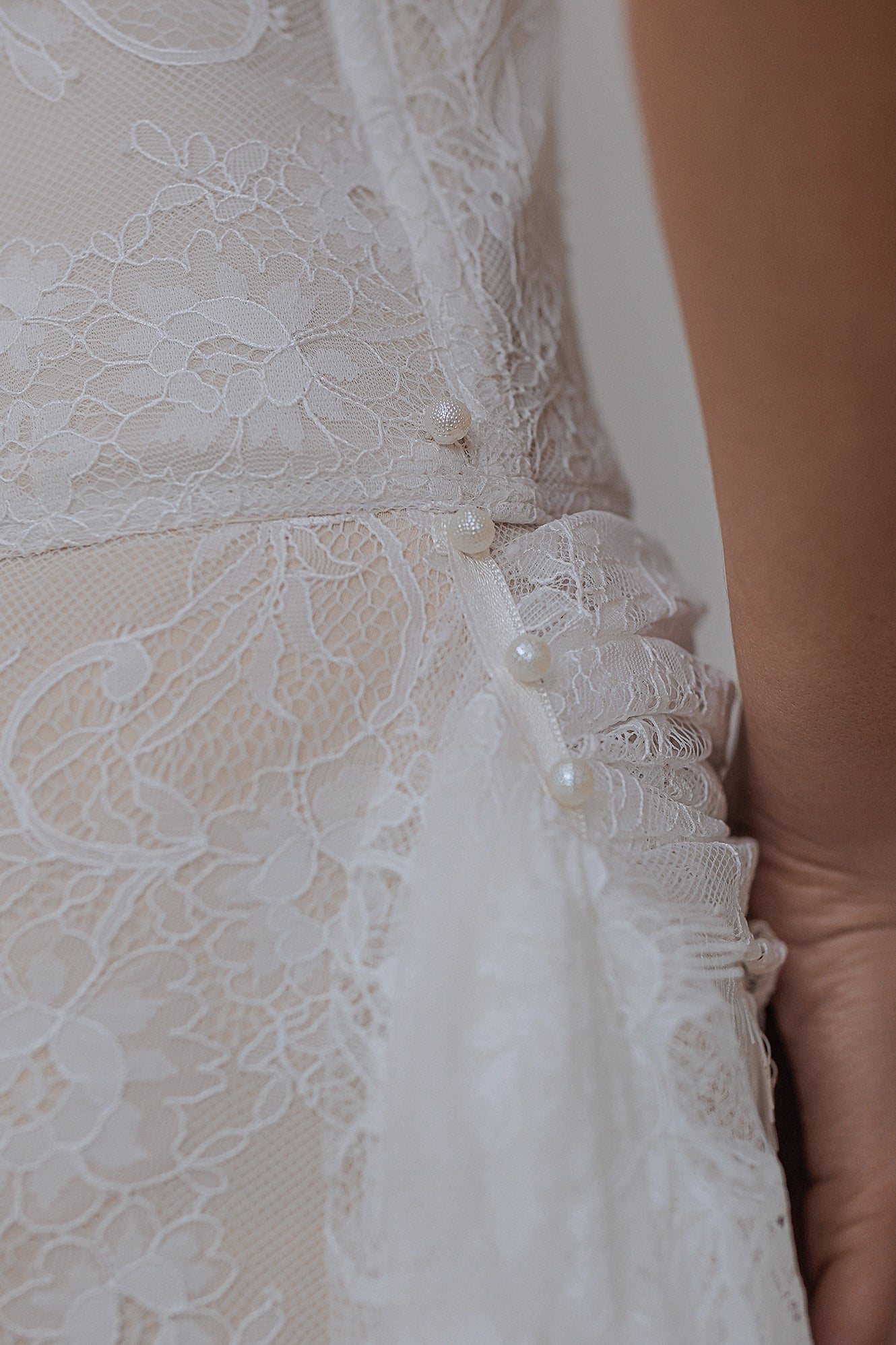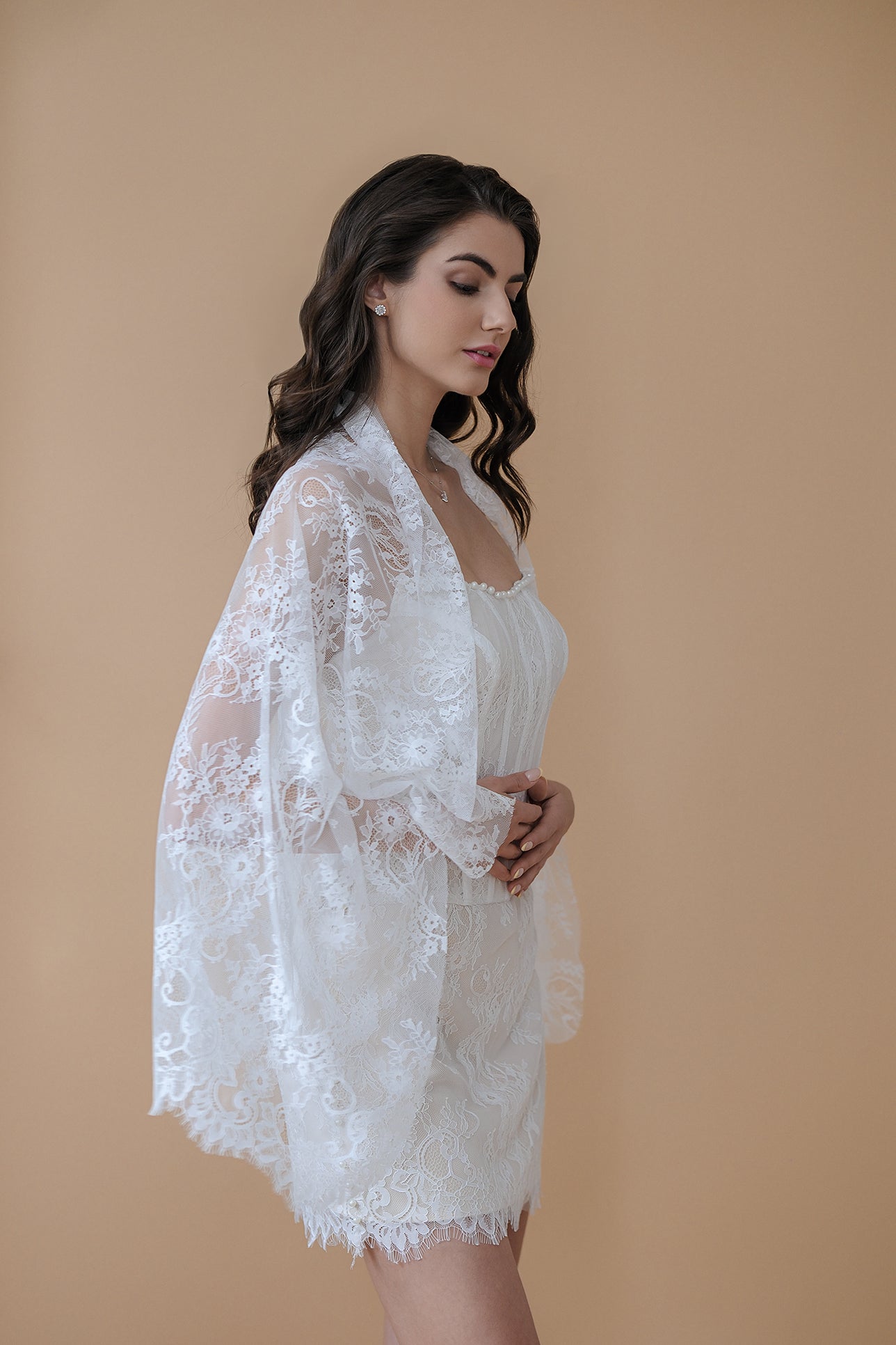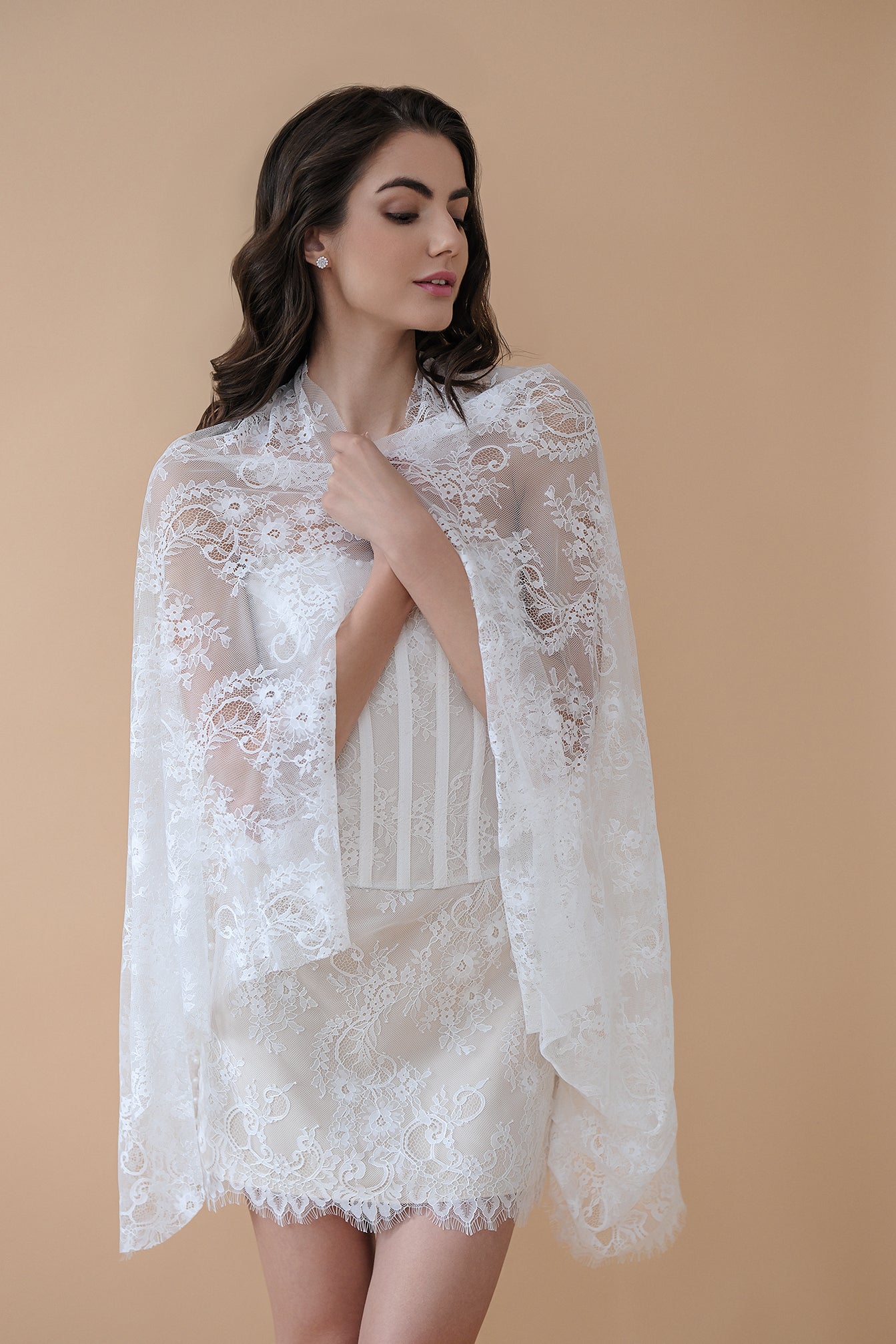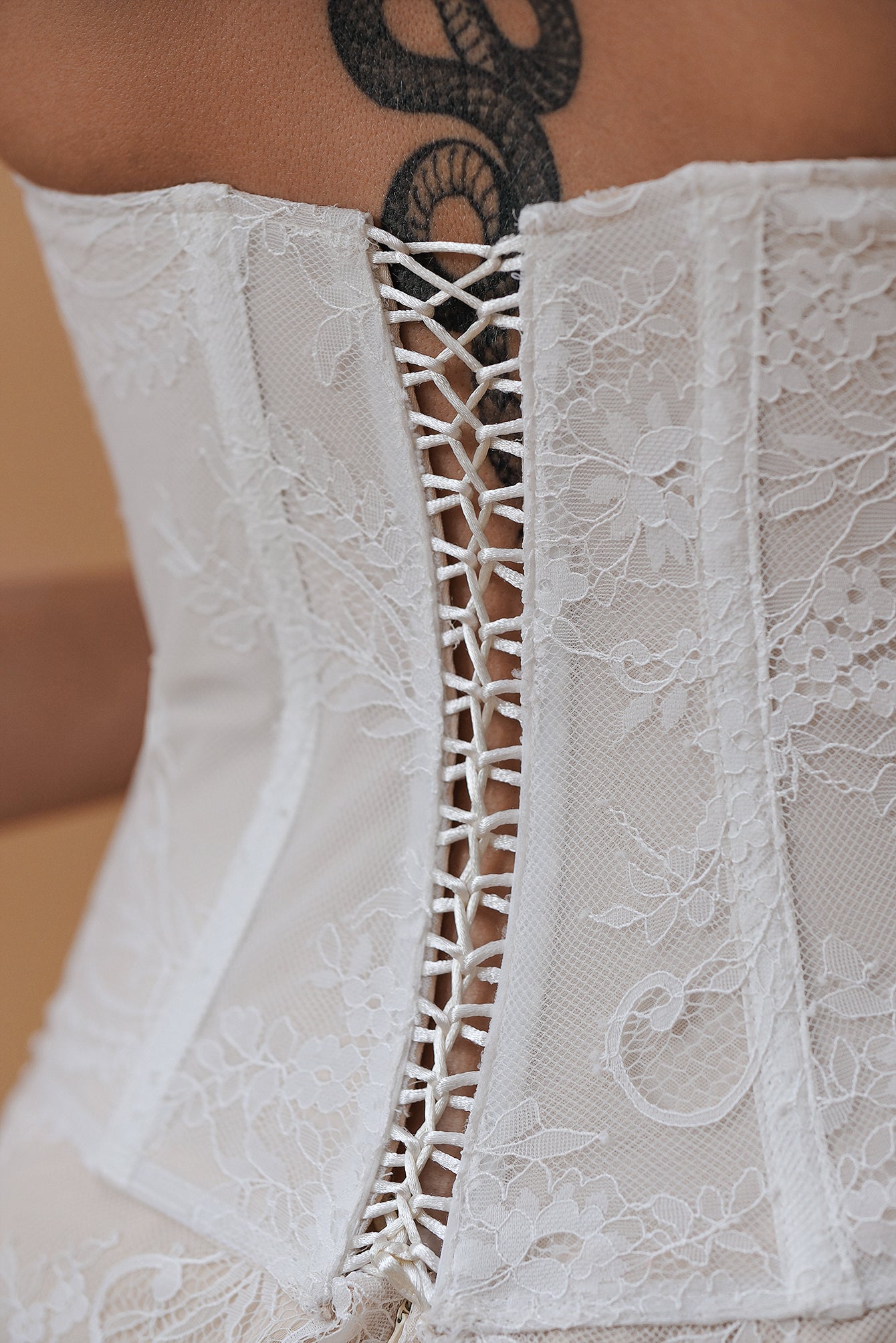 Luxurious corset dress, made of soft satin, fine lace and beautiful pearl details that emphasize the waist and add sophistication. The upper part of the dress is corset, with delicate transparent elements. The long lace train brings elegance as it descends down the body. It can be removed and the dress can be worn in several different ways: without a train, with a train or as a shawl. The dress is extremely suitable for a second bridal dress, for signing or for christening.