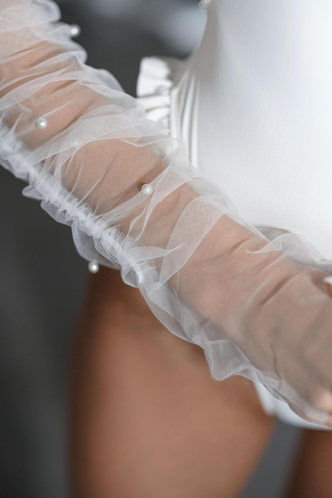Delicate transparent white seal gloves, decorated with white pearls. The length is just above the elbow. Comfortable to wear, they add tenderness and a slight mystery to your look.