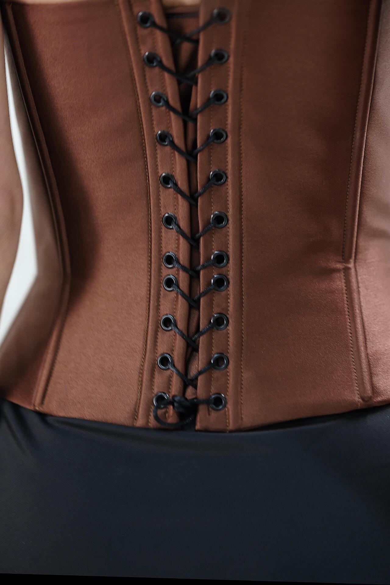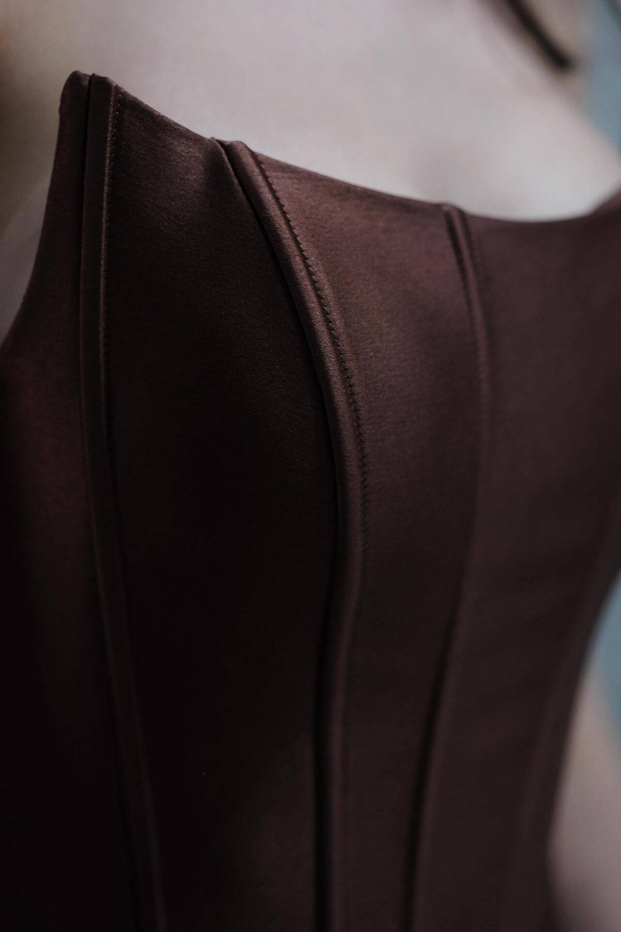Part of the PREMIUM collection of corsets that are handmade. Thick, made of high-quality materials - thick satin. It holds the bust well and is tied with ties located at the back. The corset is created with precise vertical underwires, which not only emphasize the waist, but also provide exceptional comfort and support. The strapless design and clean neckline give a modern and minimalist look, ideal for stylish and confident women. It can also be made according to your measurements, which takes about a month for an additional fee of 15% of the price. It can be hand washed or dry cleaned.
