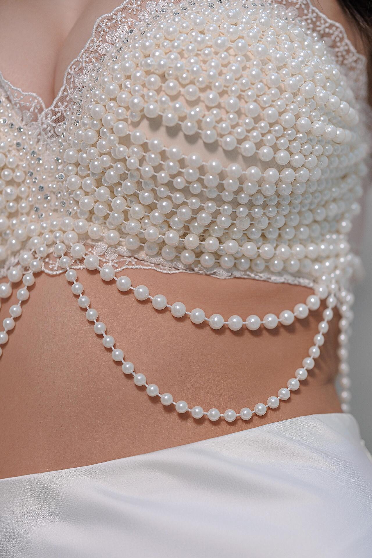 Bold and elegant, this pearl top adds an unforgettable accent to your look. With exquisitely crafted pearl details, it is a perfect choice for those who like to make bold fashion decisions. It can be combined with various bottoms, such as a skirt, for a sophisticated yet bold style.